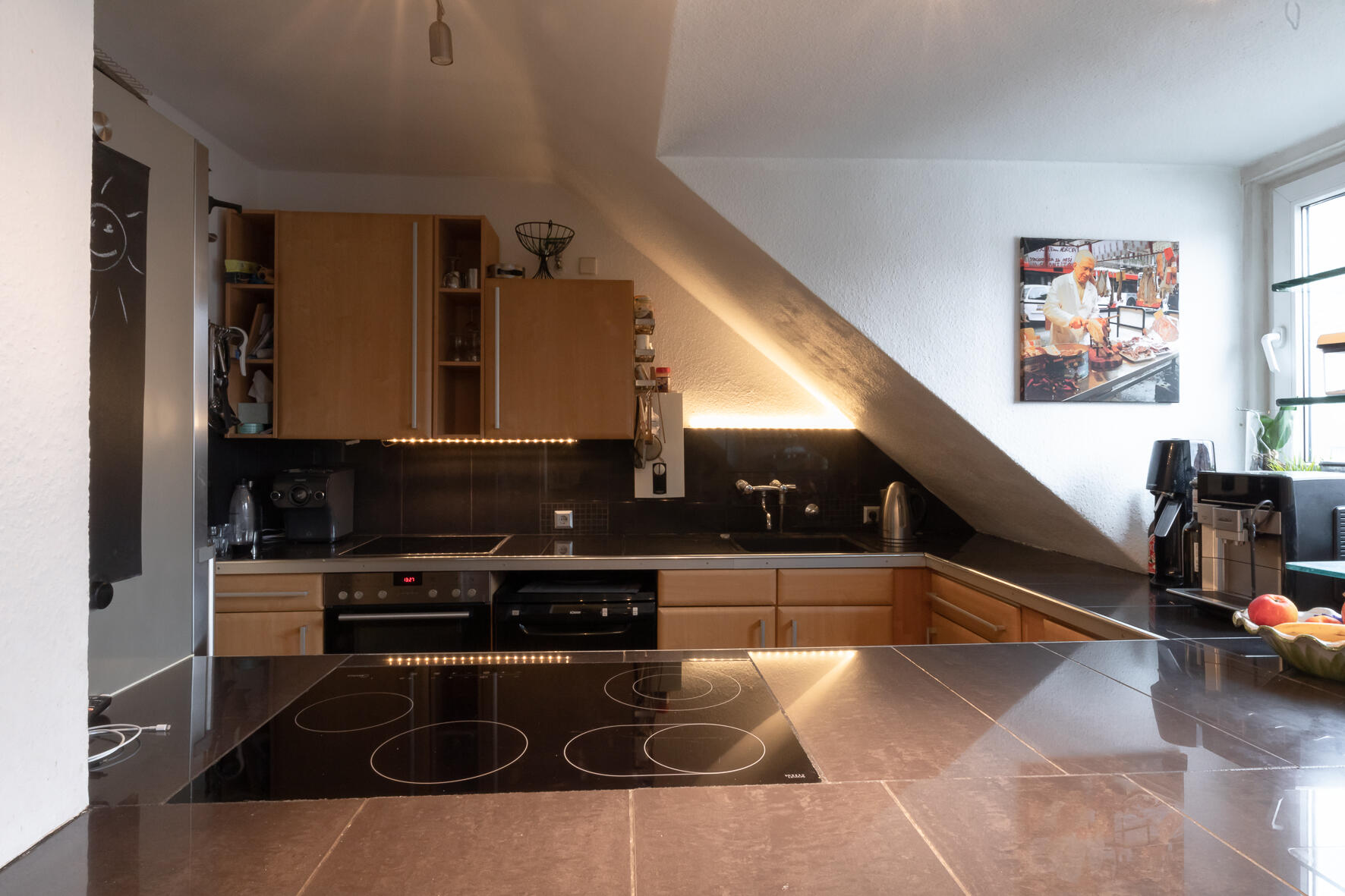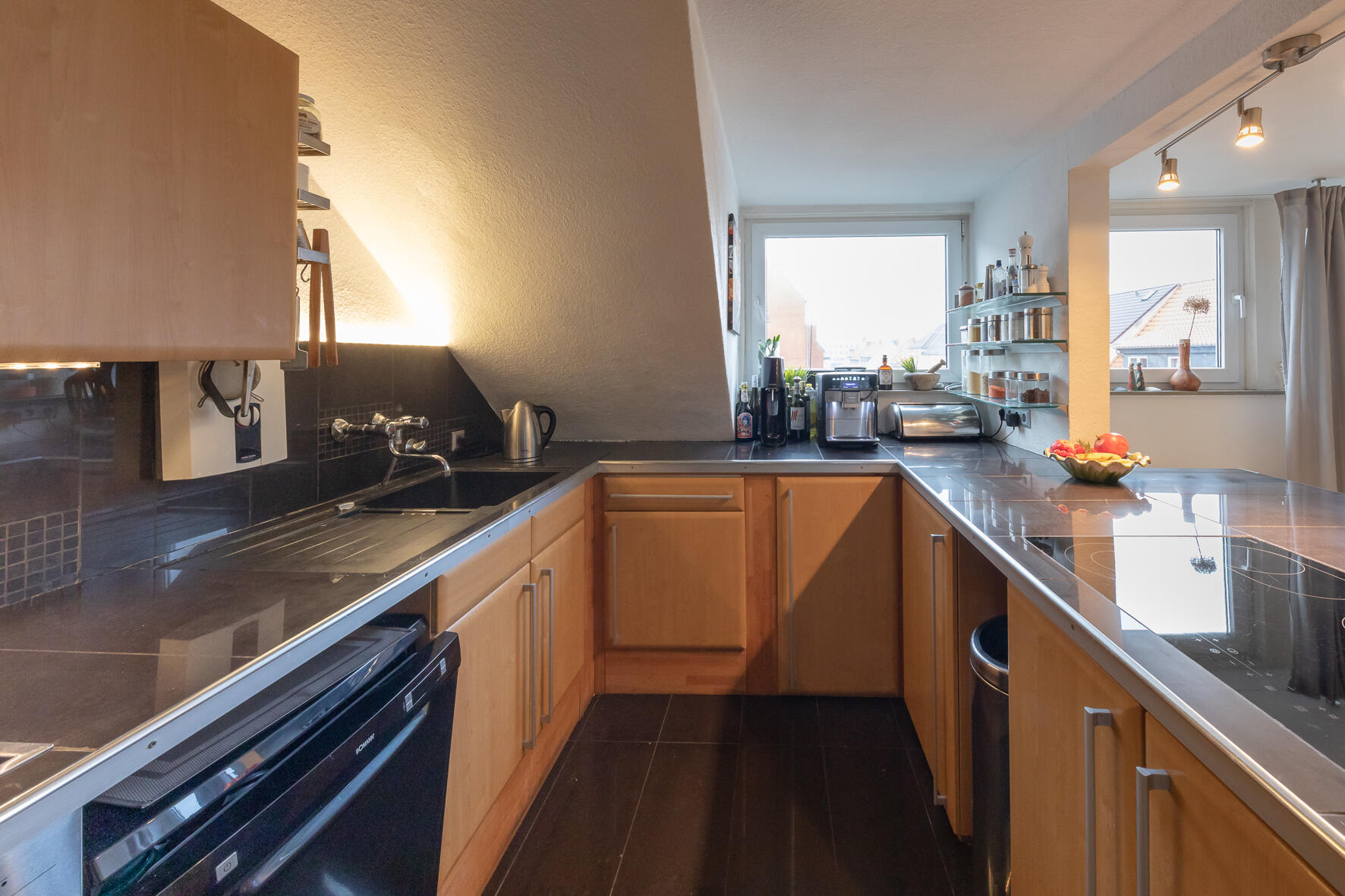 - Küche (4. OG)Fläche: 10 m²Länge: 4 mBreite: 2,5 mHöhe: 2,47 mmöbliert: ja