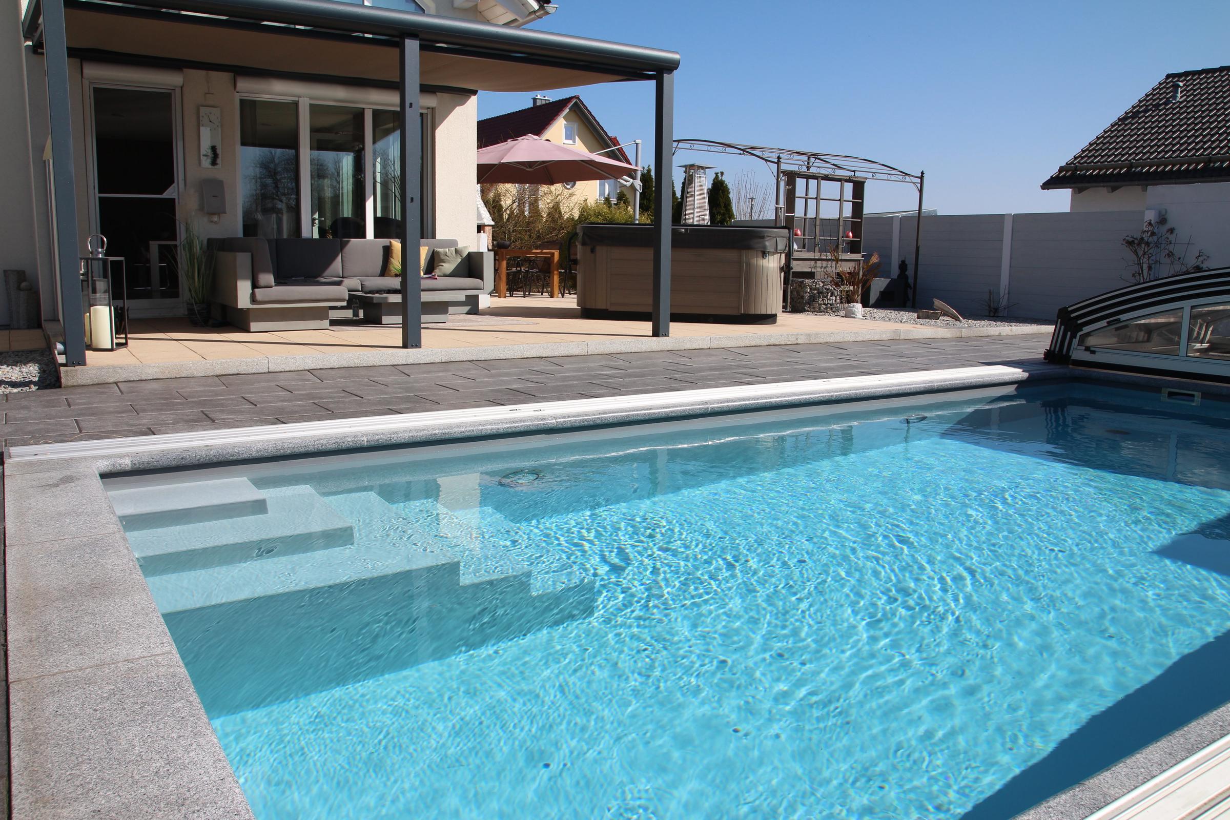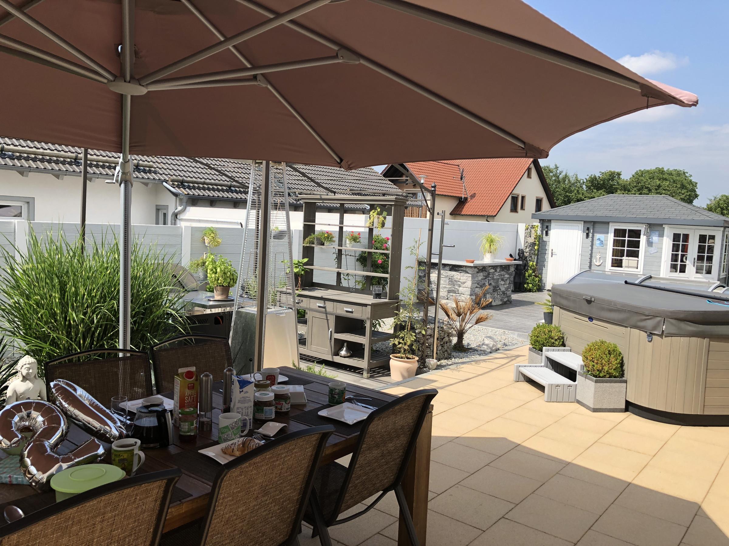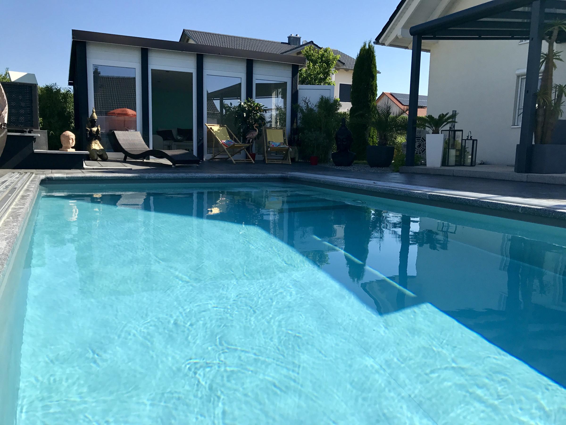 Der großzügige Außenbereich beinhaltet einen Swimmingpool mit den Maßen 7x3 m, mit LED-Farblicht und Gegenstromanlage. Vom Poolhaus hat man einen weiten Blick auf die Pool-Landschaft, die nach Süd-Westen ausgerichtet ist. Auf der großen Terrasse befindet sich ein Jacuzzi/Whirlpool von Villeroy & Boch für 4 Personen, eine Granitsteinbar und eine fest installierte Betonlounge unter der Terrassenüberdachung samt Kamin zum Wärmen im Winter oder für laue Sommernächte. Die mit einem Segel überdachte Außenküche mit Wasseranschluss liegt neben der Feuerstelle, die mit Gartenmöbeln ausgestattet ist. Im Gartenhaus befindet sich eine integrierte Sauna, daran anschließend ein Dusch- und WC-Häuschen. Im Süden befindet sich eine Rasenfläche. Nach Regensburg beträgt die Entfernung ca. 30 km.