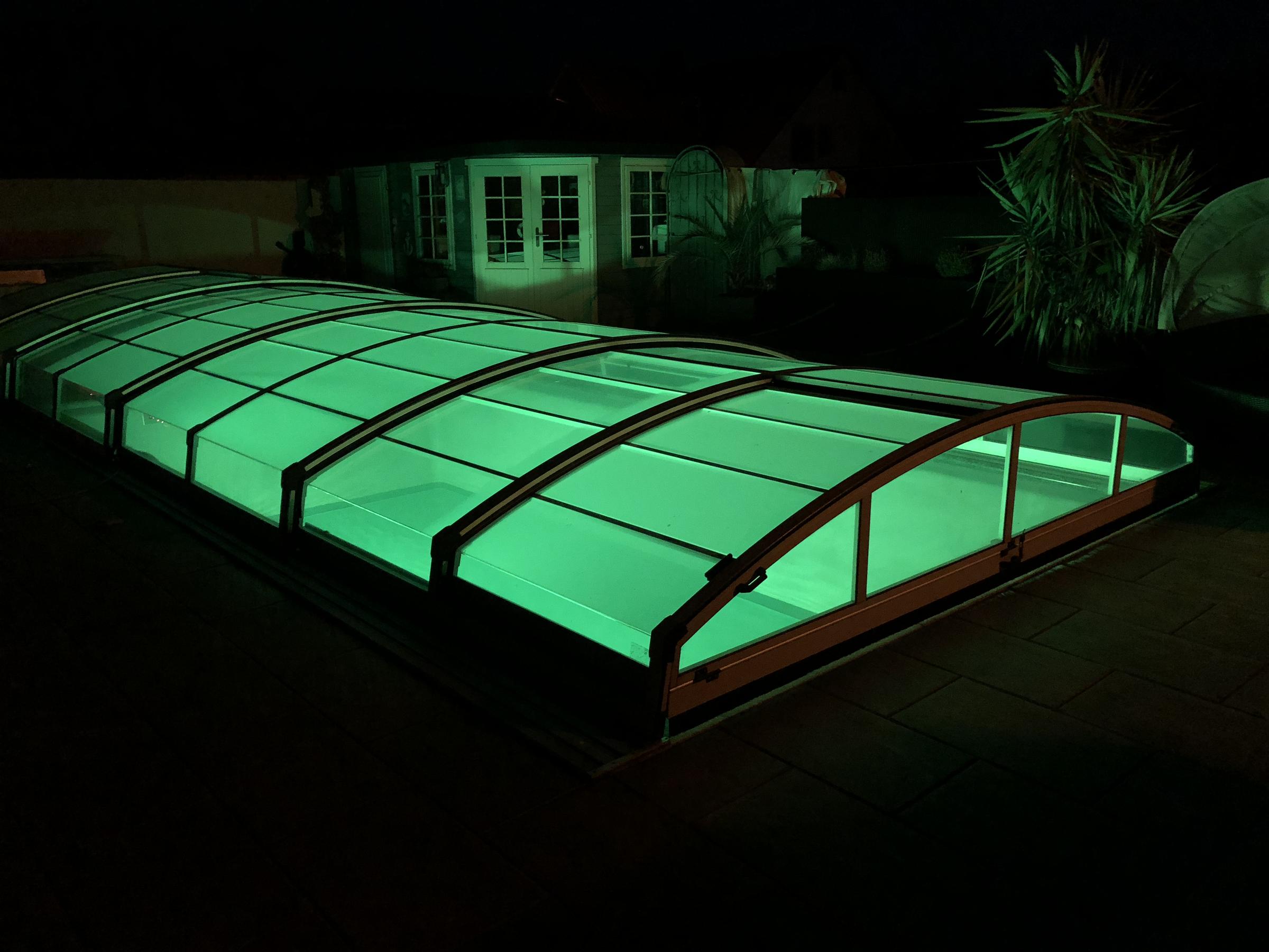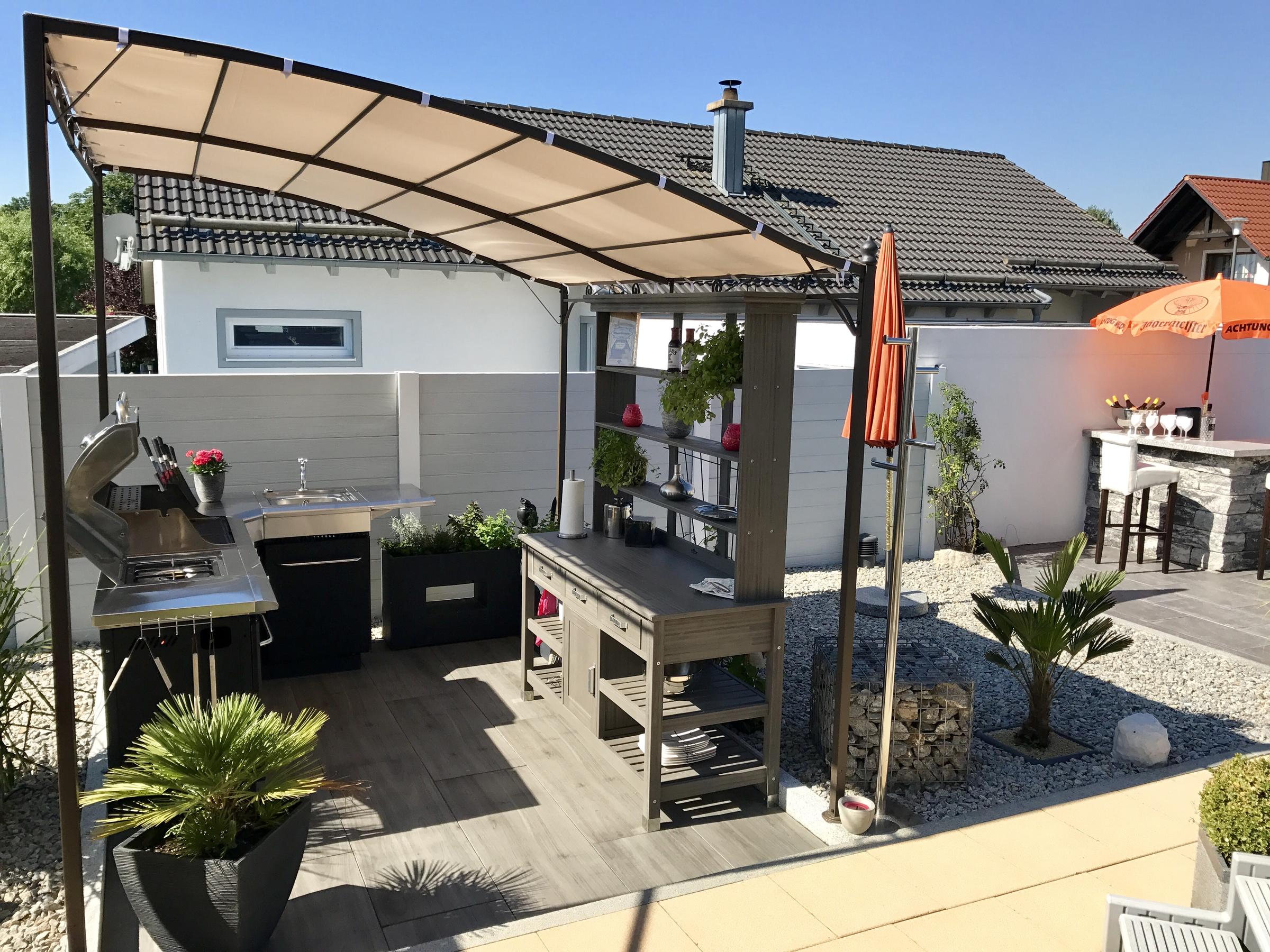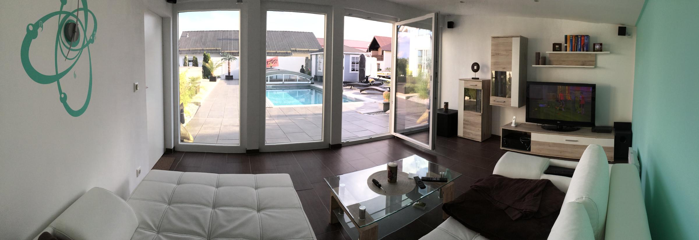 Der großzügige Außenbereich beinhaltet einen Swimmingpool mit den Maßen 7x3 m, mit LED-Farblicht und Gegenstromanlage. Vom Poolhaus hat man einen weiten Blick auf die Pool-Landschaft, die nach Süd-Westen ausgerichtet ist. Auf der großen Terrasse befindet sich ein Jacuzzi/Whirlpool von Villeroy & Boch für 4 Personen, eine Granitsteinbar und eine fest installierte Betonlounge unter der Terrassenüberdachung samt Kamin zum Wärmen im Winter oder für laue Sommernächte. Die mit einem Segel überdachte Außenküche mit Wasseranschluss liegt neben der Feuerstelle, die mit Gartenmöbeln ausgestattet ist. Im Gartenhaus befindet sich eine integrierte Sauna, daran anschließend ein Dusch- und WC-Häuschen. Im Süden befindet sich eine Rasenfläche. Nach Regensburg beträgt die Entfernung ca. 30 km.