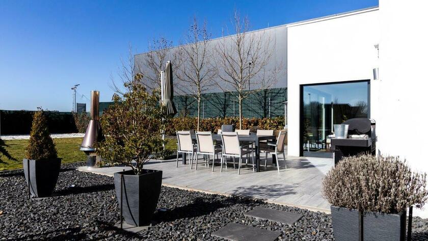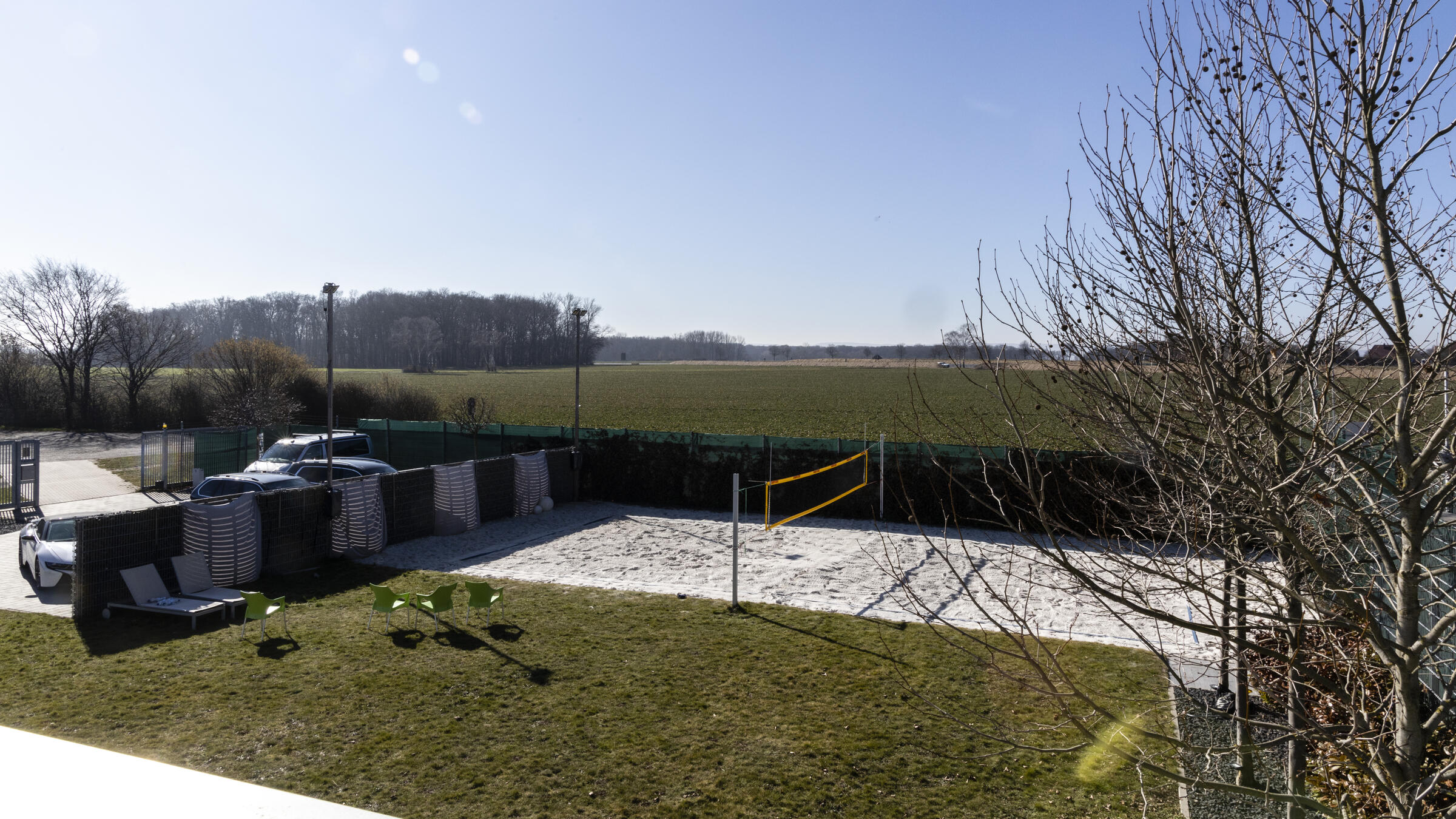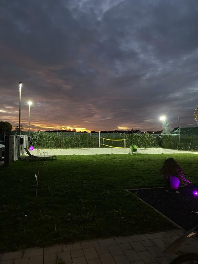 Im Außenbereich der Villa gibt es ein eigenes Beachvolleyballfeld mit 120 t weißem Quarzsand und Flutlichtanlage. Das 1700 m² große Grundstück ist ebenerdig und uneinsehbar und befindet sich am Rand eines Gewerbegebietes ohne Nachbarn. Für Produktionen stehen auf dem Grundstück 7 Parkplätze zur Verfügung. Auch Lkw können das Grundstück befahren. Die Villa befindet sich ca. 300 m Luftlinie von der Bundesstraße B3.