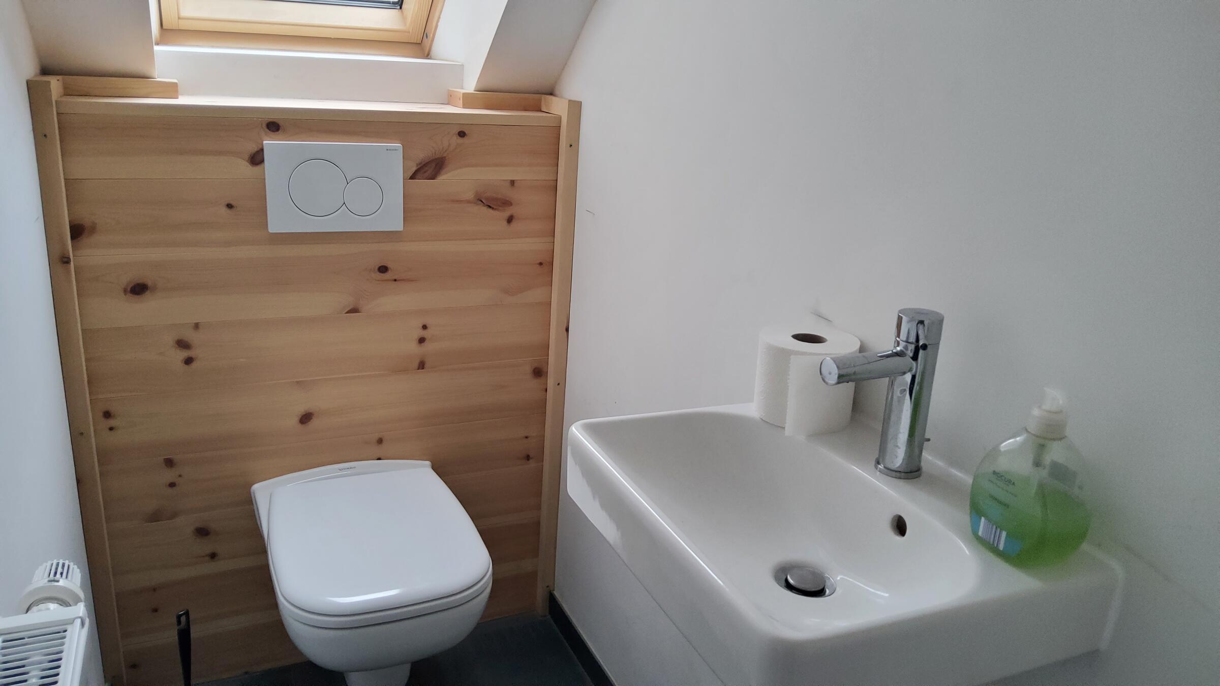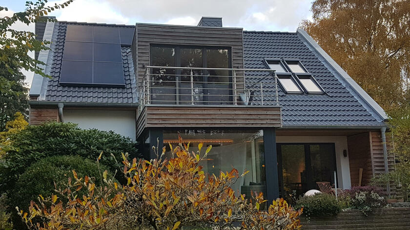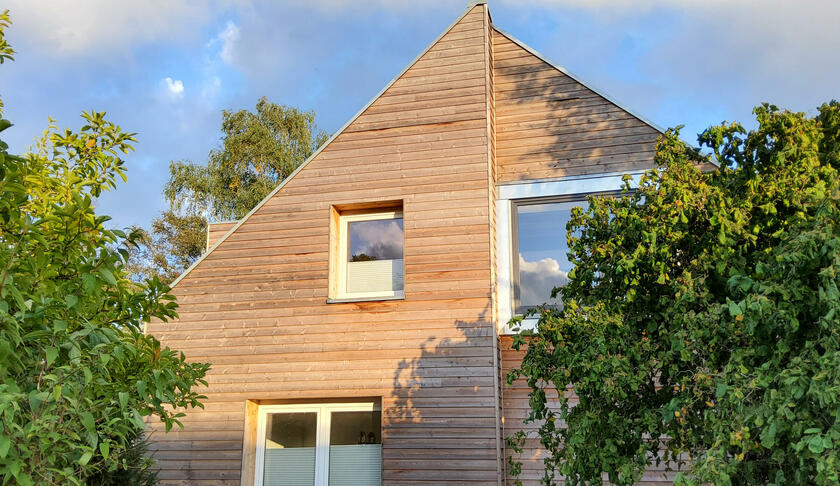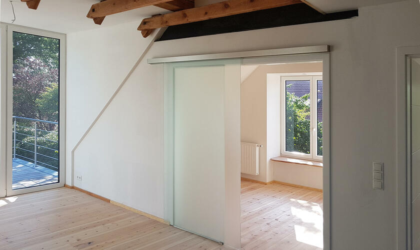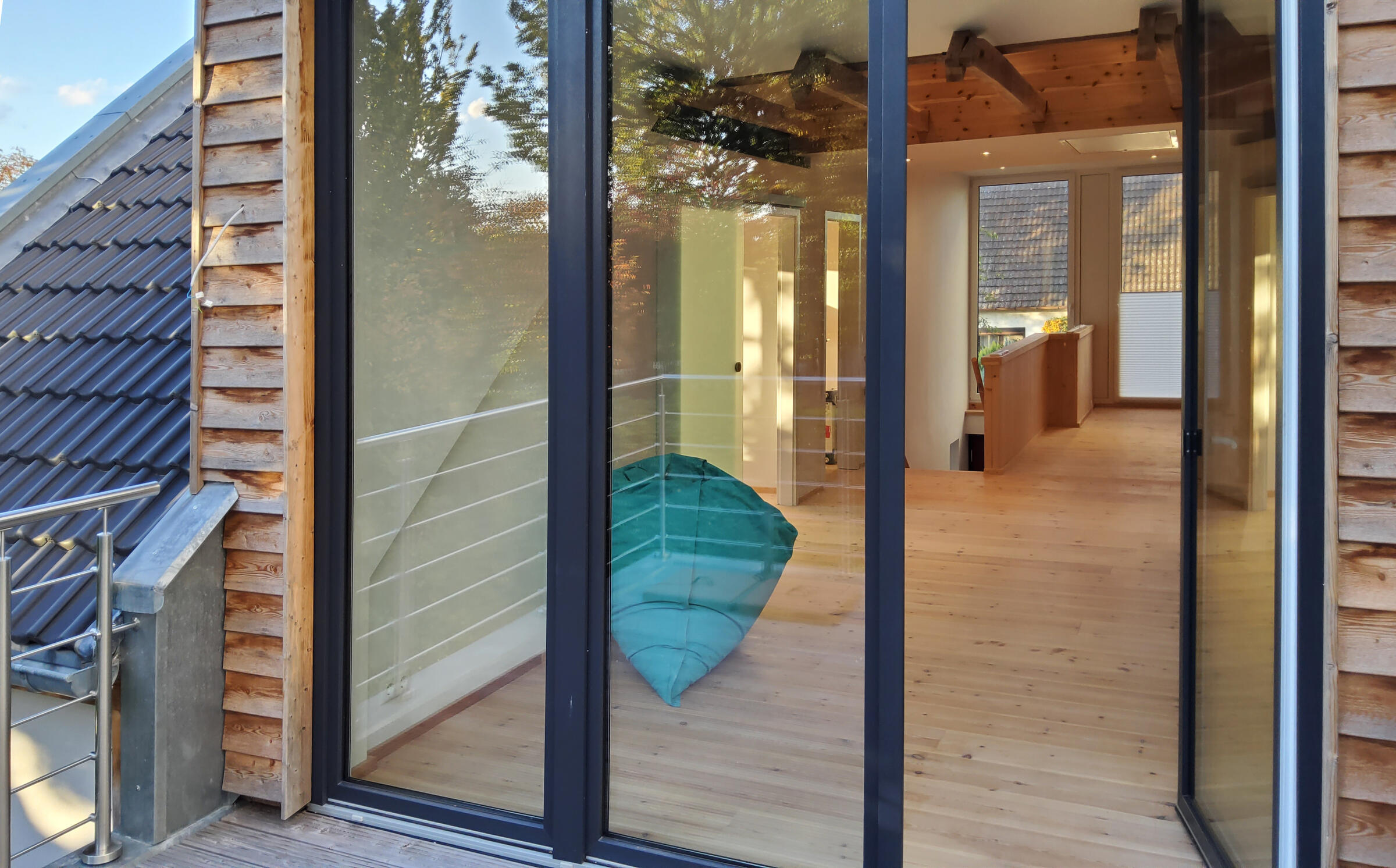Das Haus wurde 1966 erbaut und 2019-2020 zeitgemäß saniert. Um das anspruchsvolle flexible Raumprogramm zu realisieren, setzte die Architektin auf modulare Einschübe in Holzbauweise. Der Einschub auf der Südseite bietet einen Wintergarten für die Wohnung im Erdgeschoss, dessen Decke die großzügige Dachterrasse der Gaube im ersten Obergeschoss bildet. Auf der Nordseite markiert ein weiterer Holzquader den neuen markanten Eingangsbereich mit den Außentüren der beiden Wohnungen. Bevor man die geradläufige massive Holztreppe ins Obergeschoss betritt, passiert man eine optionale Verbindung zur Wohnung im Erdgeschoss. Das Treppenhaus besticht durch eine Raumhöhe von fünf Metern und bietet den Blick hinaus in den angrenzenden Eichenwald. Der von Holzwänden flankierte zentrale Wohn-, Koch- und Essbereich im Obergeschoss bietet dank großzügiger Fensterflächen Ausblicke in alle Himmelsrichtungen und gibt den Blick auf offene Dachsparren frei. Ein Sitzfenster erinnert an den ehemaligen West-Balkon. Im Erdgeschoss wurden zugunsten von mehr Transparenz und einer offenen Küche ebenfalls trennende Wände entfernt. Durch den gewachsenen Garten mit vielen alten Sträuchern und Büschen entsteht so in jeder der Wohnungen eine spannende Korrelation von innen und außen, geprägt durch die neuen Sichtachsen der eingeschobenen Module. Momentan wird die untere Wohnung von den Besitzern selbst genutzt und ist leicht möbliert. Die obere Wohnung steht leer und wird nur gelegentlich von Gästen genutzt.
