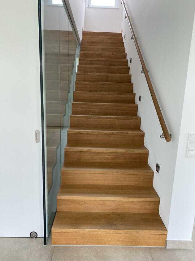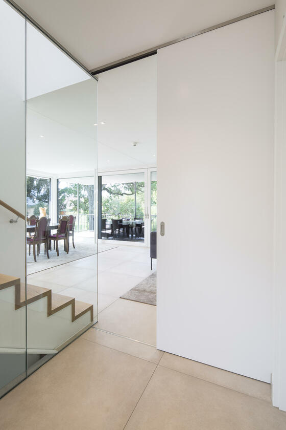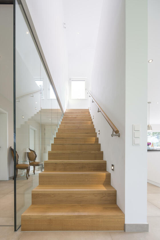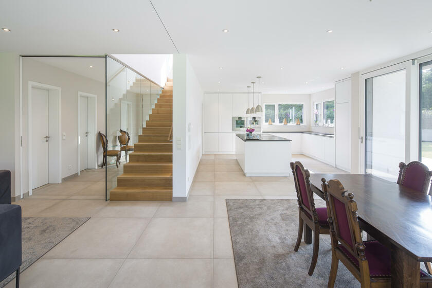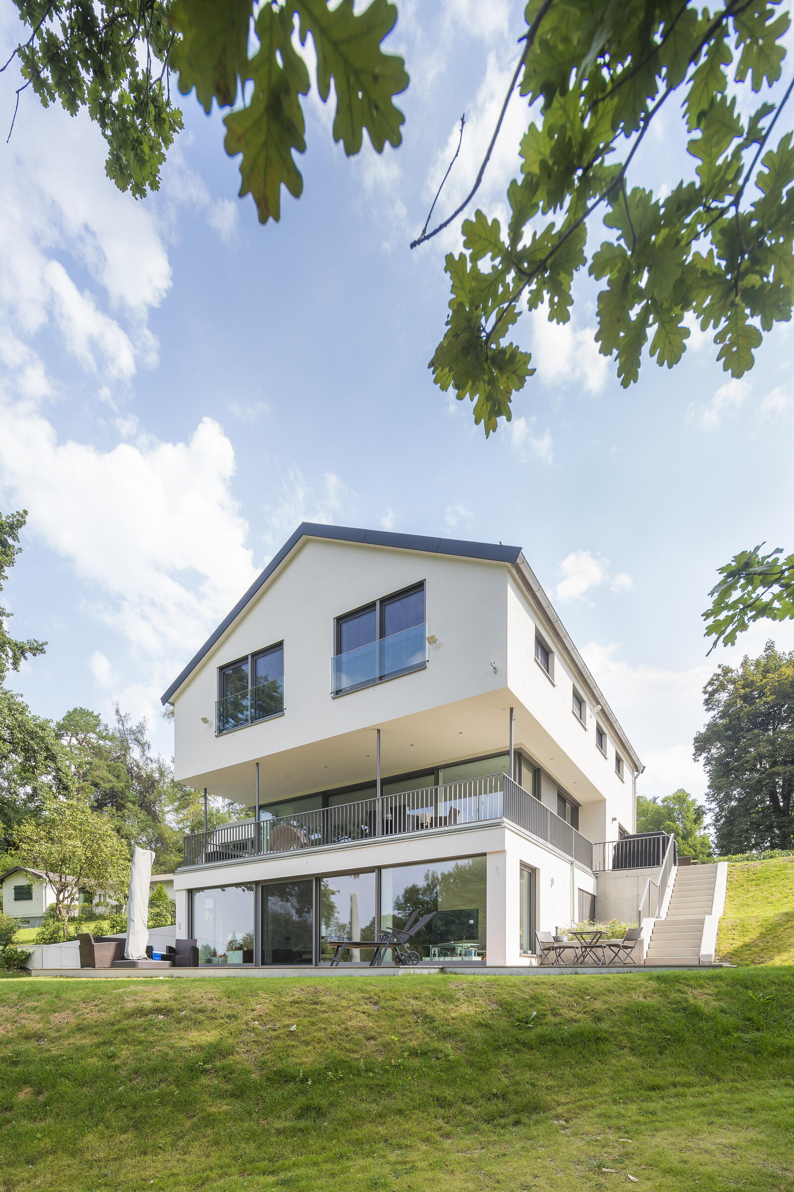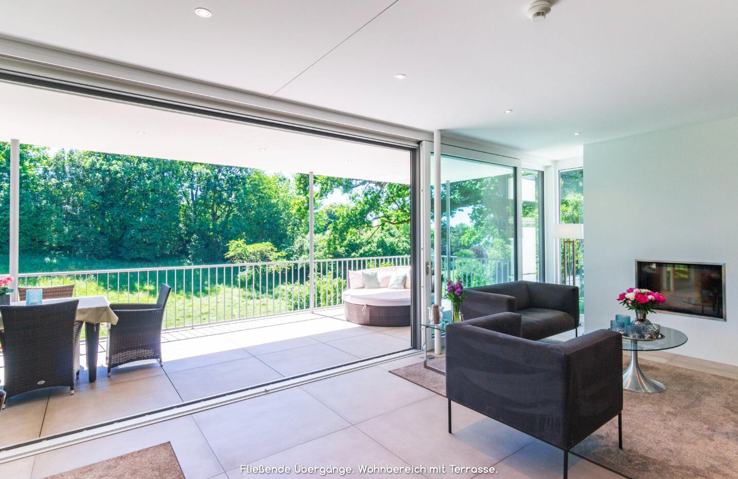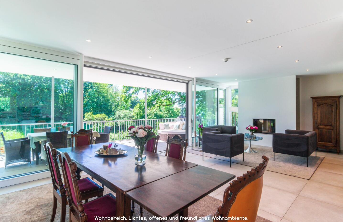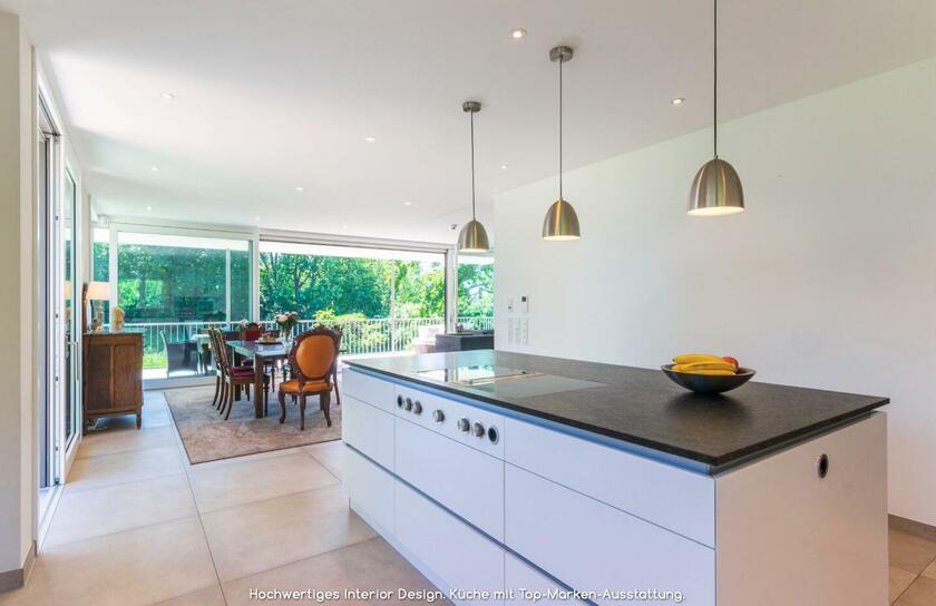 Die Architektenvilla wurde über mehrere Ebenen (Terrassen) harmonisch in die umgebende Landschaft - Wiesen, Garten, alter Baumbestand - eingebettet. Der Baukörper ist konsequent, mit seinen bodentiefen Glasfronten, nach Osten, Süden und Westen ausgerichtet. Ein lichtes, offenes, freundliches Wohnambiente. Sonne vom morgendlichen Sonnenaufgang bis zu (immer wieder) spektakulären Sonnenuntergängen am Abend.