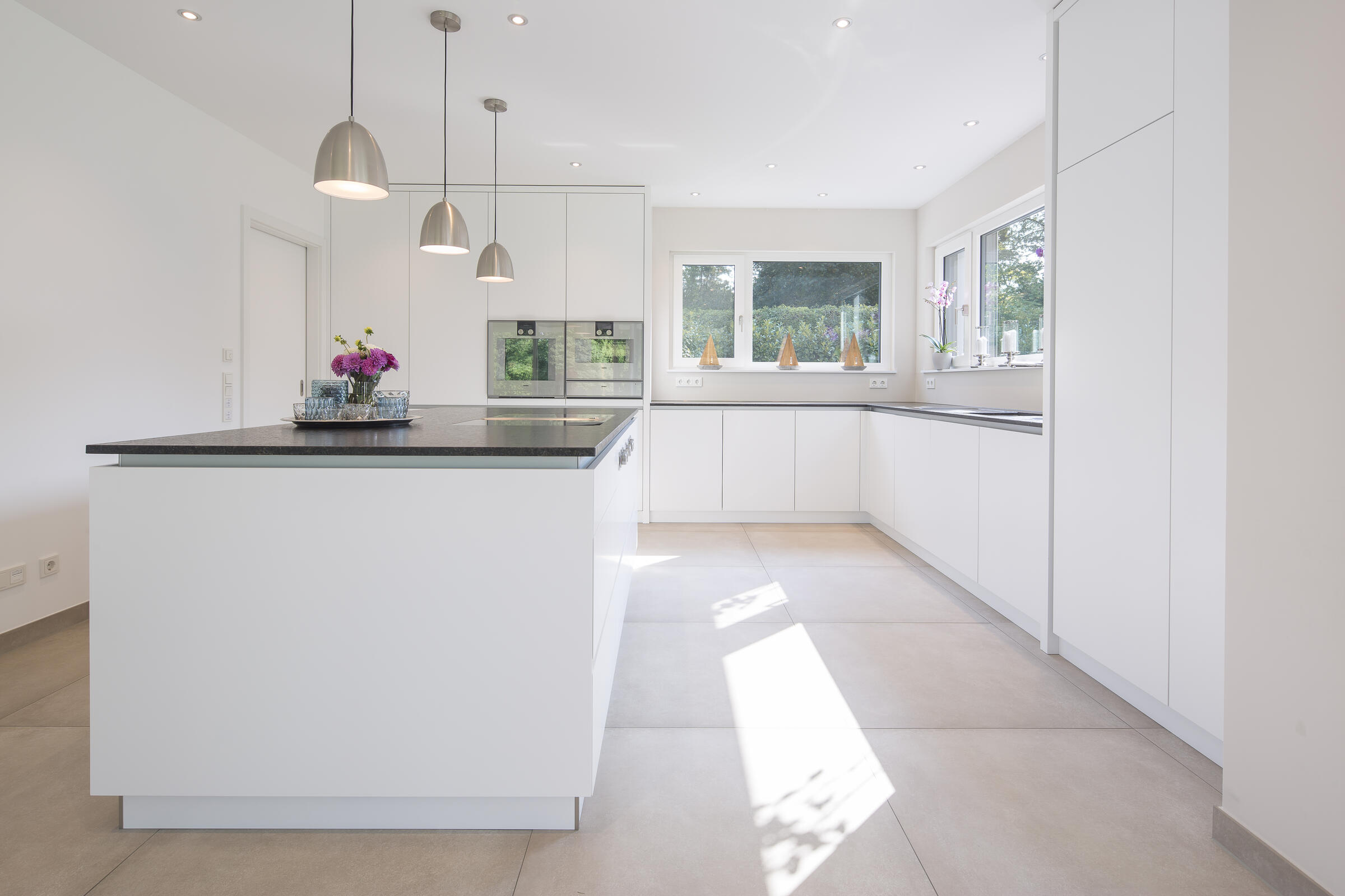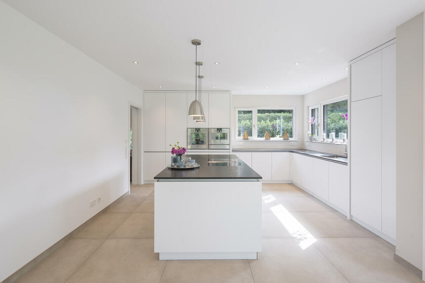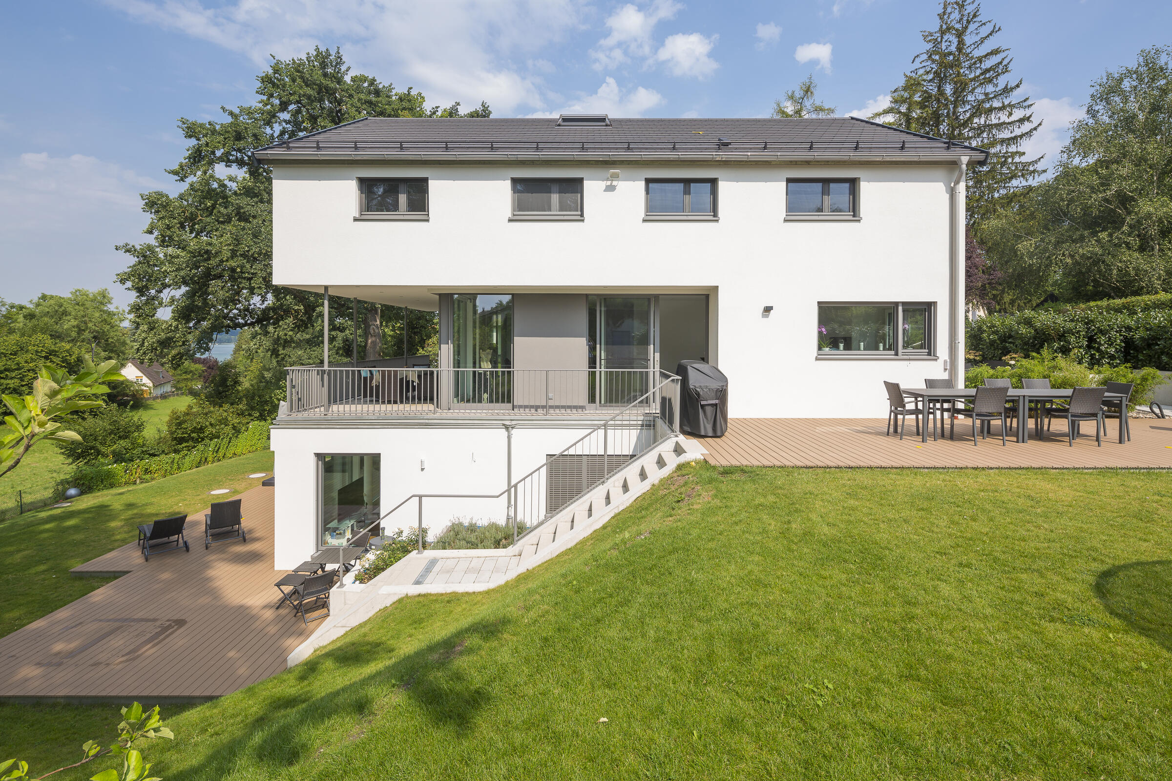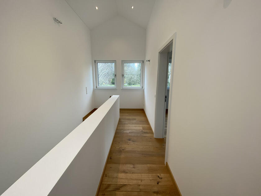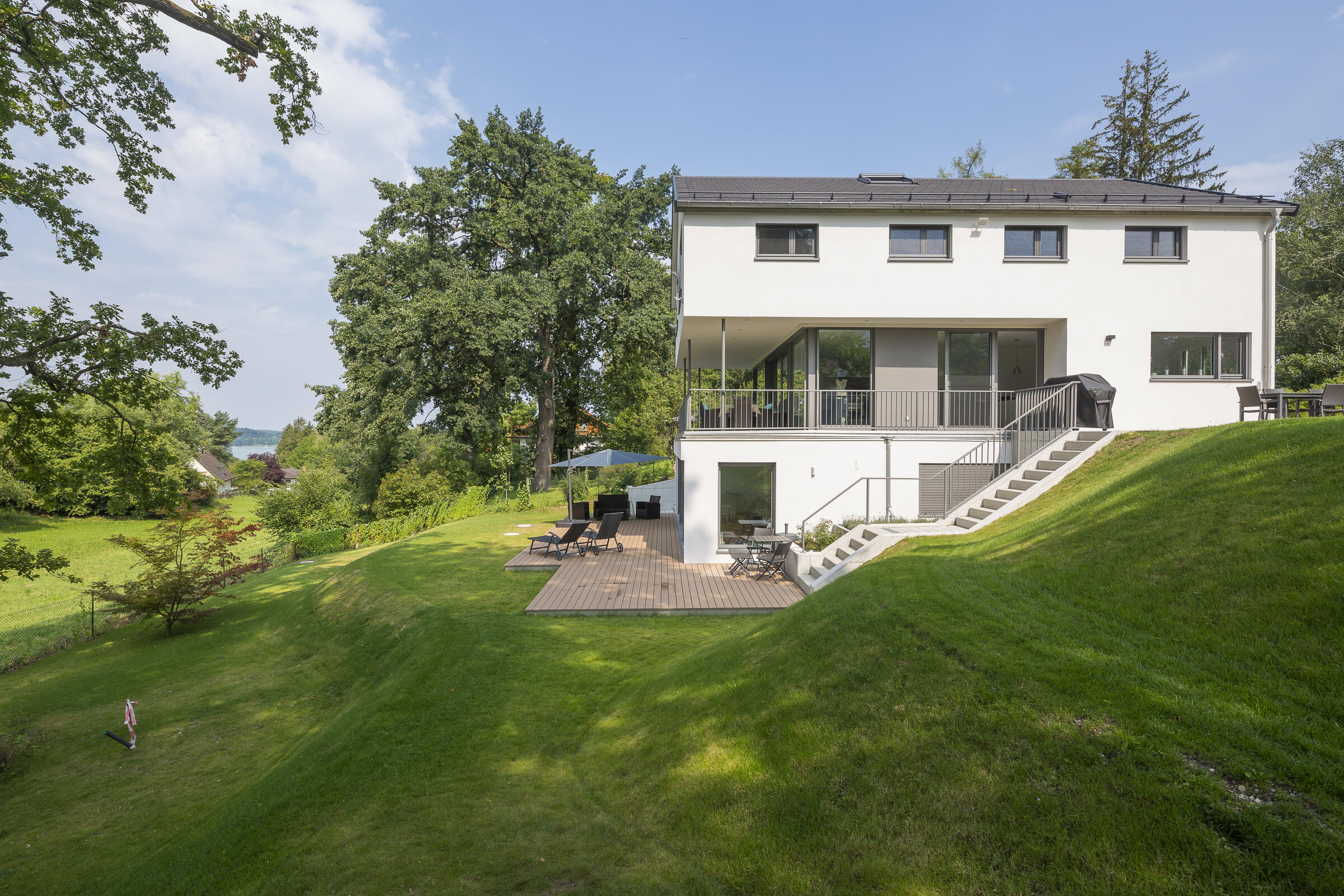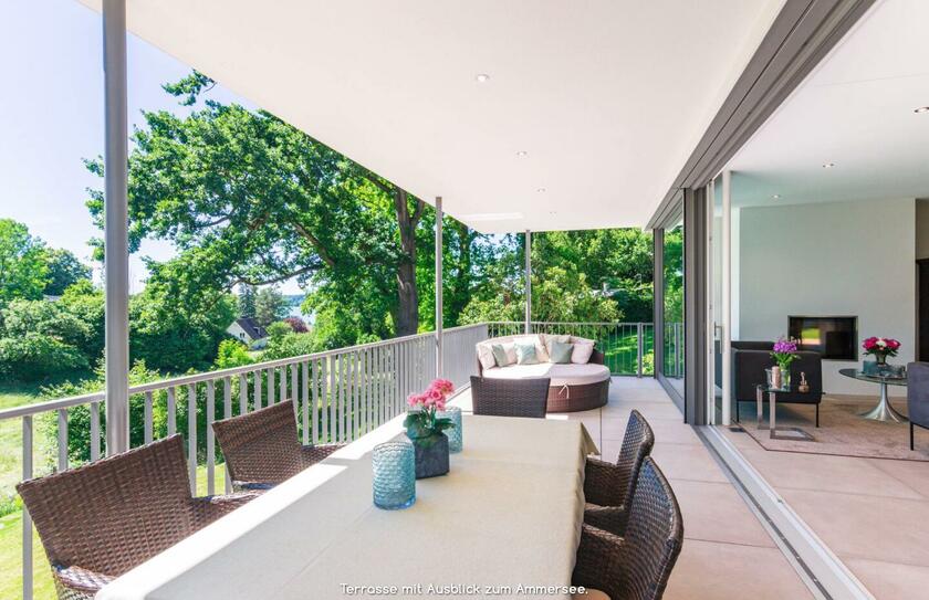 Auf einer leichten Anhöhe liegt - nach Westen mit unverbaubarem Blick auf den Ammersee - die moderne Neubauvilla. Das gesamte Gebäude besticht durch stilsicheres Interior Design, hochwertige Handwerksarbeiten und eleganten Wohnkomfort: Helle Eichenholz-Massivböden, italienische Fliesen, verglastes Treppenhaus mit handgehobelten (rutschfesten) Eichenholz-Stufen, offene Profiküche mit Kochinsel und Top-Marken-Geräten, zwei offene Kamine (EG und UG) und weitläufige (teilweise) überdachte Terrassen auf mehreren Ebenen. Alle Bäder sind bis ins kleinste Detail luxuriös und geschmackvoll ausgestattet: Rainshower-Duschen, hochwertige Fliesen, Armaturen, Waschbecken, Handbrausen und Handtuchwärmer. Das Elternbad (DG) hat eine in den Raum integrierte maßangefertigte Sauna.