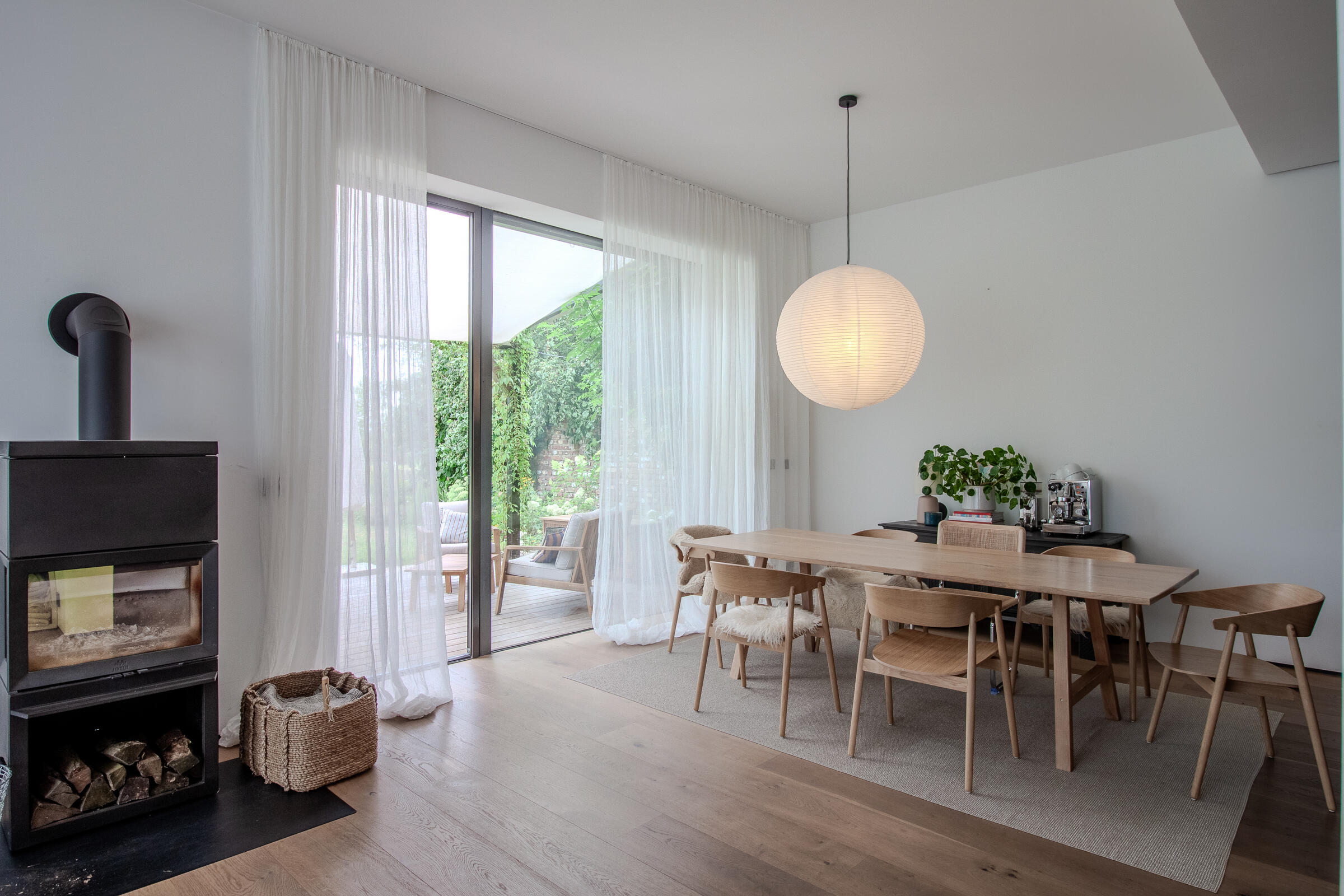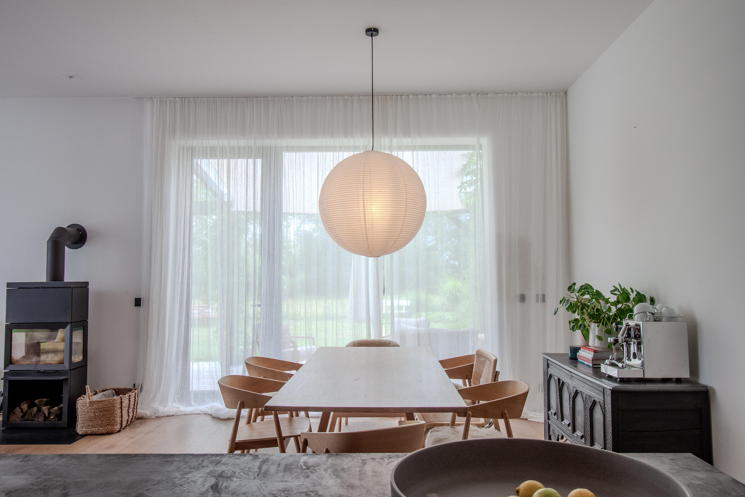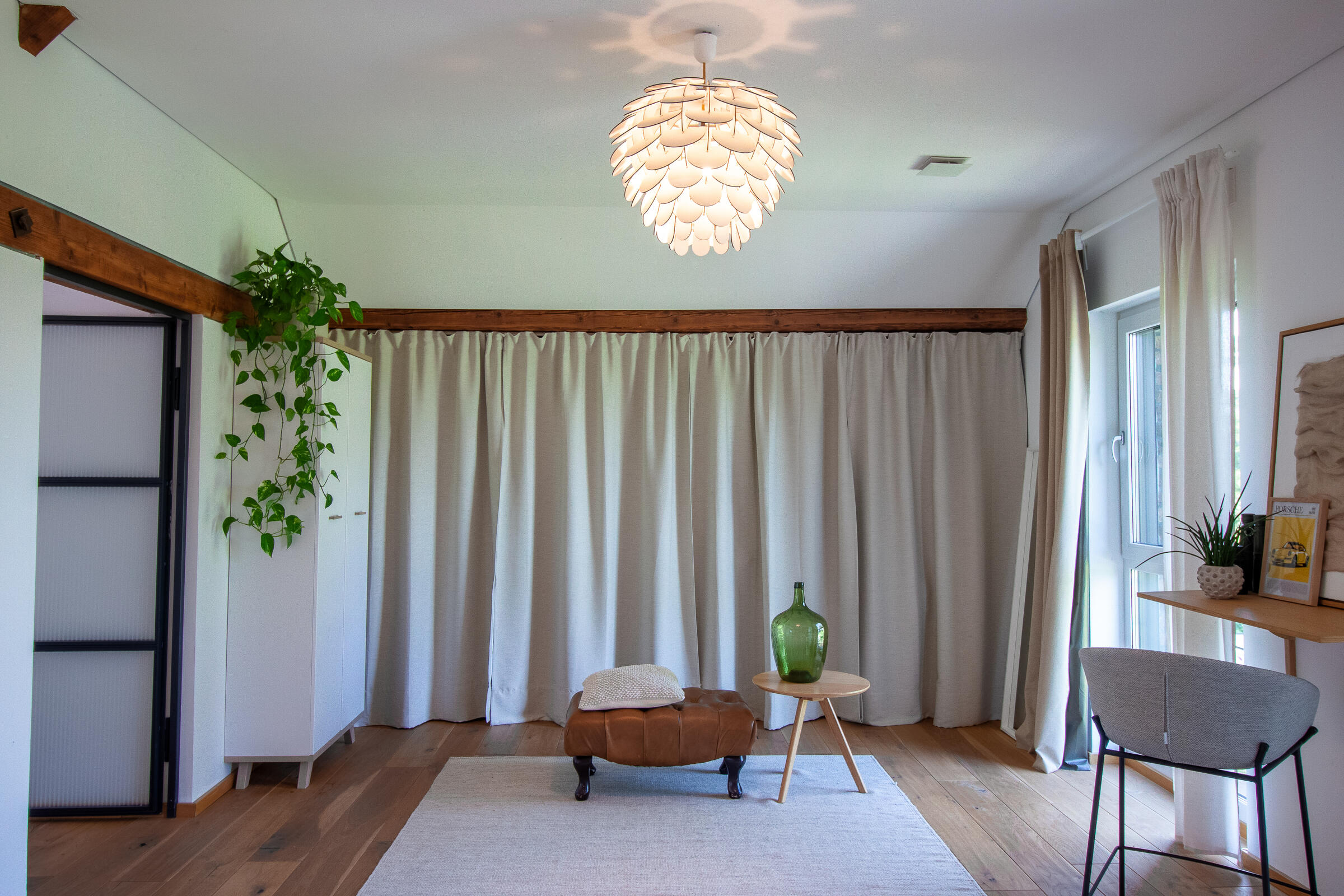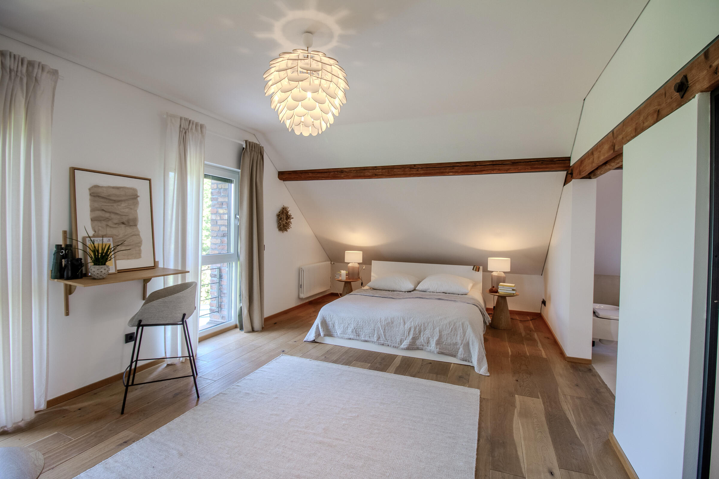 Unser ländlich gelegenes Wohnhaus ist eine vollständig sanierte und umgebaute Scheune aus dem 18. Jahrhundert mit alten Klinkersteinen an der gesamten äußeren Hausfassade. Das Haus hat einen großzügigen und offenen Grundriss mit Sichtbalken und einer bis zu 8 m hohen Decke im Eingangsbereich. In den unteren Wohnräumen beträgt die Deckenhöhe 3,20 m und die bodentiefen und rahmenlosen Panoramafenster lassen viel Licht in die Räumlichkeiten. Eine Lichtsteuerung ist mittels Raffstores an alle Fenstern im EG möglichen. Die Einrichtung ist skandinavisch modern: hell, mit vielen Holzelementen wie dem Schlossdielen-Eichenparkett und vielen Möbeln in hellem Massivholz. Weitere natürliche Materialien wie Leinenvorhänge, Leinendekostoffe und Wollteppiche lassen die Räume trotz der Größe sehr einladend und gemütlich wirken. Die Küche aus geräucherter Eiche bietet eine große Kochinsel mit Gaskochfeld in der Mitte. Ebenfalls gibt es einen dreiseitig verglasten Kaminofen. Das Badezimmer im Obergeschoss ist fugenlos aus gespachteltem Mikrozement mit großer Walk-in-Dusche.