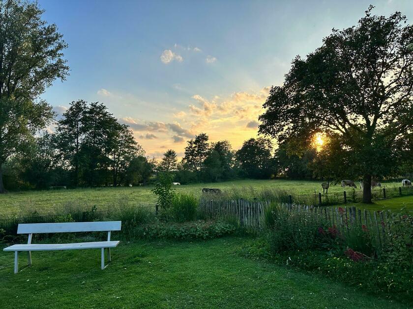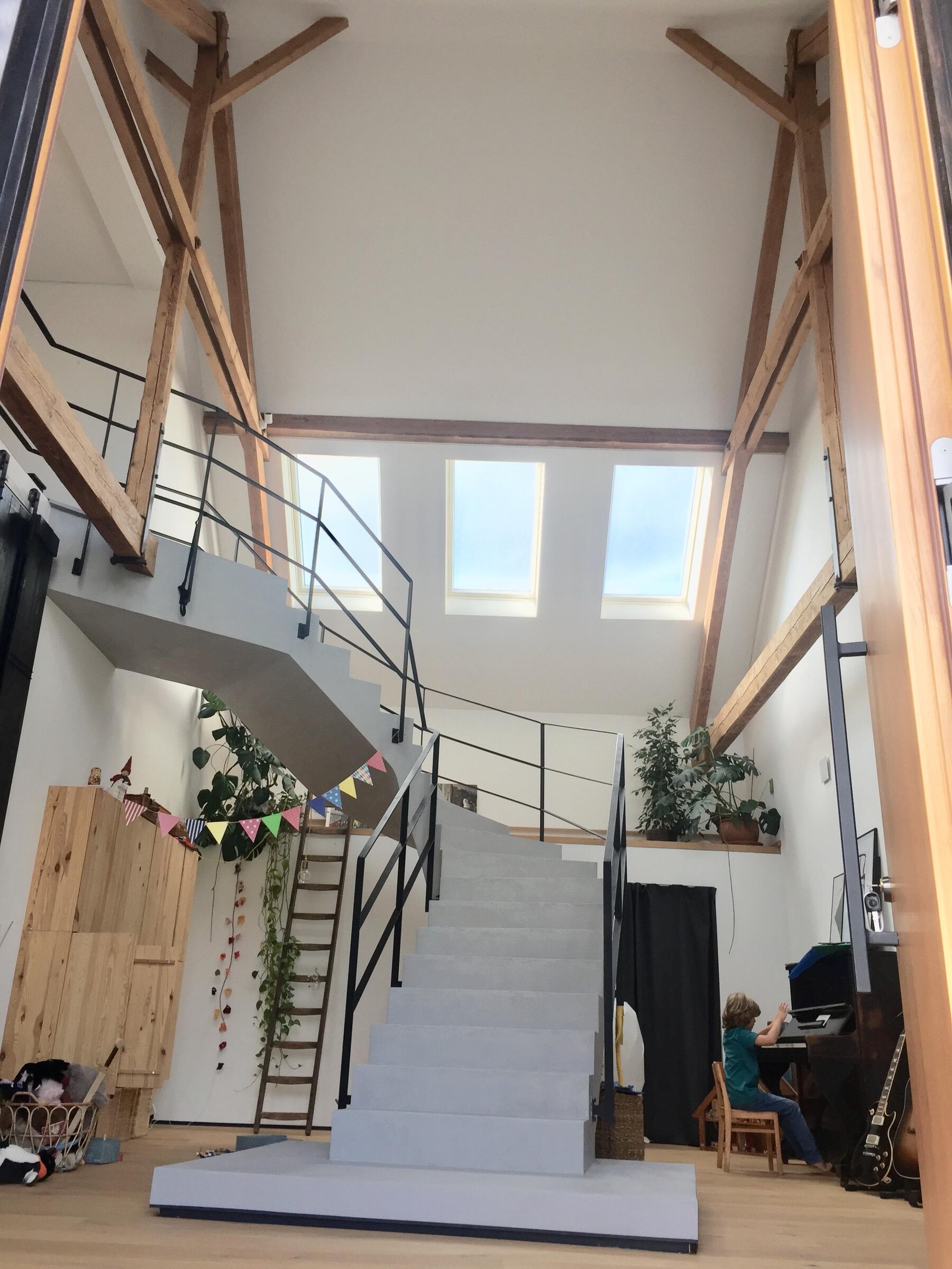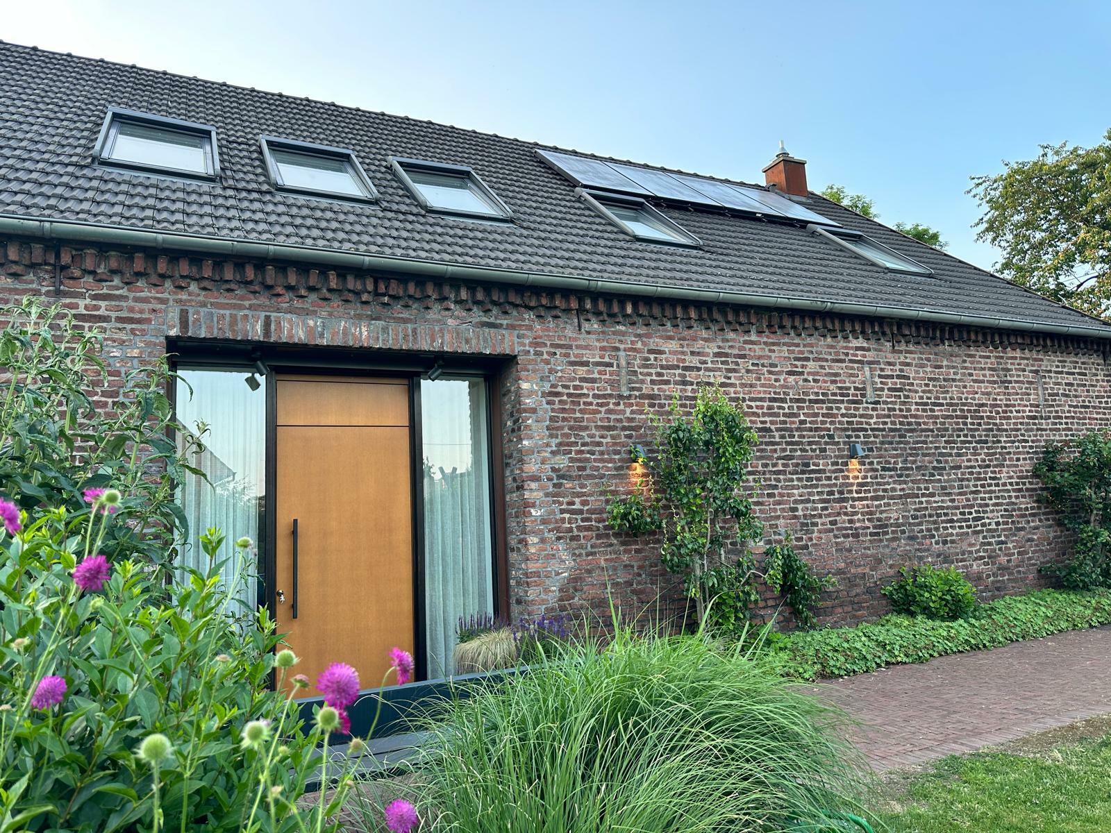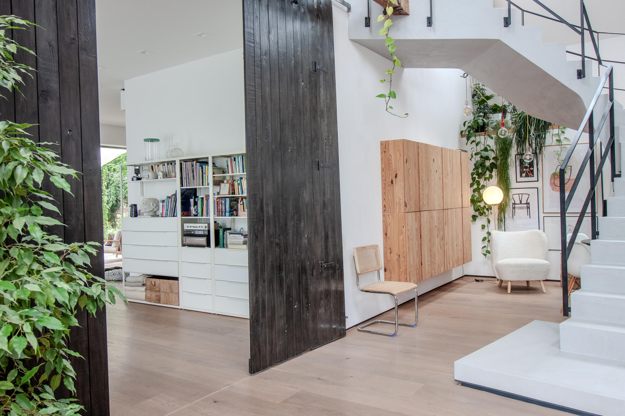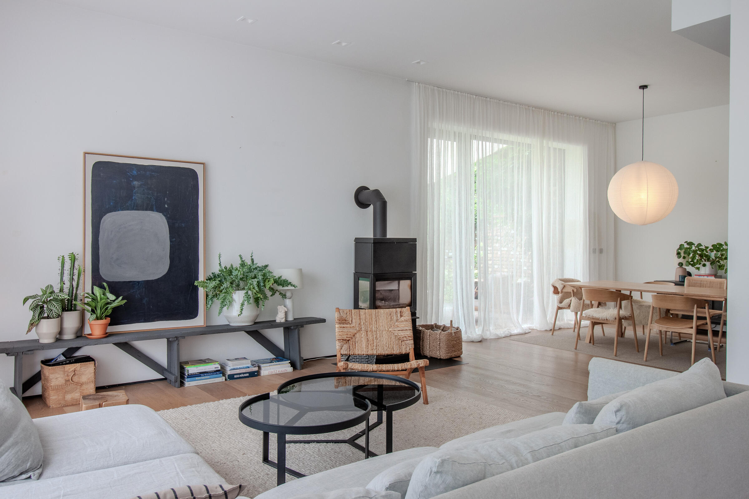 Unser ländlich gelegenes Wohnhaus ist eine vollständig sanierte und umgebaute Scheune aus dem 18. Jahrhundert mit alten Klinkersteinen an der gesamten äußeren Hausfassade. Das Haus hat einen großzügigen und offenen Grundriss mit Sichtbalken und einer bis zu 8 m hohen Decke im Eingangsbereich. In den unteren Wohnräumen beträgt die Deckenhöhe 3,20 m und die bodentiefen und rahmenlosen Panoramafenster lassen viel Licht in die Räumlichkeiten. Eine Lichtsteuerung ist mittels Raffstores an alle Fenstern im EG möglichen. Die Einrichtung ist skandinavisch modern: hell, mit vielen Holzelementen wie dem Schlossdielen-Eichenparkett und vielen Möbeln in hellem Massivholz. Weitere natürliche Materialien wie Leinenvorhänge, Leinendekostoffe und Wollteppiche lassen die Räume trotz der Größe sehr einladend und gemütlich wirken. Die Küche aus geräucherter Eiche bietet eine große Kochinsel mit Gaskochfeld in der Mitte. Ebenfalls gibt es einen dreiseitig verglasten Kaminofen. Das Badezimmer im Obergeschoss ist fugenlos aus gespachteltem Mikrozement mit großer Walk-in-Dusche.