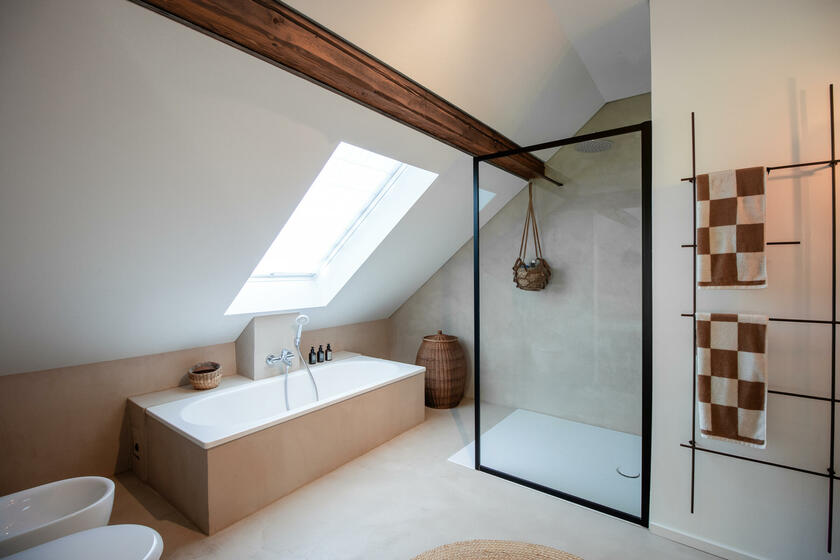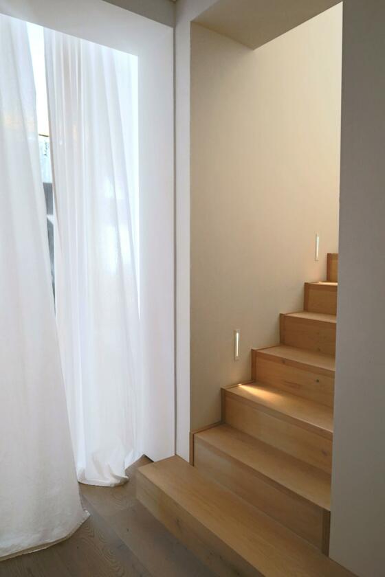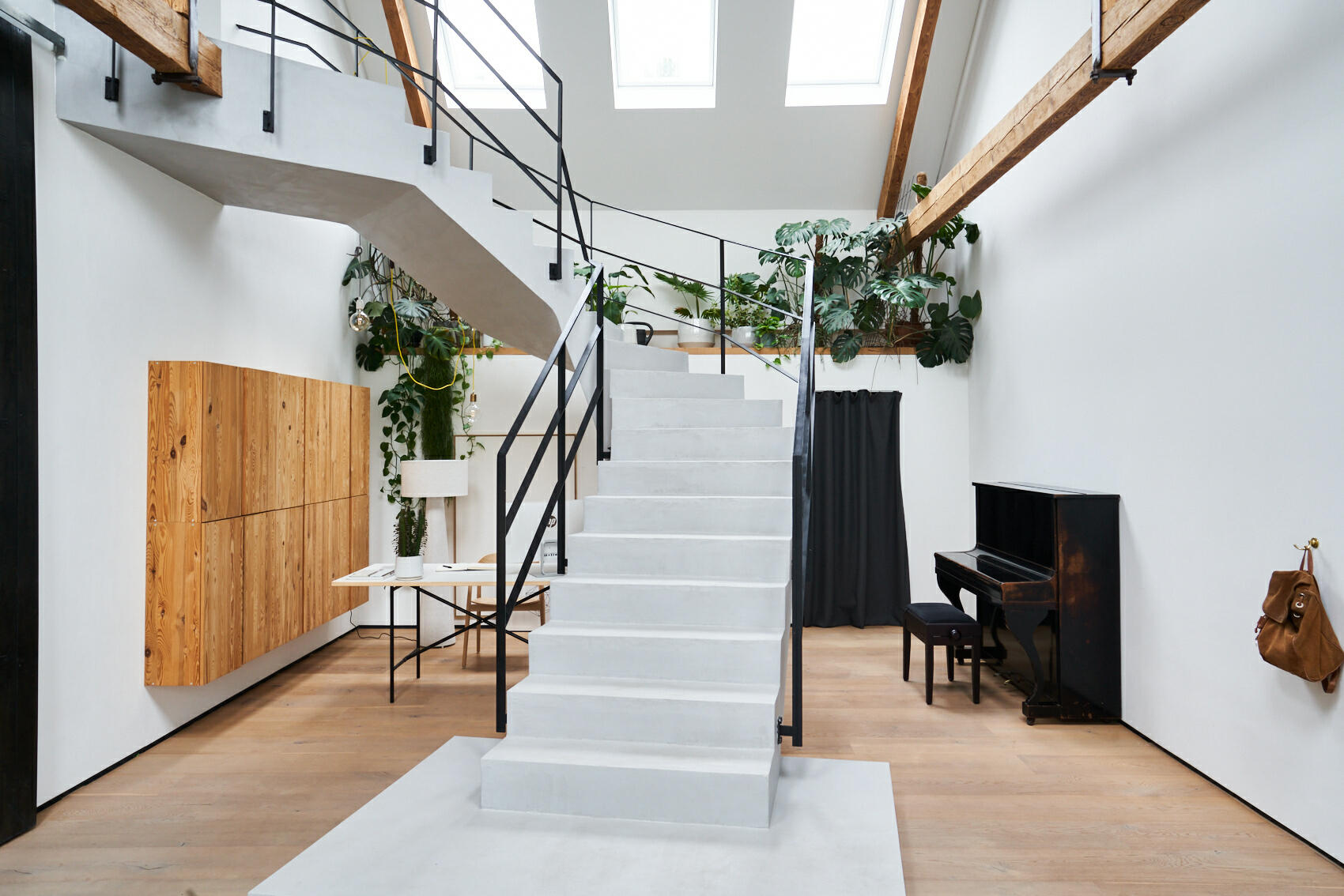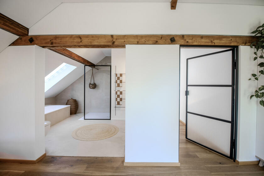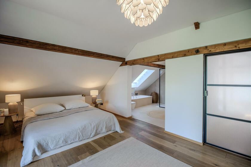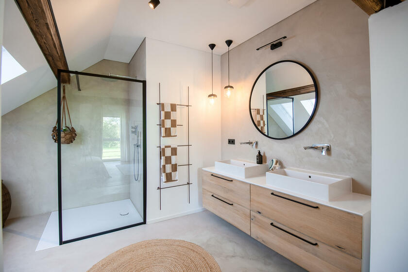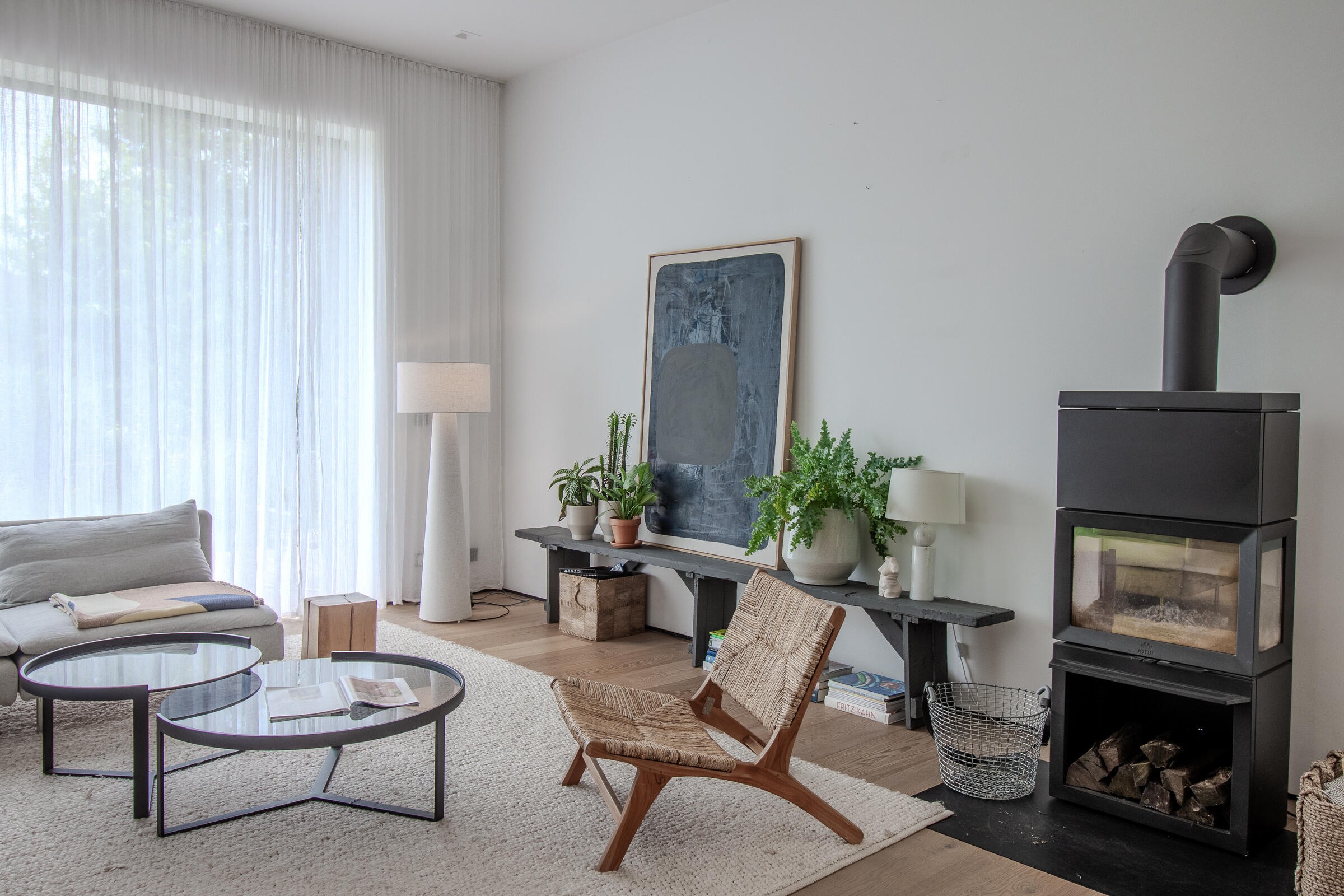 Unser ländlich gelegenes Wohnhaus ist eine vollständig sanierte und umgebaute Scheune aus dem 18. Jahrhundert mit alten Klinkersteinen an der gesamten äußeren Hausfassade. Das Haus hat einen großzügigen und offenen Grundriss mit Sichtbalken und einer bis zu 8 m hohen Decke im Eingangsbereich. In den unteren Wohnräumen beträgt die Deckenhöhe 3,20 m und die bodentiefen und rahmenlosen Panoramafenster lassen viel Licht in die Räumlichkeiten. Eine Lichtsteuerung ist mittels Raffstores an alle Fenstern im EG möglichen. Die Einrichtung ist skandinavisch modern: hell, mit vielen Holzelementen wie dem Schlossdielen-Eichenparkett und vielen Möbeln in hellem Massivholz. Weitere natürliche Materialien wie Leinenvorhänge, Leinendekostoffe und Wollteppiche lassen die Räume trotz der Größe sehr einladend und gemütlich wirken. Die Küche aus geräucherter Eiche bietet eine große Kochinsel mit Gaskochfeld in der Mitte. Ebenfalls gibt es einen dreiseitig verglasten Kaminofen. Das Badezimmer im Obergeschoss ist fugenlos aus gespachteltem Mikrozement mit großer Walk-in-Dusche.