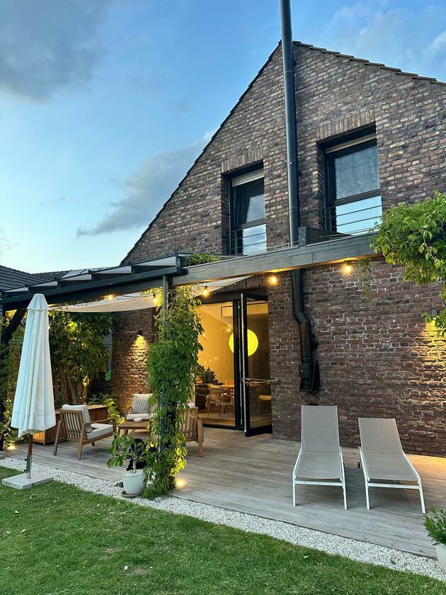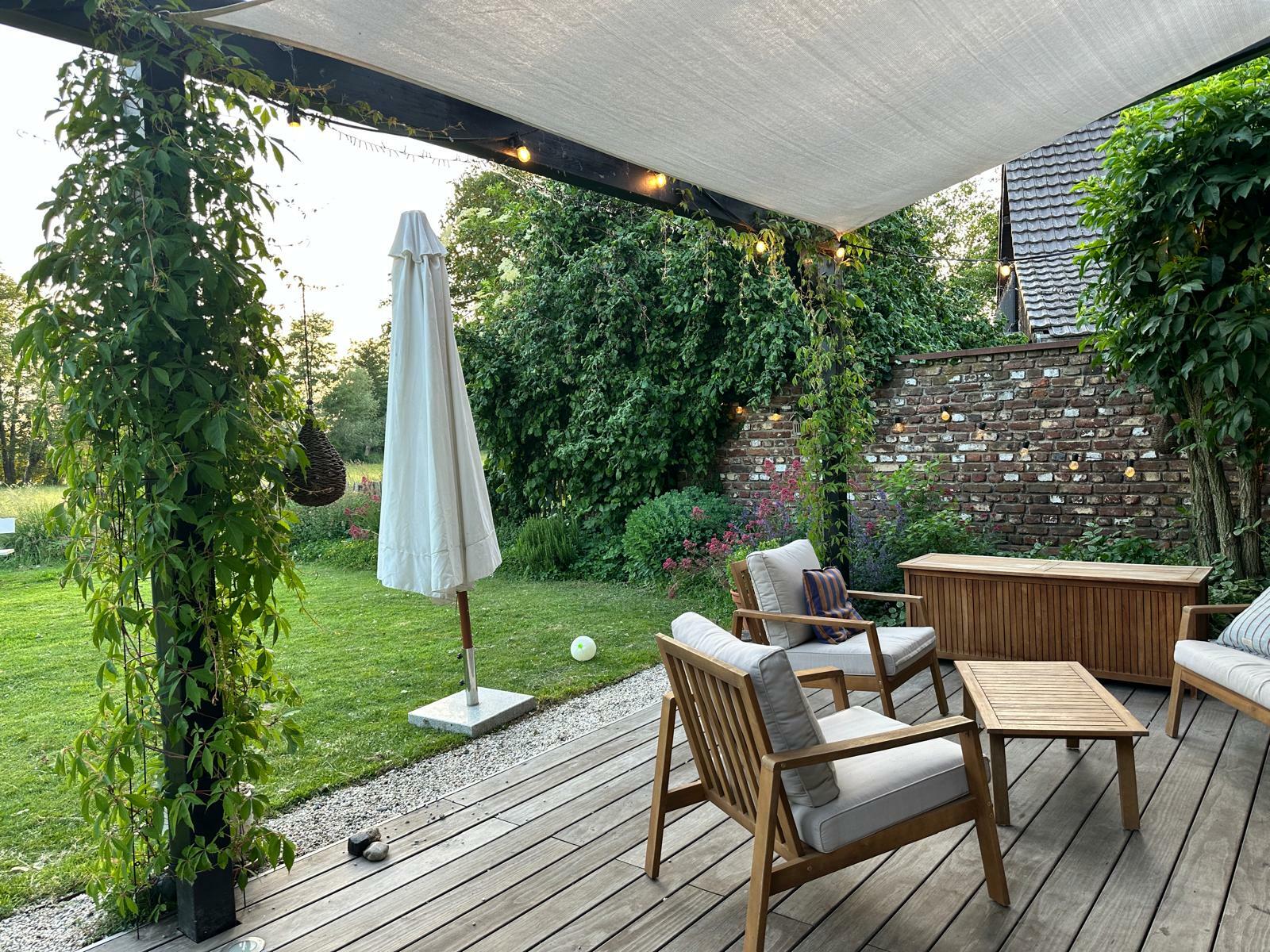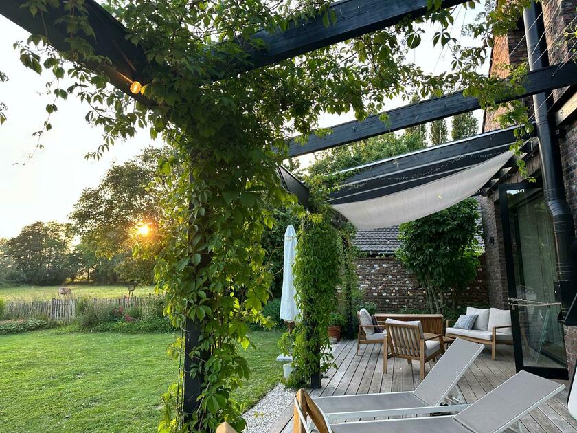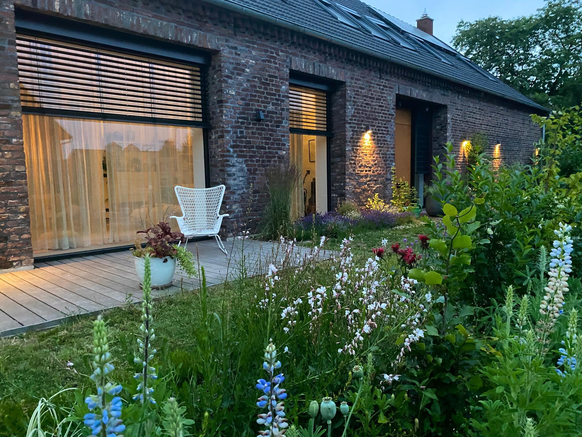 Im Außenbereich bietet unser Haus einen großen Garten mit Wiese, Staudenbeeten, eine Terrasse aus Kebony Holz und schwarzer Pergola mit wildem Wein. In Sichtweite zum Haus befindet sich ein kleiner See.