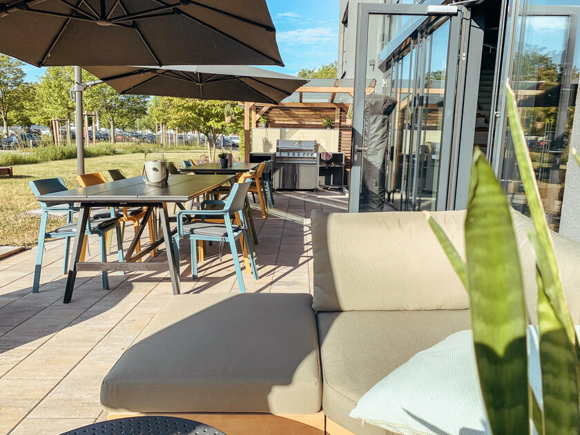 Es gibt separate Bereiche für Interviews, Garderobe, Maske und Technik, die sich für unterschiedliche Produktionsabläufe eignen. Der Außenbereich umfasst eine Terrasse mit 70 m² Fläche, eine Lounge und einen Garten. Er kann als zusätzlicher Drehort oder als Aufenthaltsbereich genutzt werden.