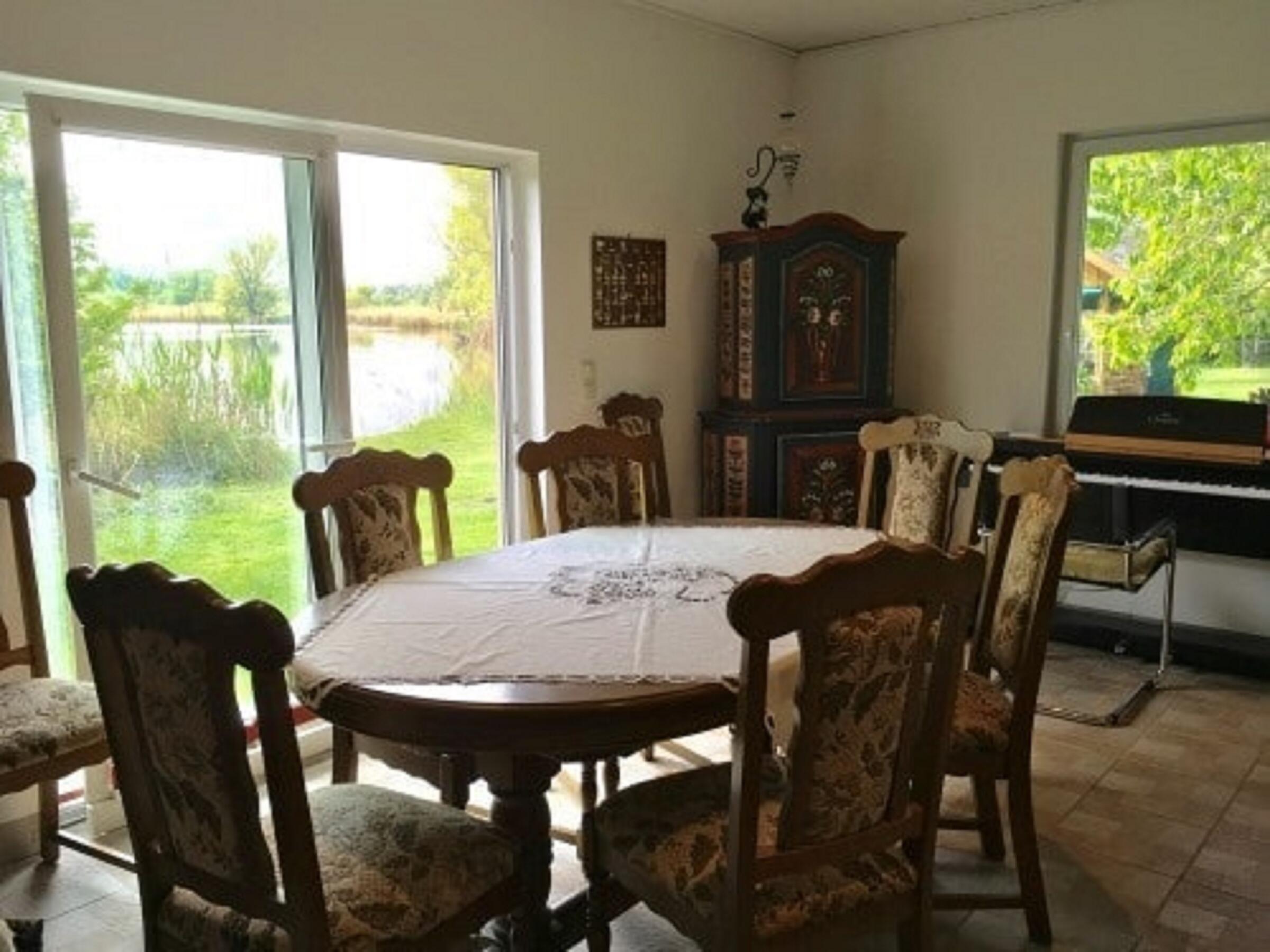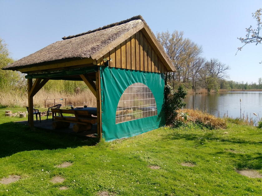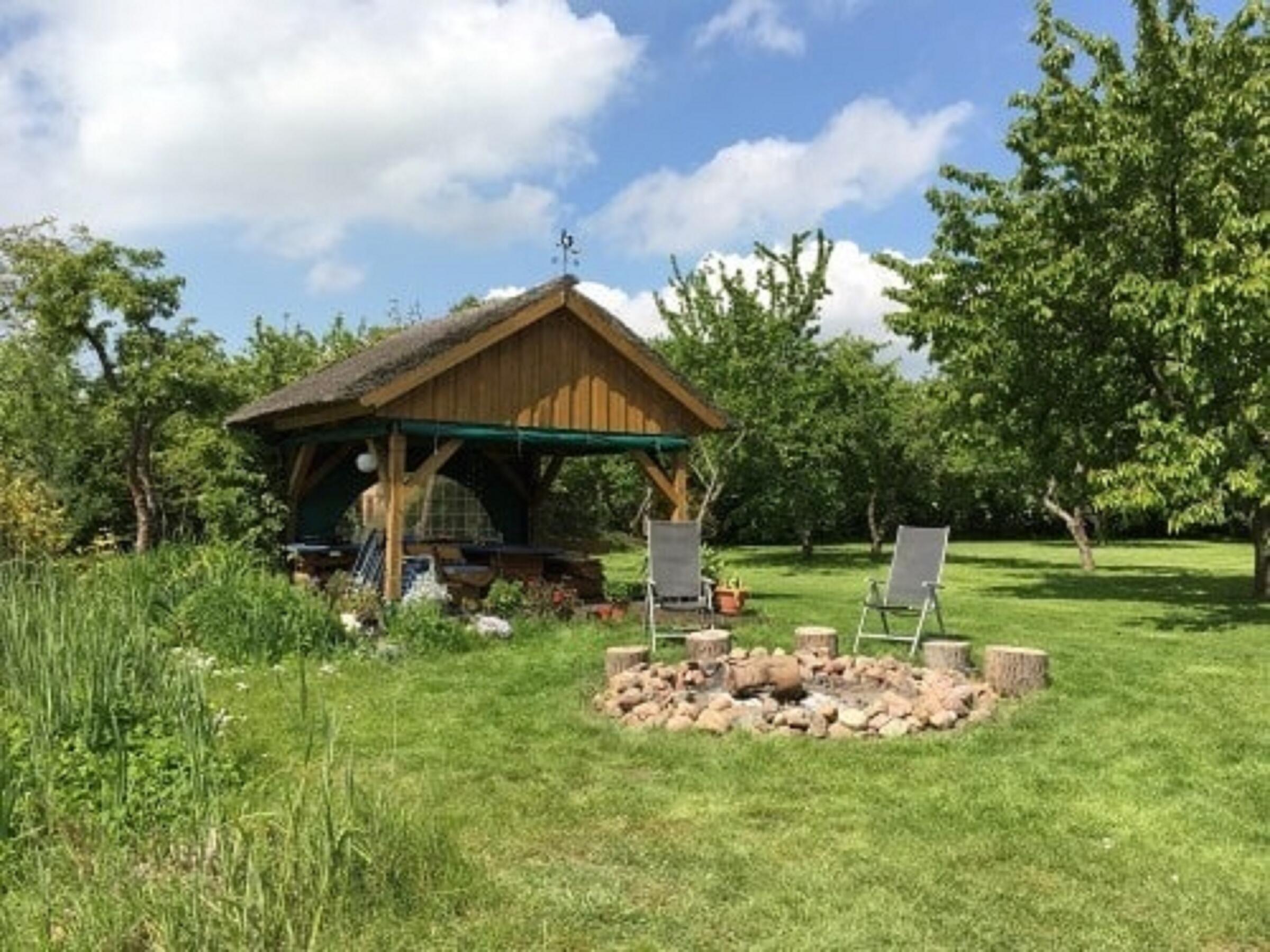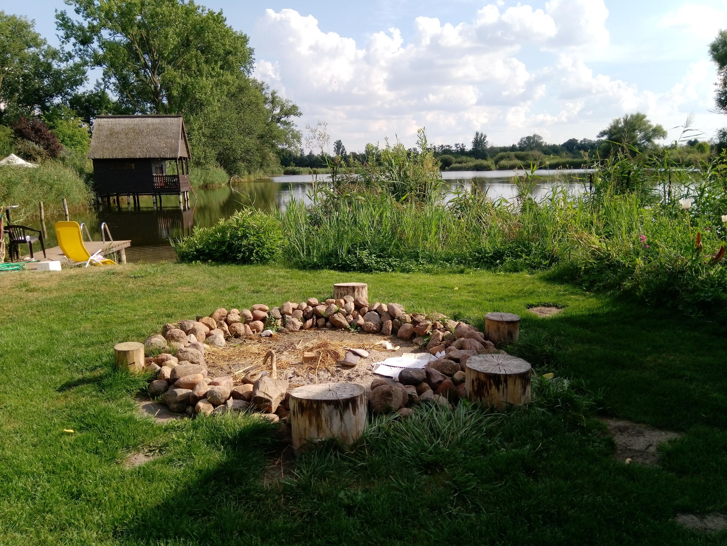 Eine weitere Besonderheit ist das auf dem See befindliche und bewohnbare Holzpfahlhaus, was über eine kleine Holzbrücke vom Grundstück aus betreten werden kann. Es ist reetgedeckt und verfügt über ein Obergeschoss in Stehhöhe und eine wunderbare Holzveranda, die am Nachmittag/ Abend einen sagenhaften Blick auf den Sonnenuntergang bietet. Strom ist vorhanden.An der eigenen Badestelle, die aus einem kleinen Sandstrand mit Holzsteg und Badeleiter besteht, grenzt die große Liegewiese und der mit Feldsteinen versehene runde Grill- und Feuerplatz an, der Platz für über 10 Personen bietet. Bei schlechterem oder zu heißem Wetter bietet sich ein Verweilen unter dem daneben befindlichen, reetgedeckten Holzpavillon an. Dieser ist mit einer langen Echtholztafel und Bänken ausgestattet, so dass dort 15-20 Personen Platz finden und auch essen könnten. Hier wurden an allen Seiten herunterrollbare Planen mit Sichtfenstern angebracht, die bei Bedarf vor Regen und Kälte schützen. Auch hier ist Strom vorhanden.