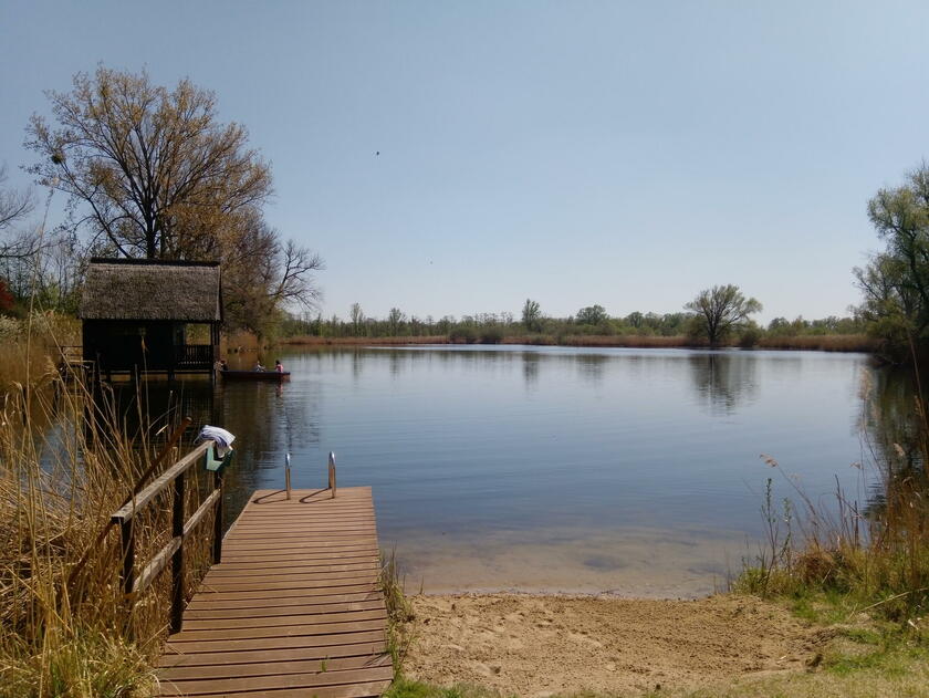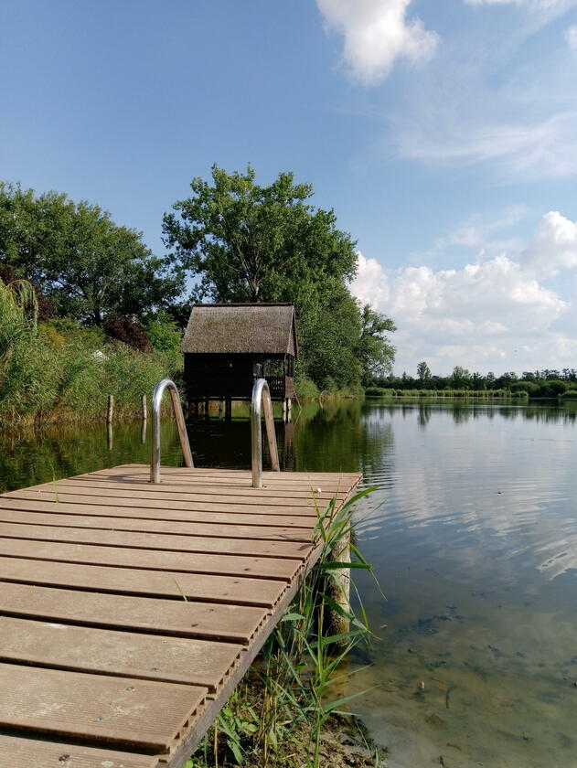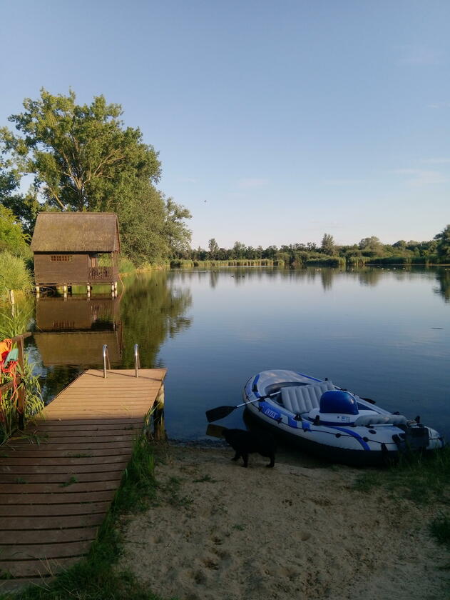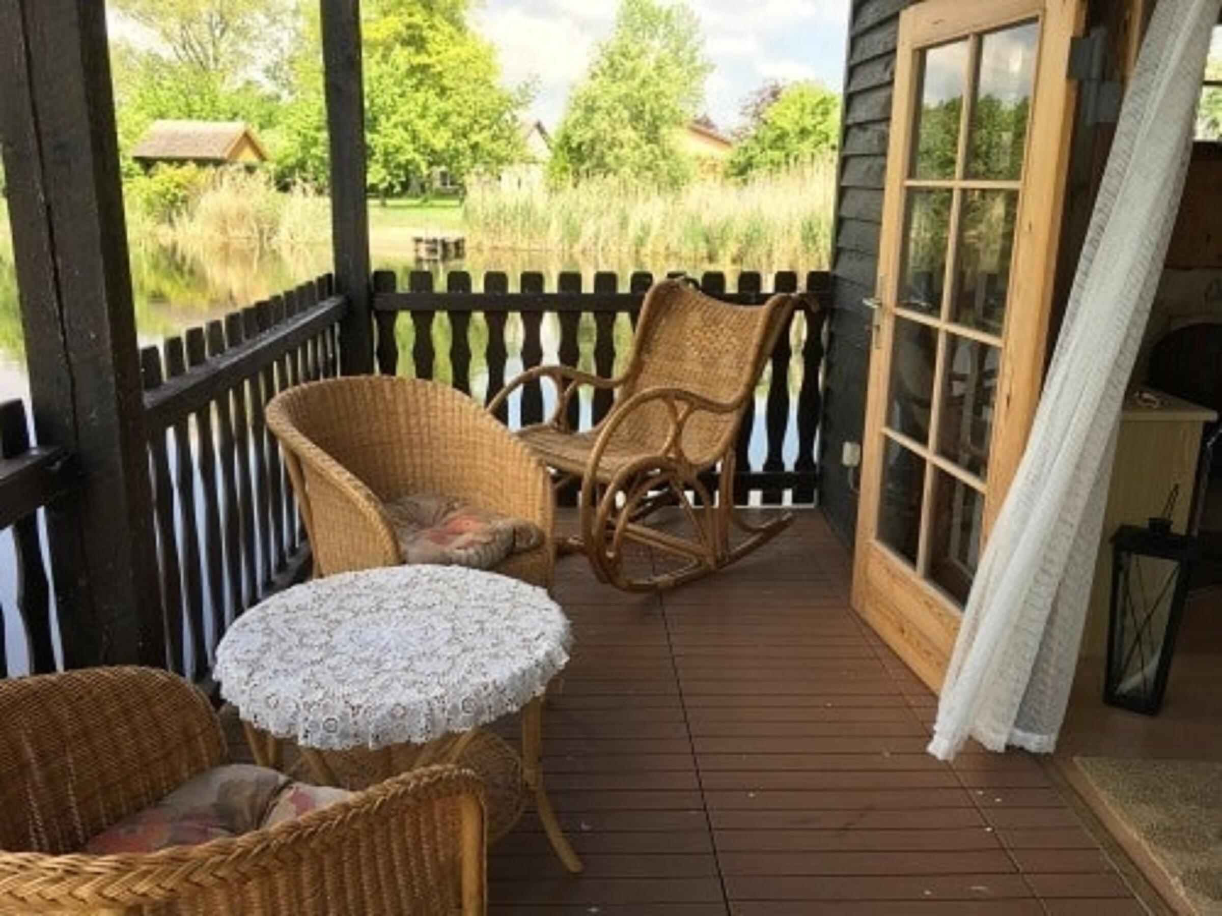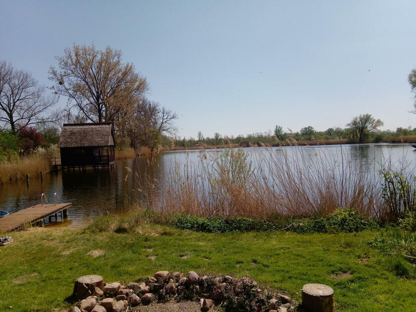 Eine weitere Besonderheit ist das auf dem See befindliche und bewohnbare Holzpfahlhaus, was über eine kleine Holzbrücke vom Grundstück aus betreten werden kann. Es ist reetgedeckt und verfügt über ein Obergeschoss in Stehhöhe und eine wunderbare Holzveranda, die am Nachmittag/ Abend einen sagenhaften Blick auf den Sonnenuntergang bietet. Strom ist vorhanden.An der eigenen Badestelle, die aus einem kleinen Sandstrand mit Holzsteg und Badeleiter besteht, grenzt die große Liegewiese und der mit Feldsteinen versehene runde Grill- und Feuerplatz an, der Platz für über 10 Personen bietet. Bei schlechterem oder zu heißem Wetter bietet sich ein Verweilen unter dem daneben befindlichen, reetgedeckten Holzpavillon an. Dieser ist mit einer langen Echtholztafel und Bänken ausgestattet, so dass dort 15-20 Personen Platz finden und auch essen könnten. Hier wurden an allen Seiten herunterrollbare Planen mit Sichtfenstern angebracht, die bei Bedarf vor Regen und Kälte schützen. Auch hier ist Strom vorhanden.