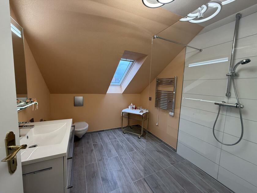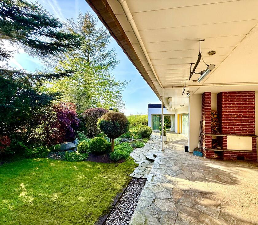 Die freistehende Villa bietet neben seinen großzügigen und hellen Wohnräumen auch einen Wellnessbereich mit großem Indoor-Pool, Sauna und Dampfbad. Das Wohnzimmer und die Terrasse sind nach Südosten ausgerichtet. Durch eine breite Holzschiebetür gelangt man vom Wohnbereich in das Schlafzimmer mit Doppel-Wasserbett und weißem Hochflor-Teppich. Hier befinden sich ebenfalls ein luxuriöses Badezimmer mit hochwertigem Marmor und ein Ankleidezimmer. Das Schlafzimmer hat direkten Zugang zur Terrasse. Die Räume dürfen nach Absprache umgestaltet werden. Alle Fenster des Hauses können mit Rollläden verdunkelt werden. Der Indoor-Pool ist nicht beheizt. Im Außenbereich stehen der große Garten, die Terrasse mit Außenkamin sowie Pkw-Parkplätze zur Verfügung. Weitere kostenfreie Stellflächen, auch für Lkw, befinden sich auf der am Grundstück vorbeiführenden und wenig befahrenen Straße.