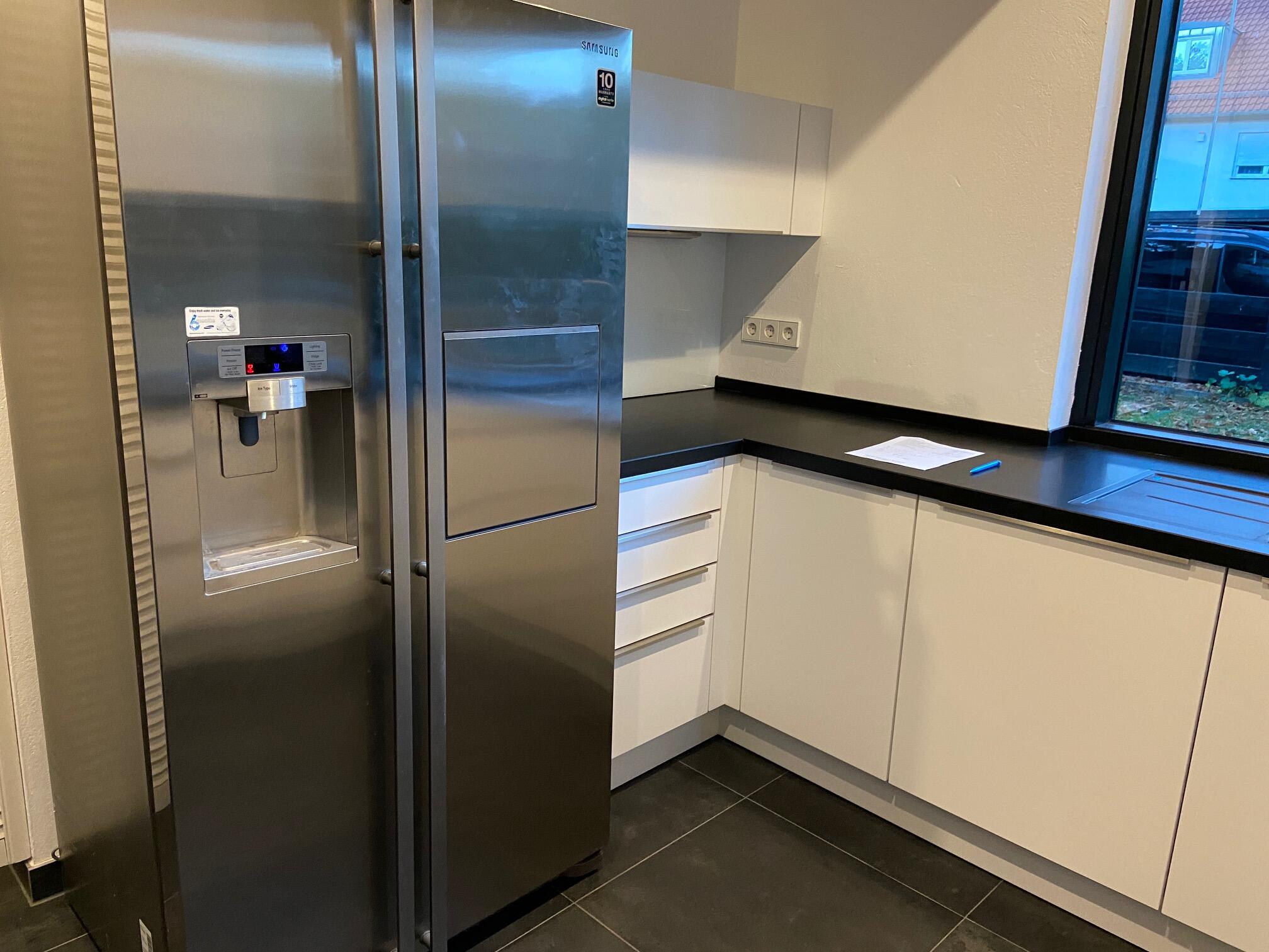 Mit großem Side-by-Side Kühlschrank und zur Straßenseite einer großen Fensterfront.