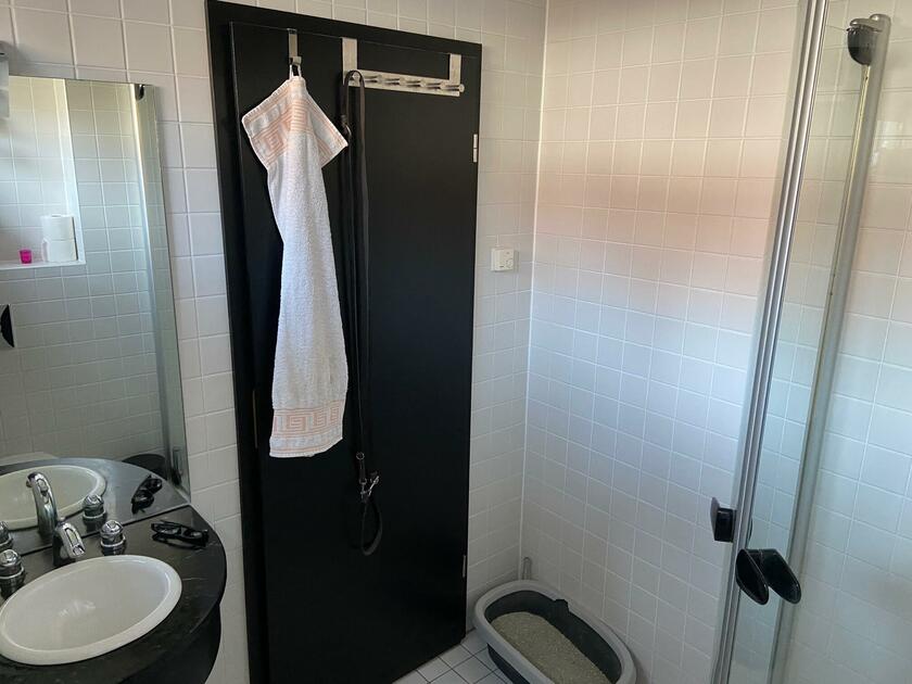 - Inkl. begehbare Dusche mit Regenduschkopf. Wandfliesen hellgrau, Bodenfliesen Anthrazit