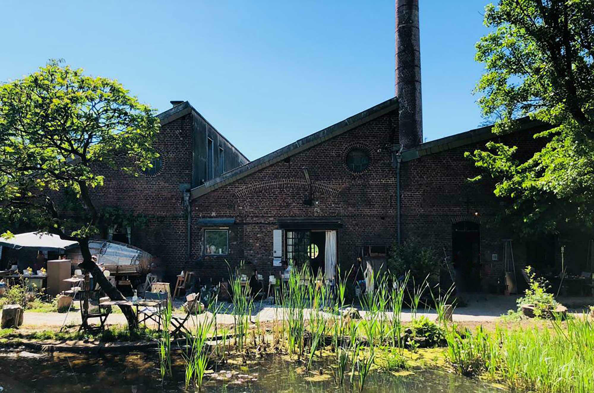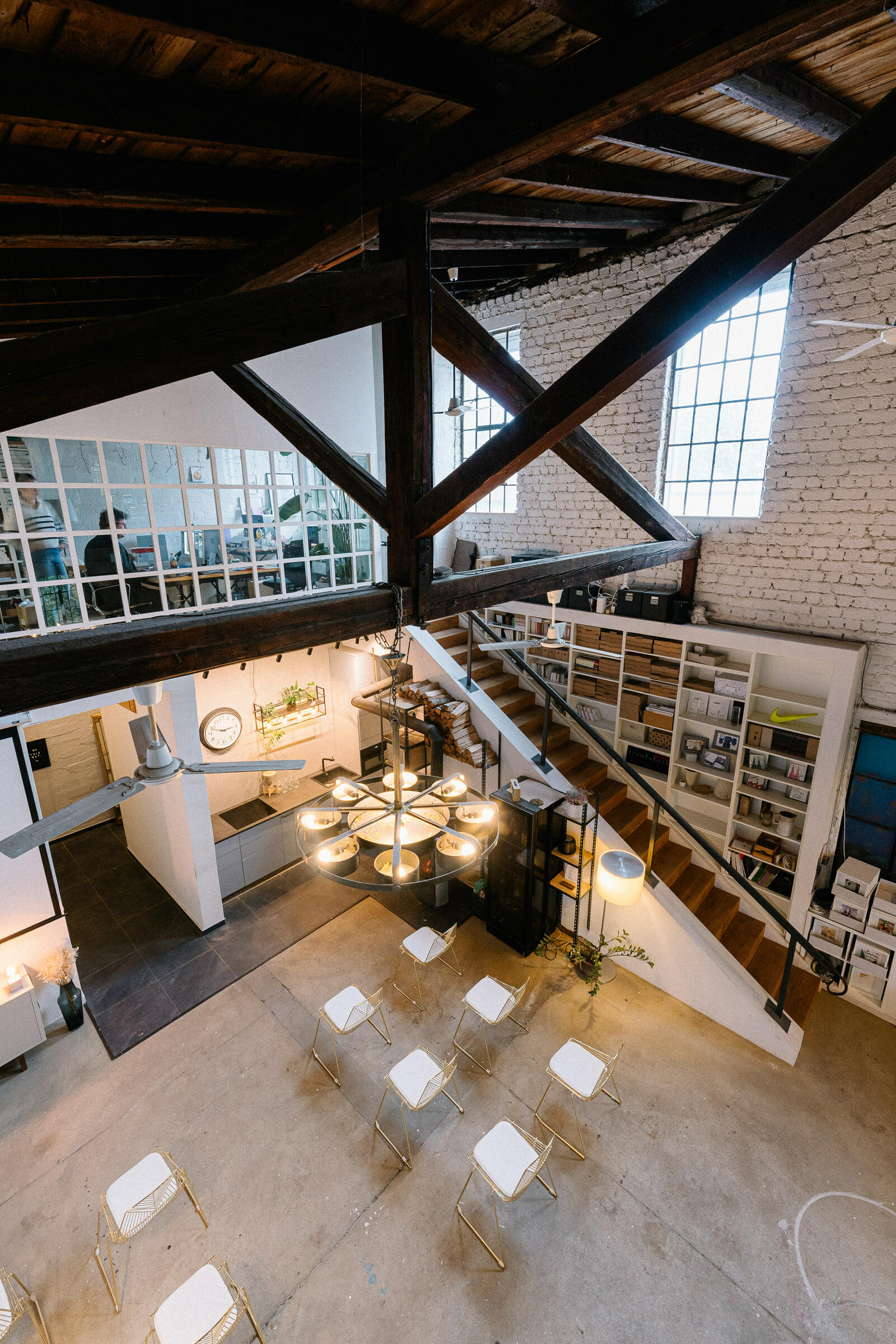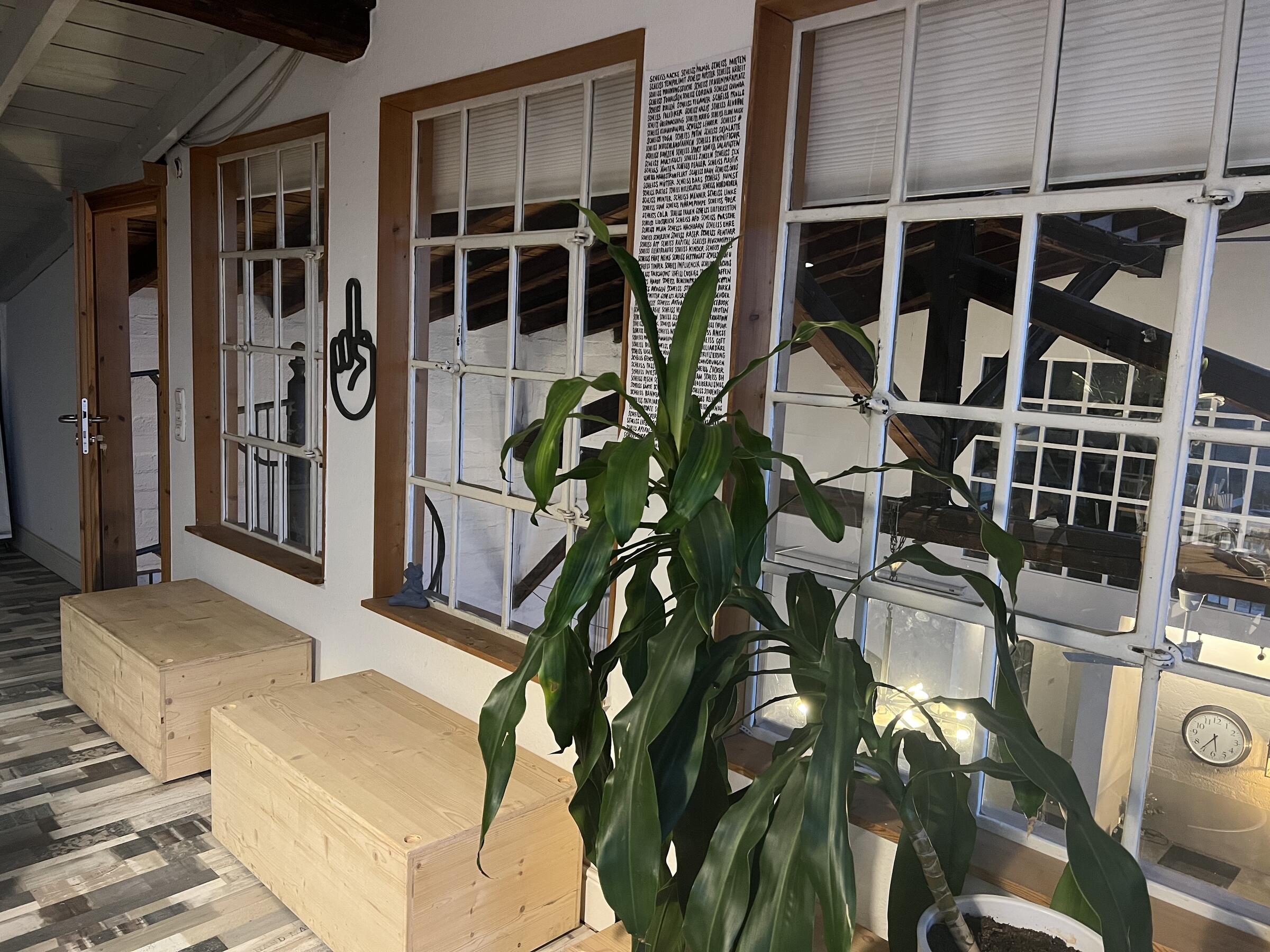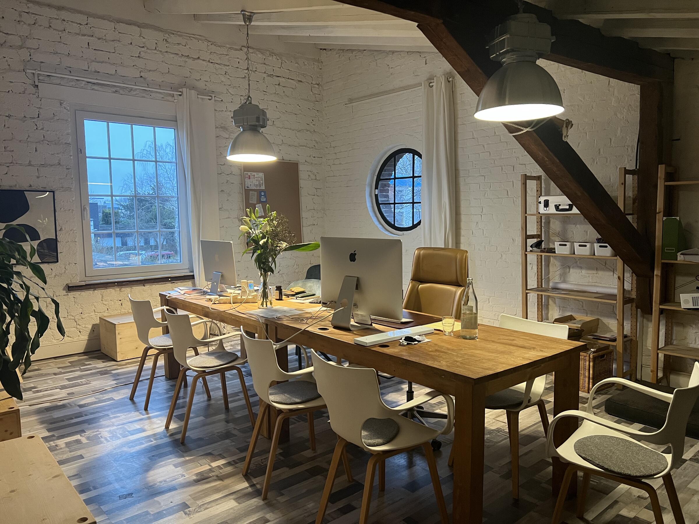 Das ebenerdige und große Büro-Loft befindet sich in einer ehemaligen Kerzen- und Wachsfabrik im Süden von Köln. Das Loft besticht durch eine beeindruckende 8 m hohe Holzbalkendecke, große verdunkelbare Werkstattfenster und alte Holzsäulen. Im EG befindet sich die große Industriehalle mit offener moderner Küche, einem Badezimmer mit Dusche, einem separaten WC und einem kleinen Lagerraum. Das Mobiliar ist im passenden Industrial-Look gehalten: Konferenztisch mit schwarzen und metall-goldenen Stühlen, Holzsitzpodeste mit bunten Sitzkissen, Lounge-Sessel, Industrielampen, Pflanzen und Sprüche an den Wänden. Über die offene Holztreppe und die Stahlwendeltreppe gelangt man zu den beiden abschließbaren Büros im OG. Im Außenbereich steht eine kleine Terrasse zur Verfügung. Ein Parkplatz mit ca. 20 Stellplätzen ist auf dem Gelände vorhanden.
