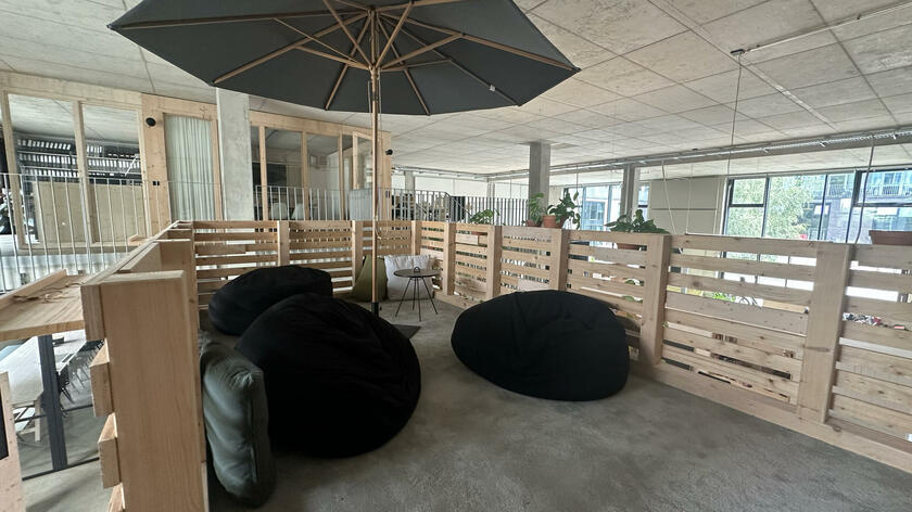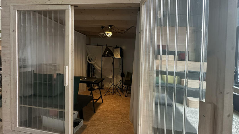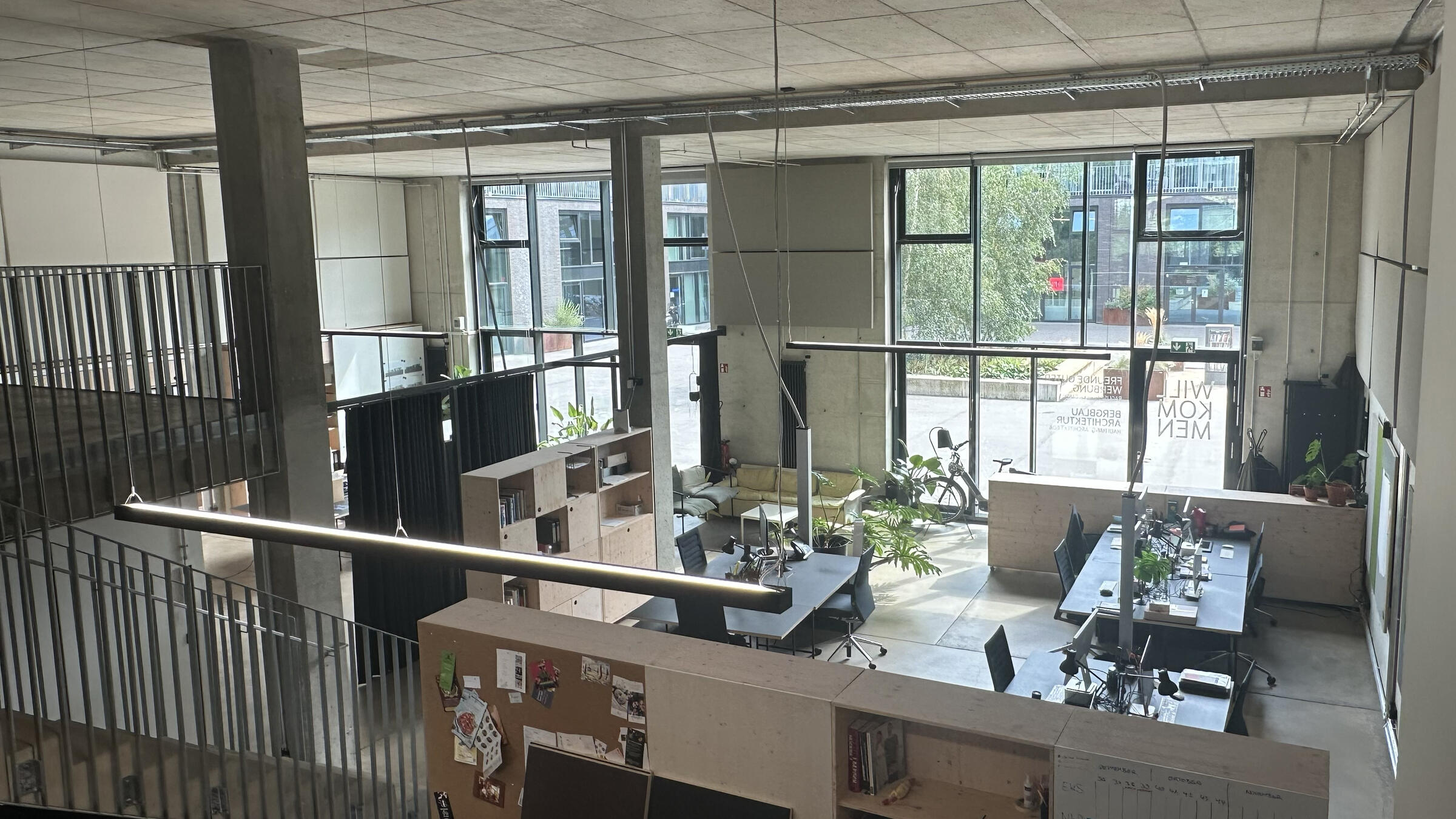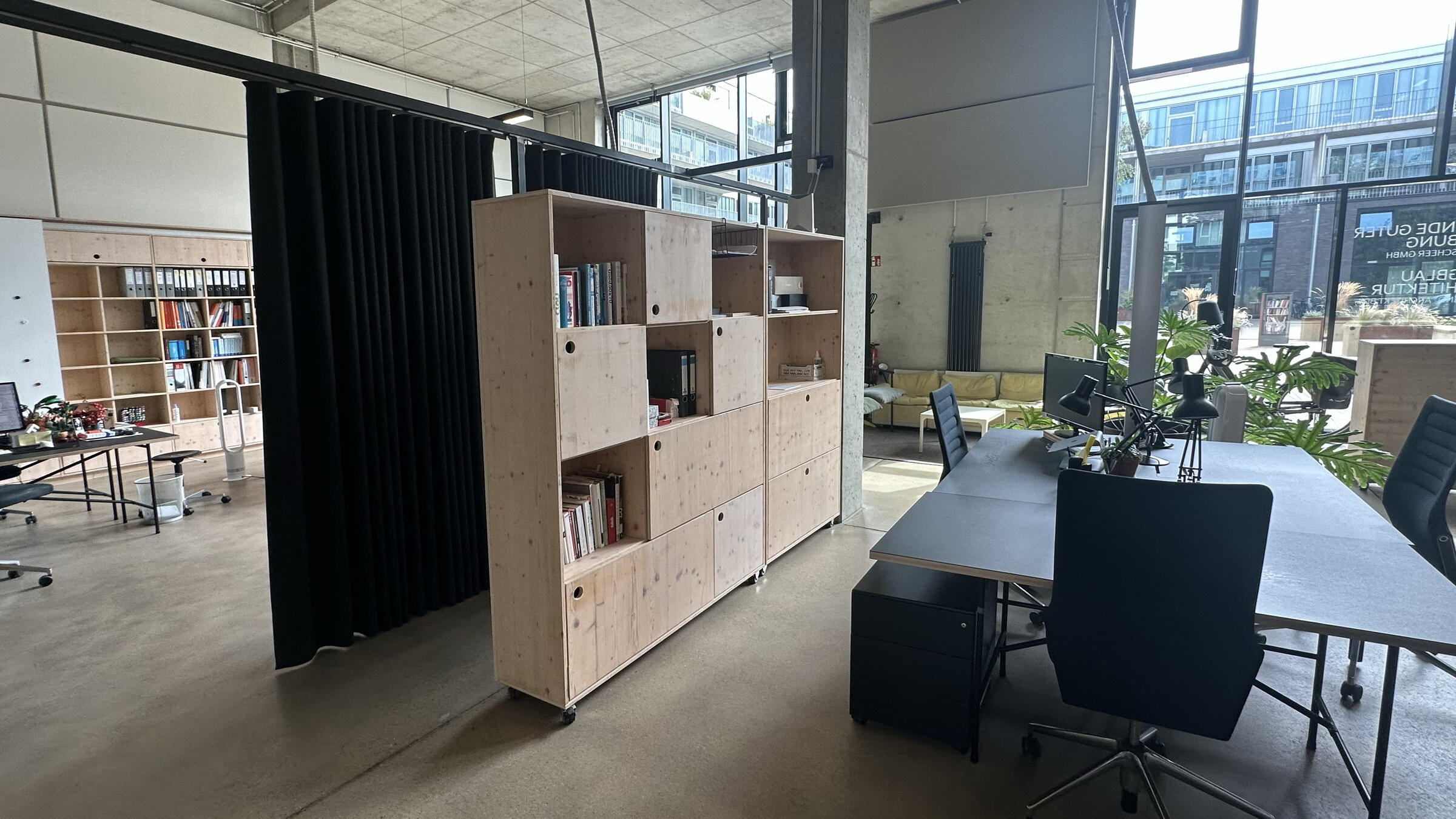 Dieses moderne Loft-Büro besticht durch seinen stilvollen Industrial-Look mit Sichtbeton, Holz und Metall. Die offene, großzügige Fläche bietet bis zu 5,5 Meter hohe Decken und raumhohe Fenster. Die Fenster können teilweise mit Jalousien abgedunkelt werden. Das Büro ist vollständig möbliert und mit flexiblen Regalelementen ausgestattet. Eine fest eingebaute Regalwand setzt einen markanten Akzent und bleibt als Bestandteil des Raums erhalten. Die Möblierung kann von Produktionen genutzt oder entfernt werden. Die Sichtbetonwände dürfen nicht verändert werden. Eine ca. 100 m² große Empore beherbergt einen Büroraum und einen Konferenzraum. Im unteren Bereich stehen zwei Rückzugsboxen für Telefon- oder Videokonferenzen zur Verfügung. Die voll ausgestattete Küche mit zwei Spülmaschinen und zwei Kühlschränken dient gleichzeitig als gemütlicher Aufenthaltsraum. Zwei separate Sanitärbereiche runden die Ausstattung ab. Das Büro wird über 2 separate und barrierefreie Zugänge im Erdgeschoss betreten.
