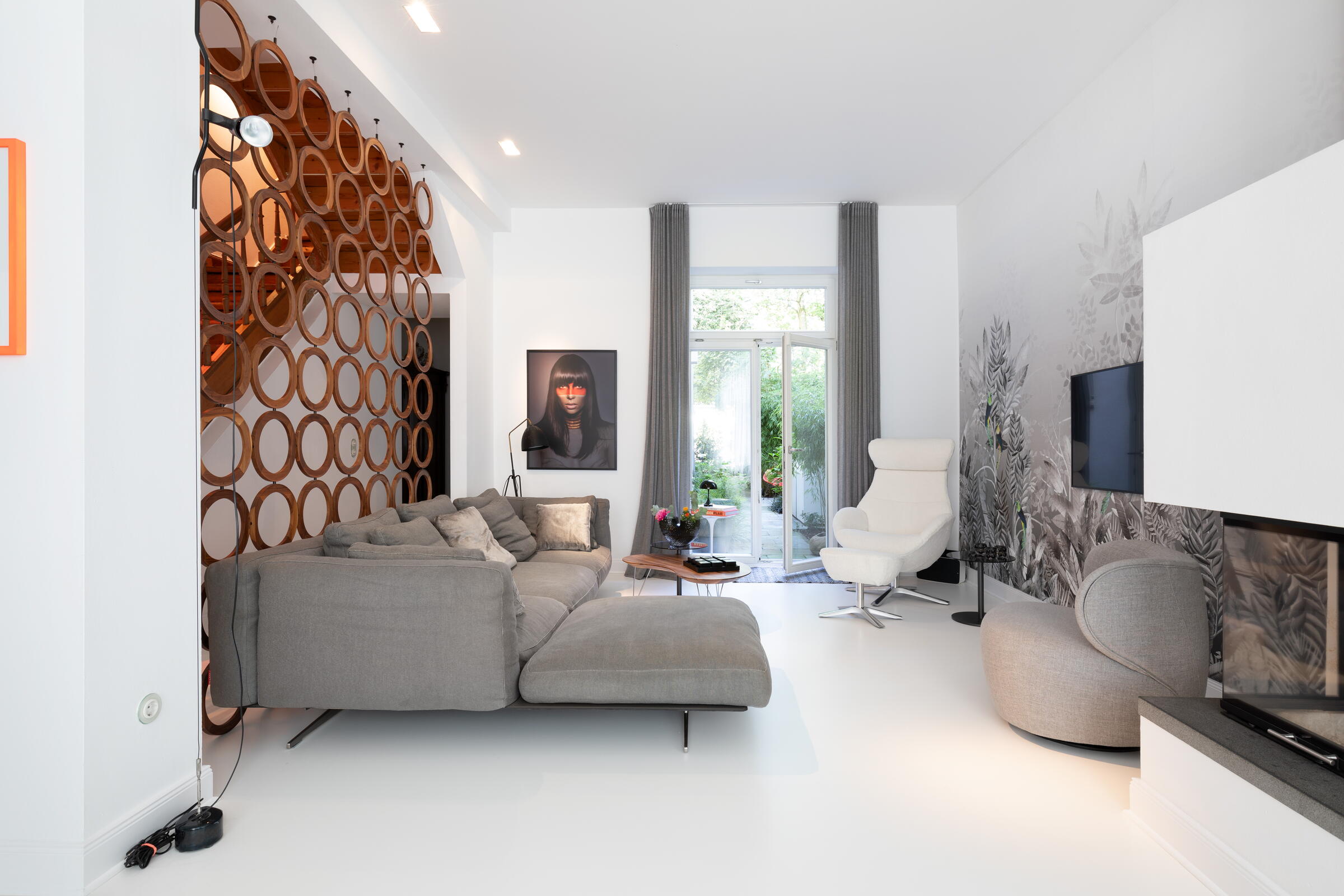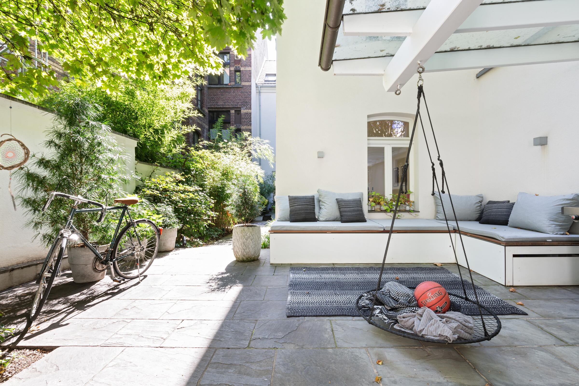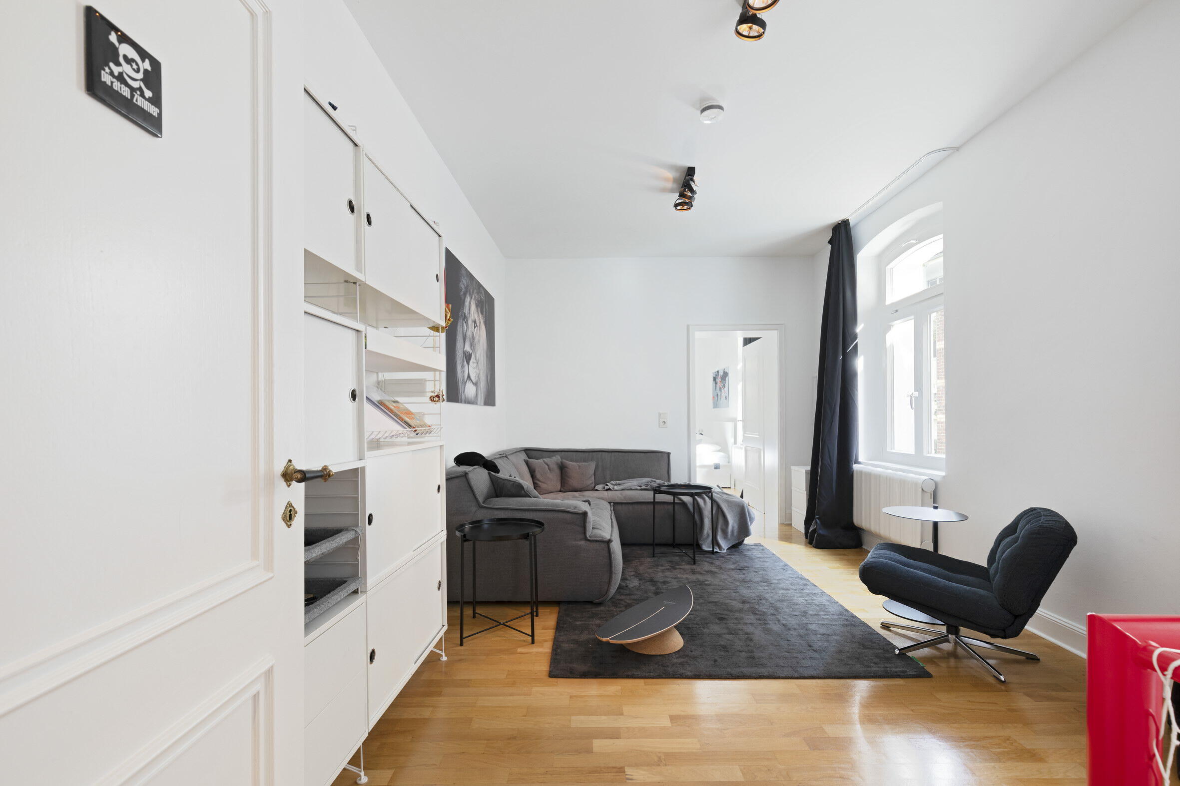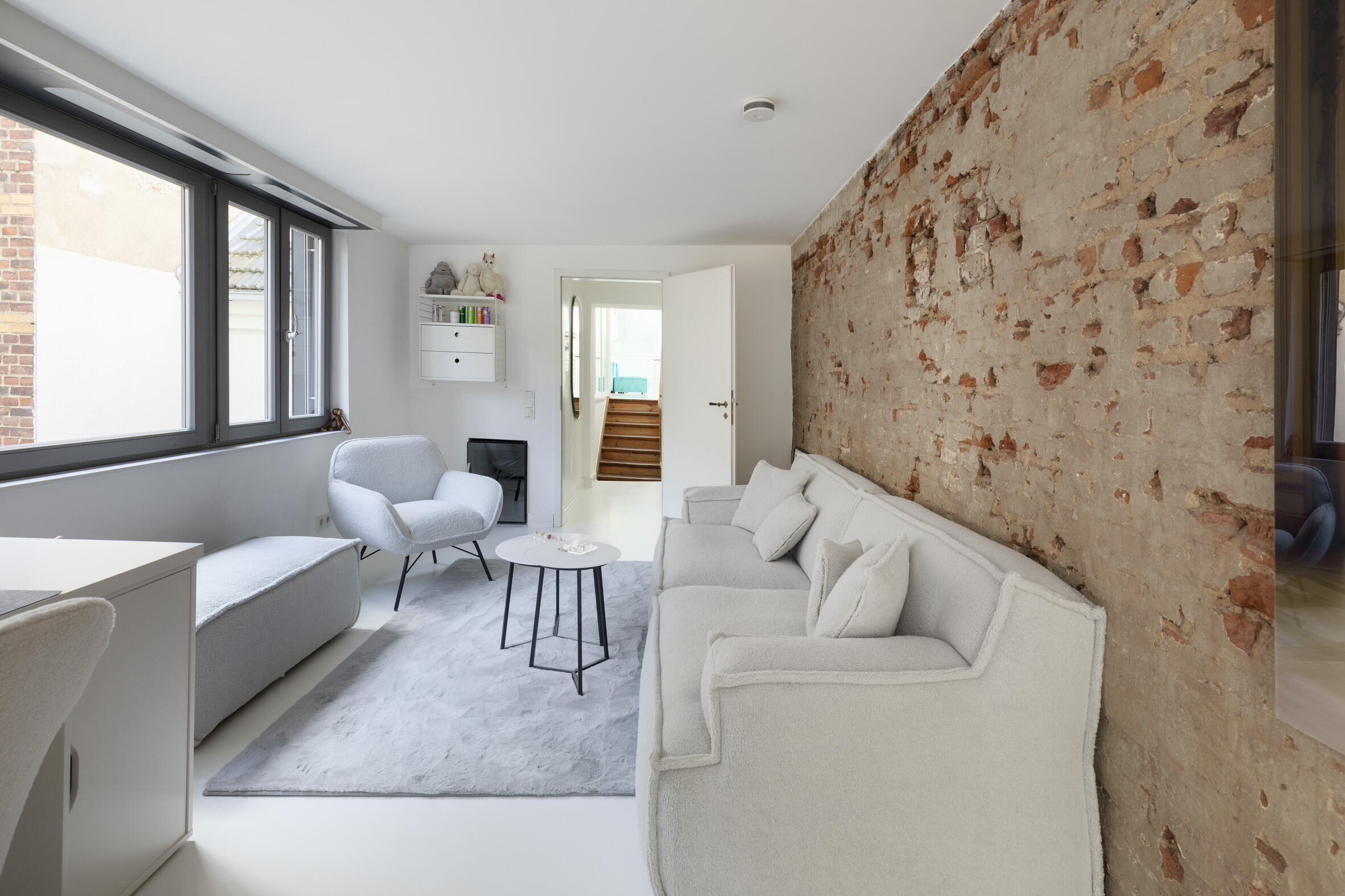 Unser außergewöhnliches und denkmalgeschütztes Stadthaus bietet eine Fläche von 240 m² und befindet sich in Köln-Nippes. Die hochwertig und designorientiert eingerichteten Räume des Hauses verteilen sich auf 2 Stockwerke. Die Böden der Räume bestehen aus fugenlosem weißen PU Boden oder Parkett. Die Fenster können mit Vorhängen und Jalousien abgedunkelt werden. Im Haus verteilt finden sich auch besondere Highlights wie beispielsweise ausgefallene Tapeten, eine Backsteinwand, eine alte Holztreppe und die denkmalgeschützte Eingangstür. Im Außenbereich gibt es einen sehr schönen und grün angelegten Innenhof.