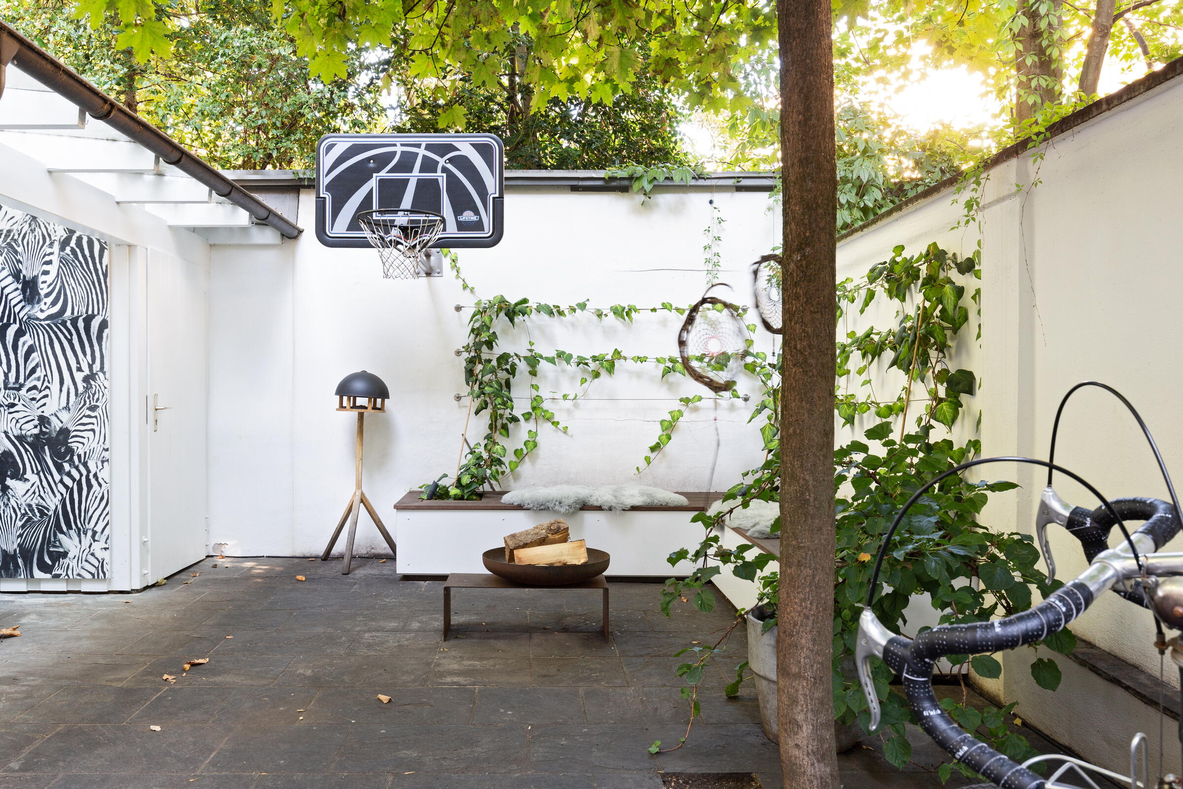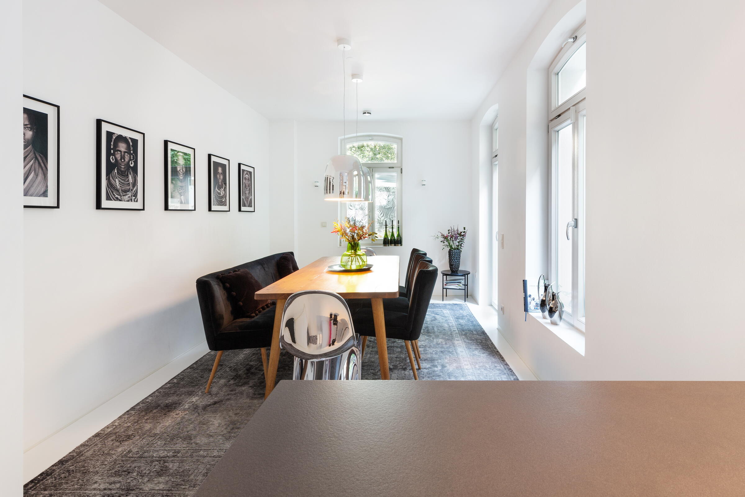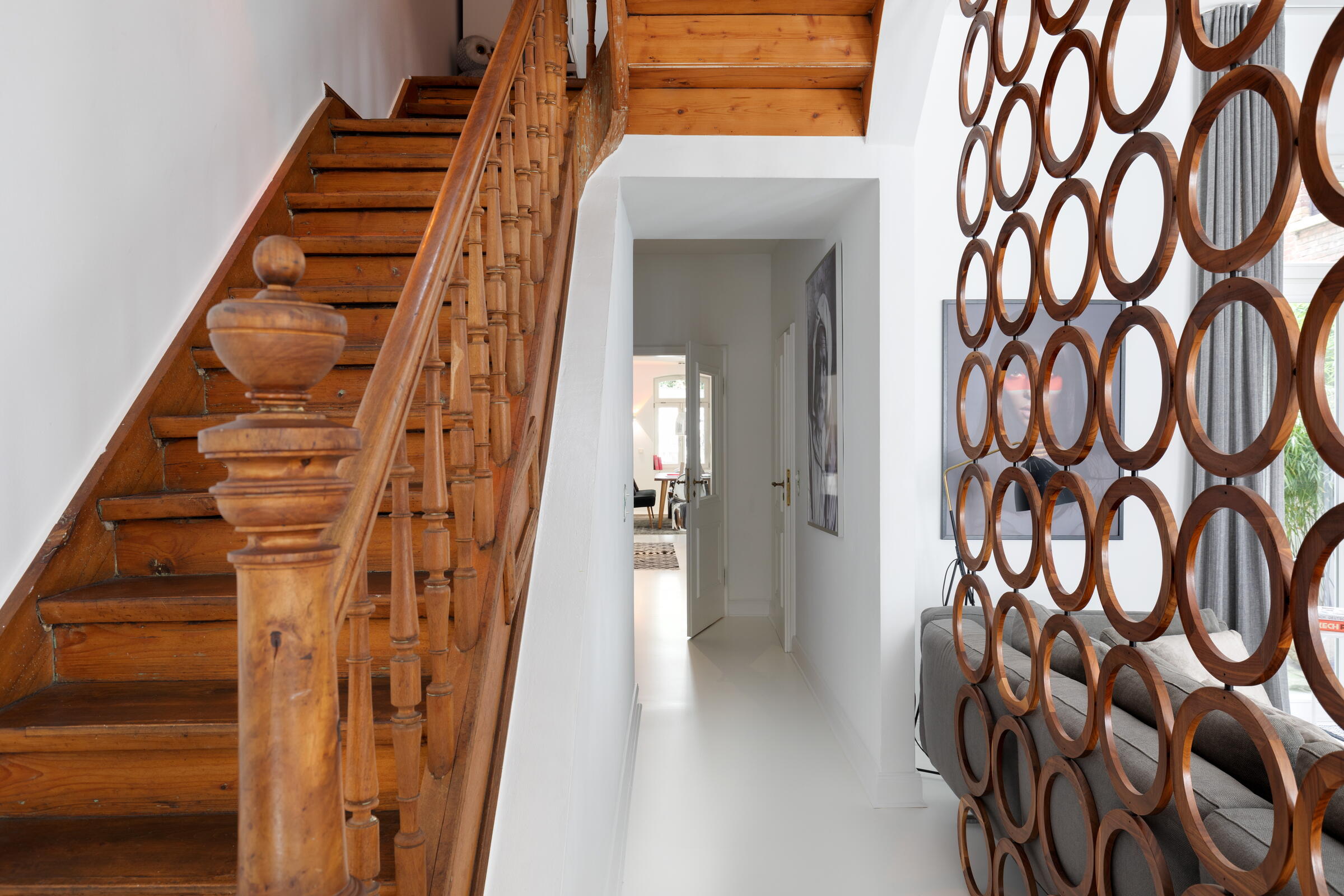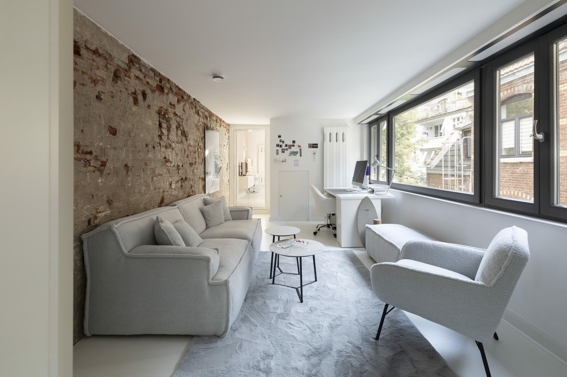 Unser außergewöhnliches und denkmalgeschütztes Stadthaus bietet eine Fläche von 240 m² und befindet sich in Köln-Nippes. Die hochwertig und designorientiert eingerichteten Räume des Hauses verteilen sich auf 2 Stockwerke. Die Böden der Räume bestehen aus fugenlosem weißen PU Boden oder Parkett. Die Fenster können mit Vorhängen und Jalousien abgedunkelt werden. Im Haus verteilt finden sich auch besondere Highlights wie beispielsweise ausgefallene Tapeten, eine Backsteinwand, eine alte Holztreppe und die denkmalgeschützte Eingangstür. Im Außenbereich gibt es einen sehr schönen und grün angelegten Innenhof.