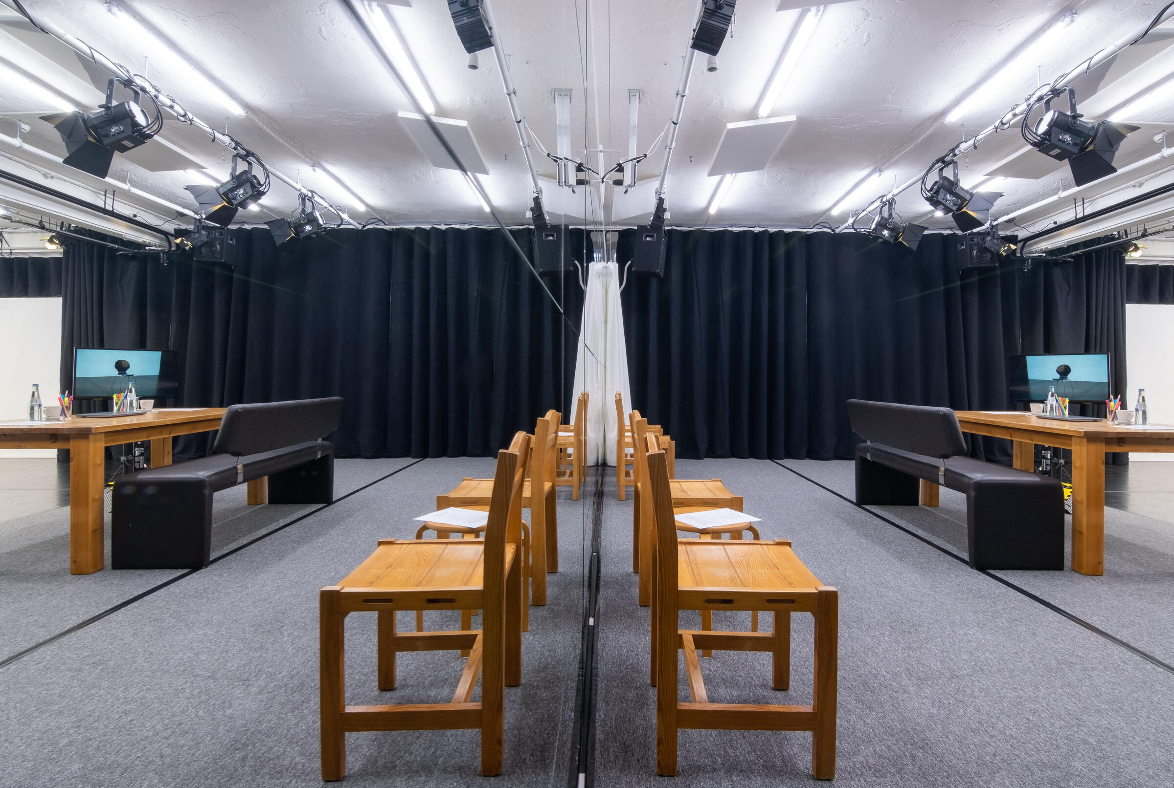 Das Studio umfasst etwa 95 m². Die Wände sind weiß. Ein an drei Seiten umlaufender Schwarzer Molton Schallschutzvorhang ist vorhanden. Es gibt eine große Metalltür mit Fensterscheiben und ein Oberlichtband. An der Decke hängen zur Hall-Dämpfung 2 Dutzend Styroporplatten und ein Traversensystem für Theater- und Filmlicht. Außerdem befinden sich an der Decke 18 LED-Röhren. Das Studio hat einen Sturz, der den Raum auf etwa der Hälfte schneidet. Er ist in etwa 2,30 m Höhe. Ansonsten hat der Raum eine Deckenhöhe von etwa 3 m. In der einen Ecke des Studio befindet sich eine Bodenklappe, um entweder die dahinterliegende Stahltür öffnen und begehen zu können oder im zugeklappten Zustand, den Boden komplett liegend zu haben. Die anderen Räume dienen dem Studio als Aufenthalts-, Empfangs-, Umkleide- und Küchenbereich.