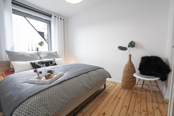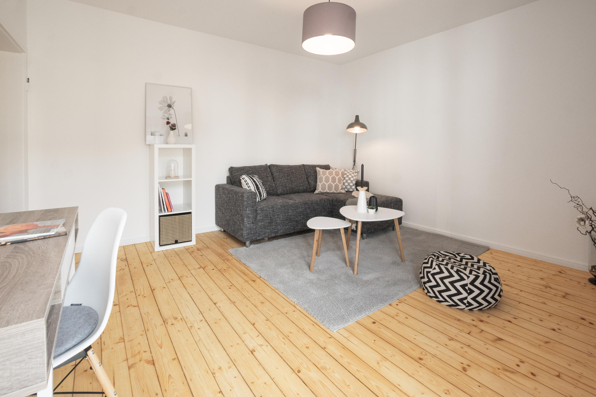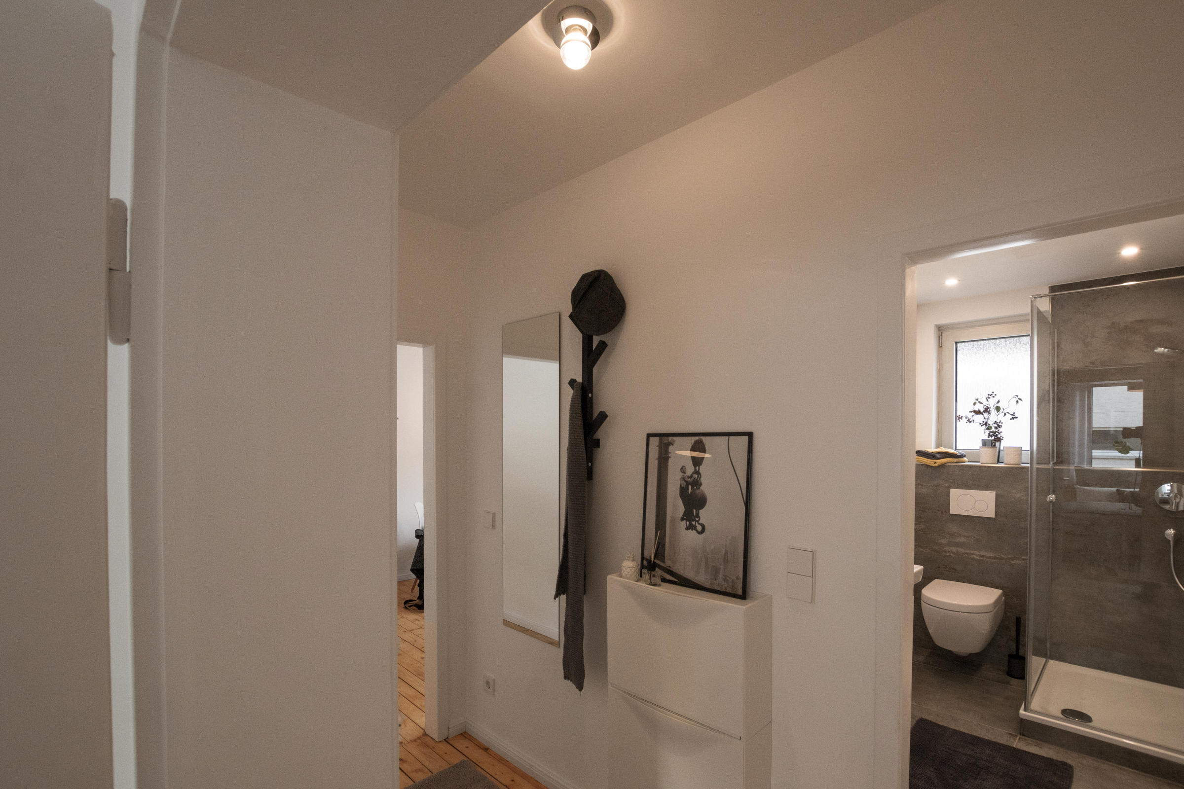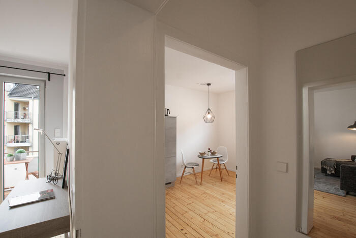 Rechtsrheinisch gelegene, schöne 2-Zimmerwohnung, in ruhiger, guter und doch zentraler Lage zur Messe in Köln-Buchheim, Nähe Mülheim. Die Wohnung ist frisch saniert und hat noch den Originaldielen-Fußboden aus den fünfziger Jahren, welcher komplett aufgearbeitet wurde. Die 50 m² Wohnung befindet sich in einem ruhigen 6-Familienhaus in der 2. Etage. Jeder Wohnraum ist komplett möbliert und mit Liebe zum Detail eingerichtet. Besonderes Augenmerk wurde auf die Ausstattung der Küche in Beton-Optik gelegt. Es gibt einen kleinen Süd-Balkon. Die Wohnung ist hell und lichtdurchflutet.