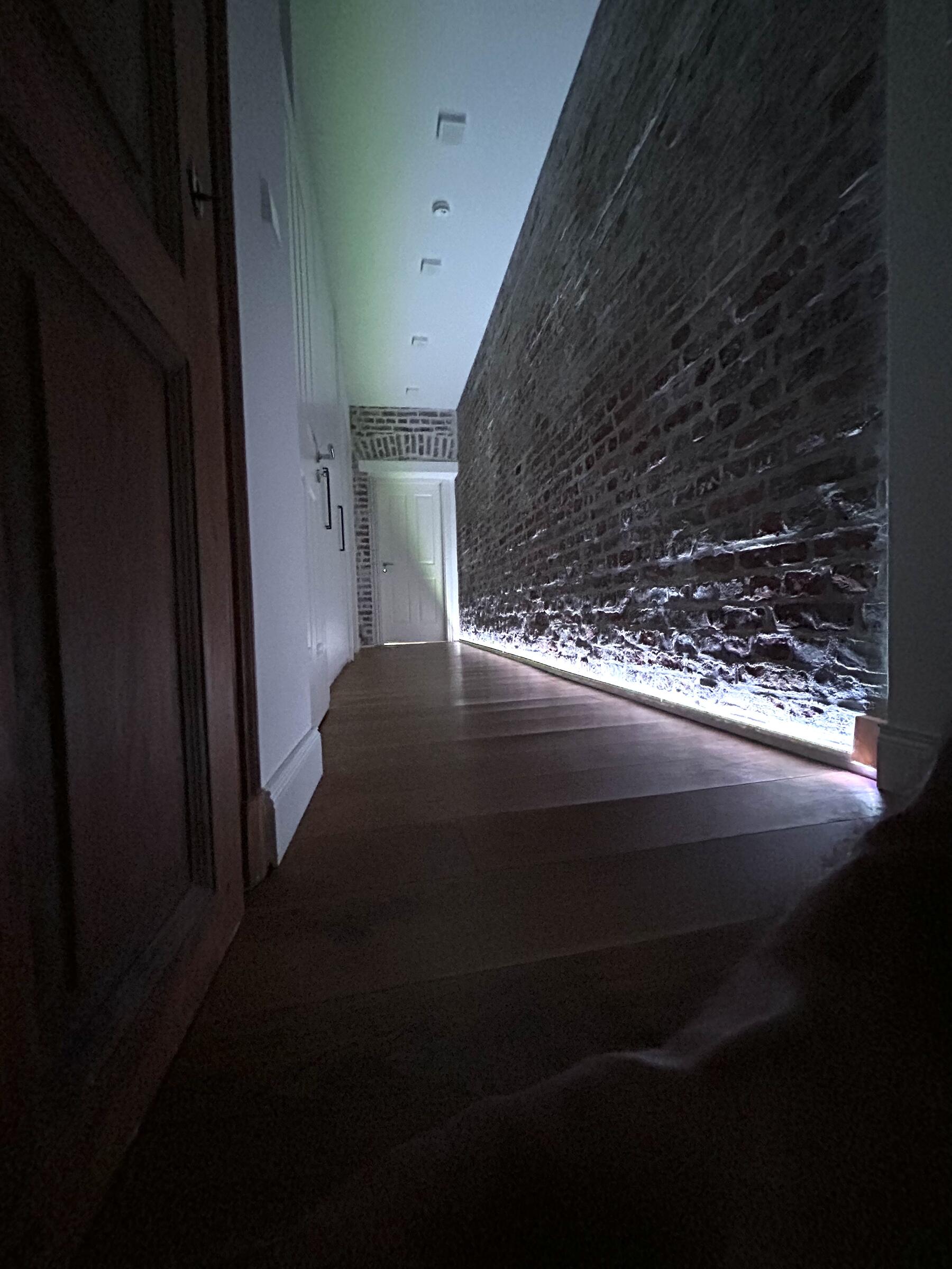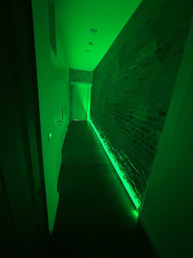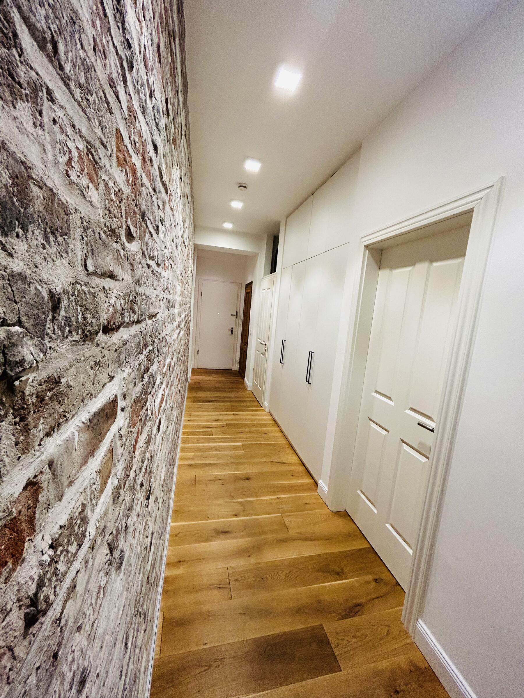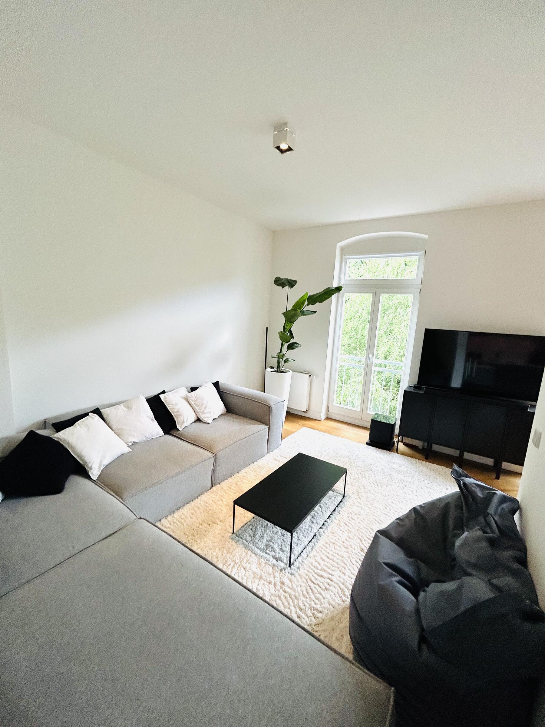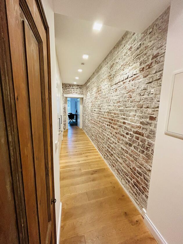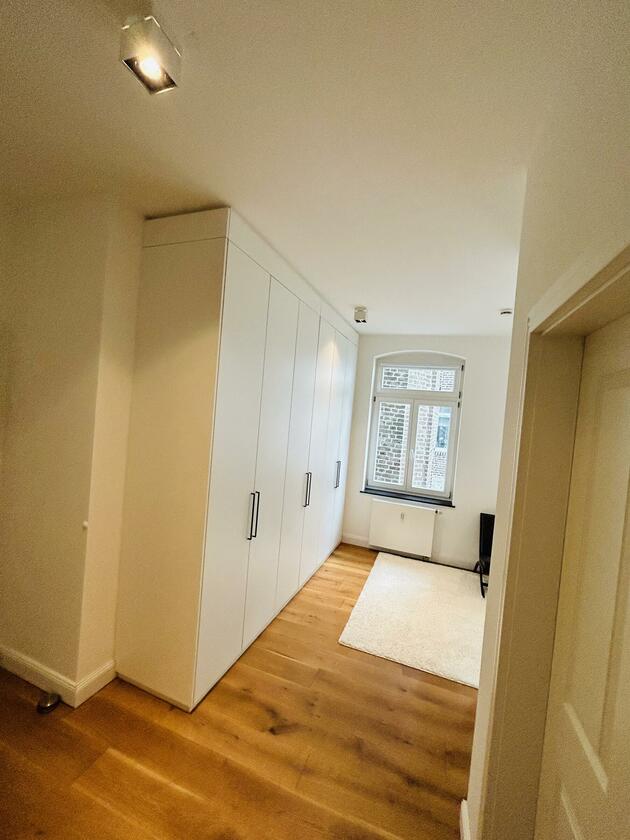Die sanierte Altbauwohnung befindet sich in einem denkmalgeschützten Wohnhaus in der Kölner Südstadt, nahe des Chlodwigplatzes. Hohe Decken, bodentiefe Fenster im Wohnbereich und Echtholzparkett sowie eine echte Backsteinwand verleihen ihr einen unverwechselbaren Charme. Im Bad wurden Metrokacheln verwendet. Im langen Flur befindet sich ein weißer, decken hoher Einbauschrank. Diesem gegenüber ist die Wand vom Putz befreit, sodass eine Backsteinwand zusehen ist. Diese setzt sich im Wohn- und Essbereich fort. Hier befindet sich eine graue Einbauküche sowie der geschmackvoll eingerichtete Wohnbereich. Der Schlafbereich besticht durch seine Aufteilung und den weißen decken hohen Einbauschrank. Die gesamte Wohnung ist mit LED Licht ausgestattet, welches mehrere Farben ermöglicht.