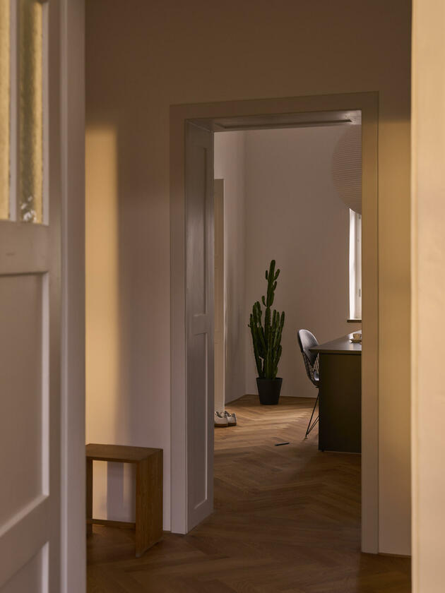 Die große Wohnung befindet sich in einem der frühen Wohnhäuser, die vom Kölner Architekten Wilhelm Riphahn stammen. Die Renovierung der Wohnung erfolgte unter Erhaltung der stilprägenden Elemente. Die Wohnung ist teilmöbliert. Die Wände der Räume sind glatt und weiß verputzt. Auf den Böden der Wohnräume wurde Fischgrätparkett in Eiche verlegt. Die offenporig lackierte Holzküche ist schokobraun und das Duschbad graublau gefliest. Die Fenster der Räume können mit Rolläden verdunkelt werden. Im Außenbereich stehen eine Terrasse und ein Garten zur Verfügung. Parkmöglichkeiten gibt es auf den öffentlichen Straßen.