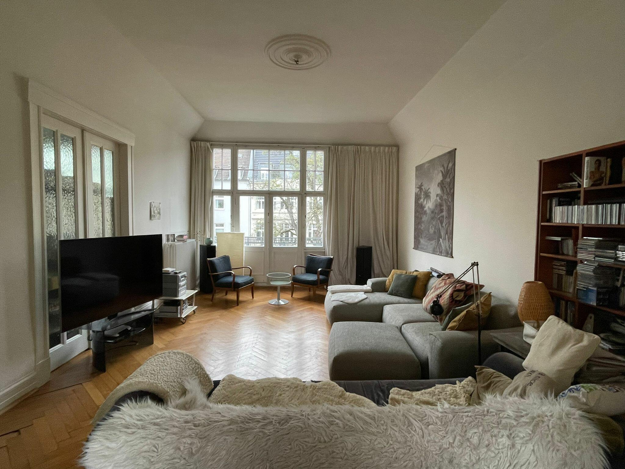 Die großzügige Altbauwohnung befindet sich im 4. Obergeschoss, ohne Aufzug, eines denkmalgeschützten Wohnhaus in der Kölner Südstadt. Vor ca. 20 Jahren wurden hier zwei Wohnungen zusammengelegt. Heute besticht der vordere Bereich der Wohnung mit hohen Stuckdecken, Flügeltüren und Fischgrätparkett sowie großzügigen, hellen Gemeinschaftsräumen. Das Wohnzimmer kann bei Bedarf durch eine Falttür von der Küche abgetrennt werden. Beide Räume haben einen eigenen Balkon und sind sehr hell. Im hinteren Wohnungsabschnitt schließen sich weitere Schlafzimmer mit weiß gestrichenem Dielenboden an, die teils mit eigenem Balkon, teils mit eigenem Bad bestechen.