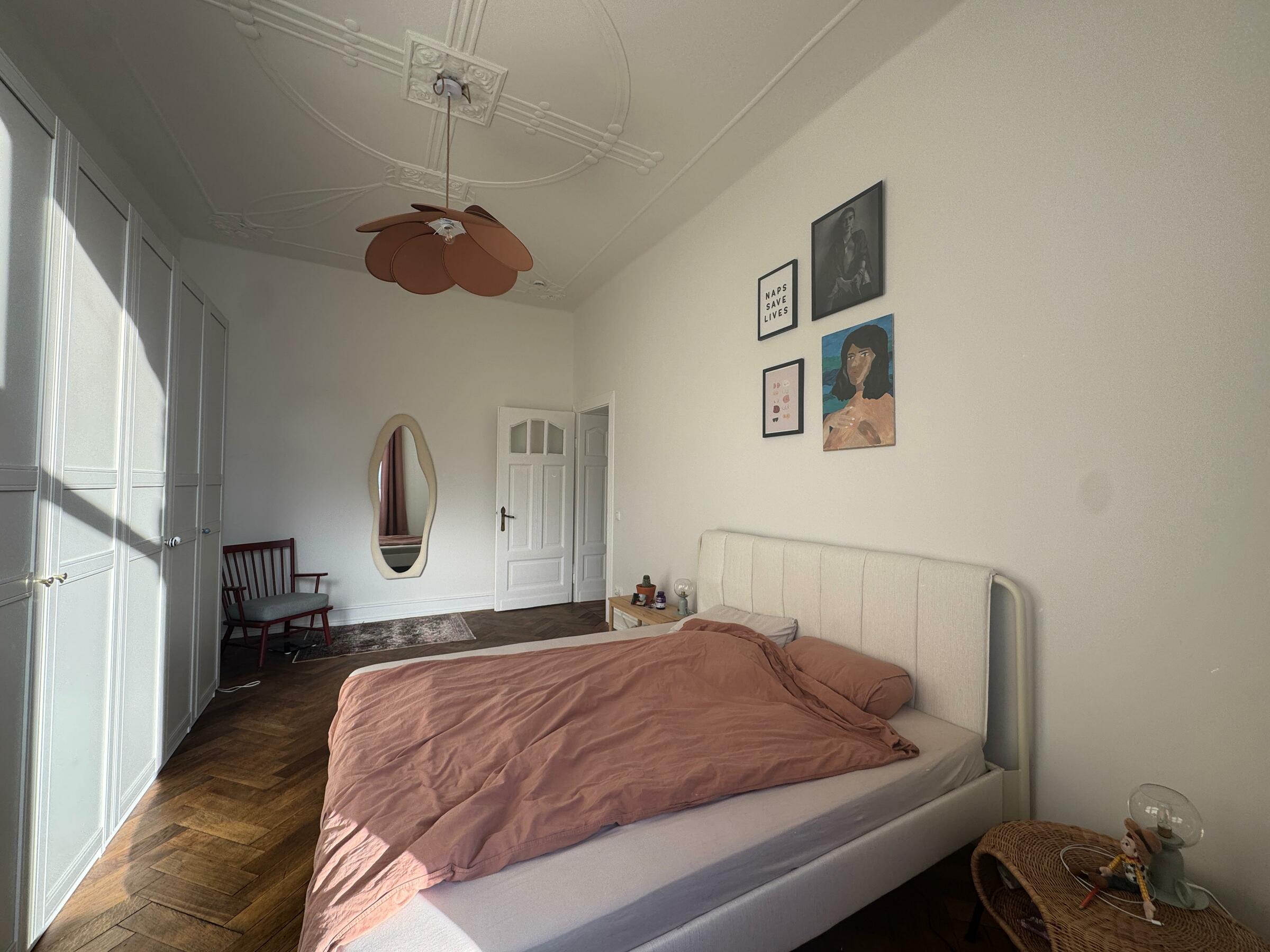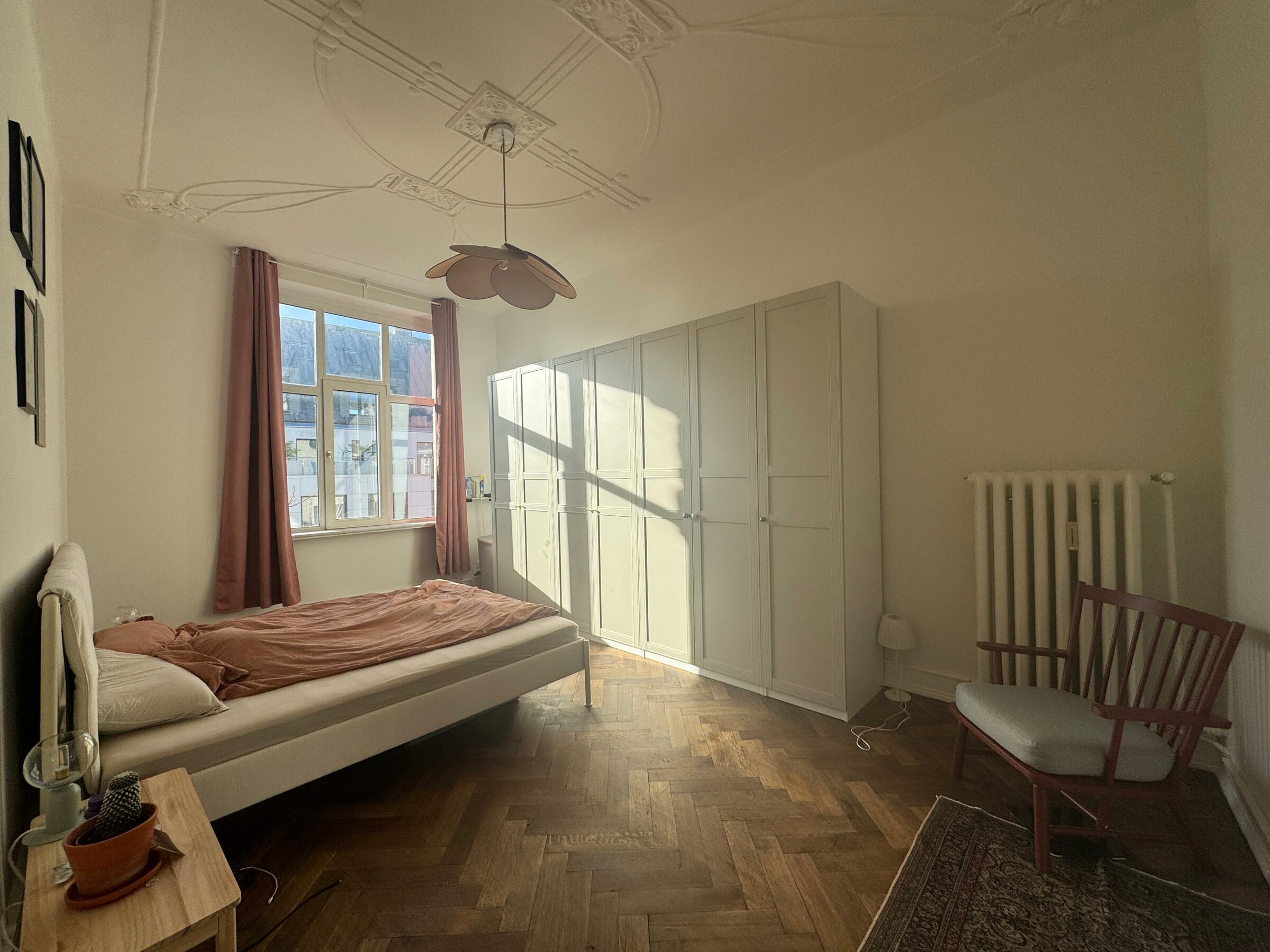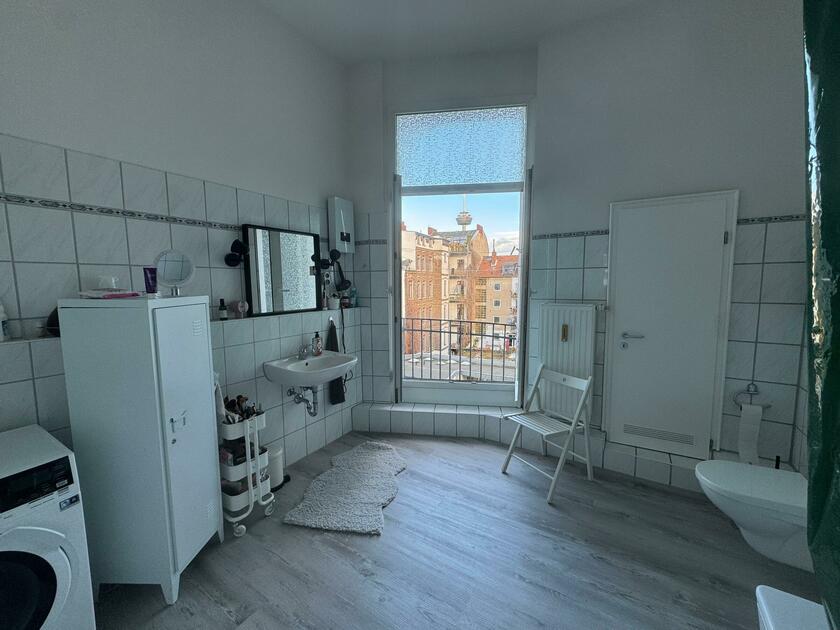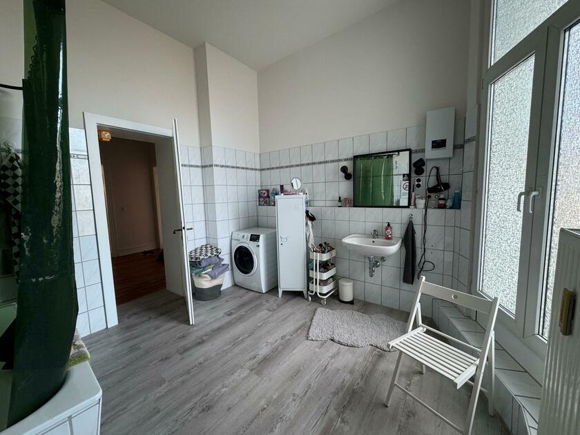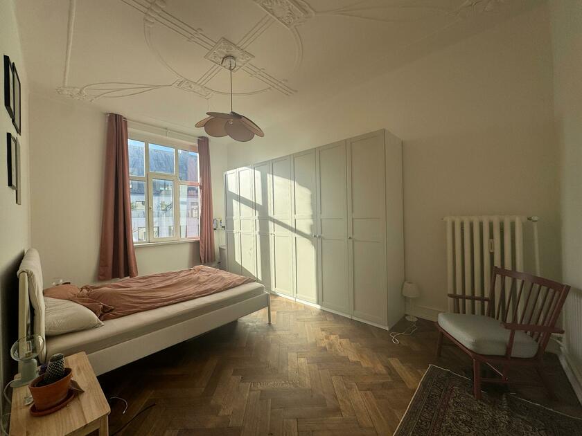 Die Altbauwohnung befindet sich im 3. Obergeschoss eines Wohnhauses in einer ruhigen Umgebung. Die Räume sind zeitgemäß und funktional möbliert und bieten hohe Decken, die teilweise mit Stuck verziert sind. Auf den Böden der Wohnräume ist hochwertiges Fischgrät-Parkett, im Flur Dielen und im Badezimmer Laminat verlegt worden. Die Räume haben große Fenster, die mit Hilfe von Vorhängen verdunkelt werden können. Die Räume dürfen nach Absprache umgestaltet werden. Parkplätze lassen sich an der am Haus vorbeiführenden Einbahnstraße oder im 4 min entfernten öffentlichen Parkhaus finden.