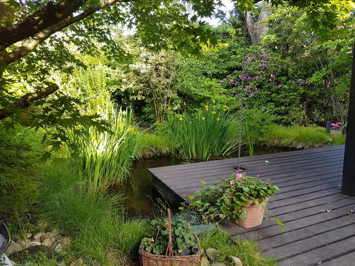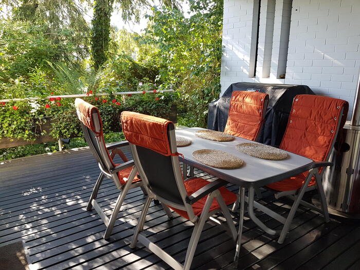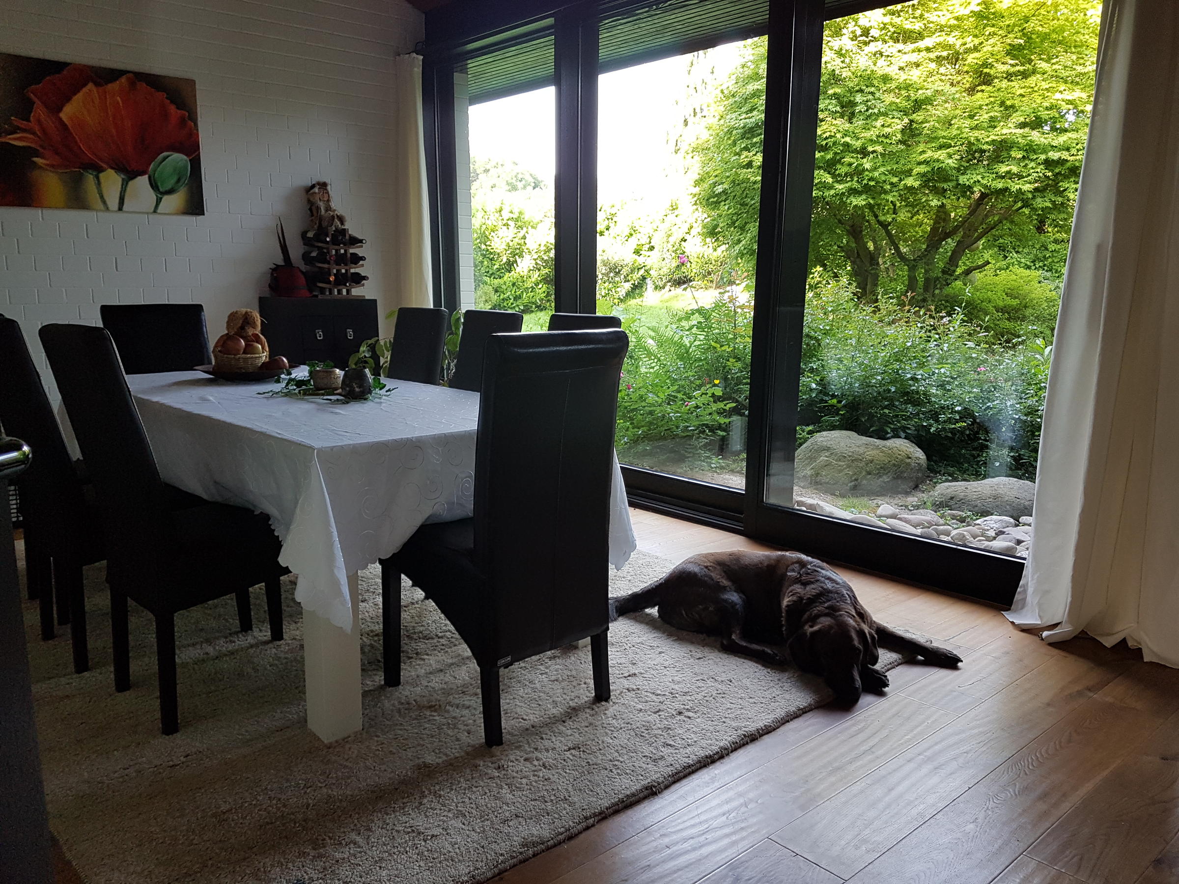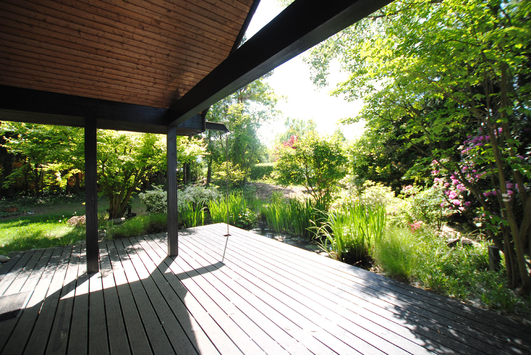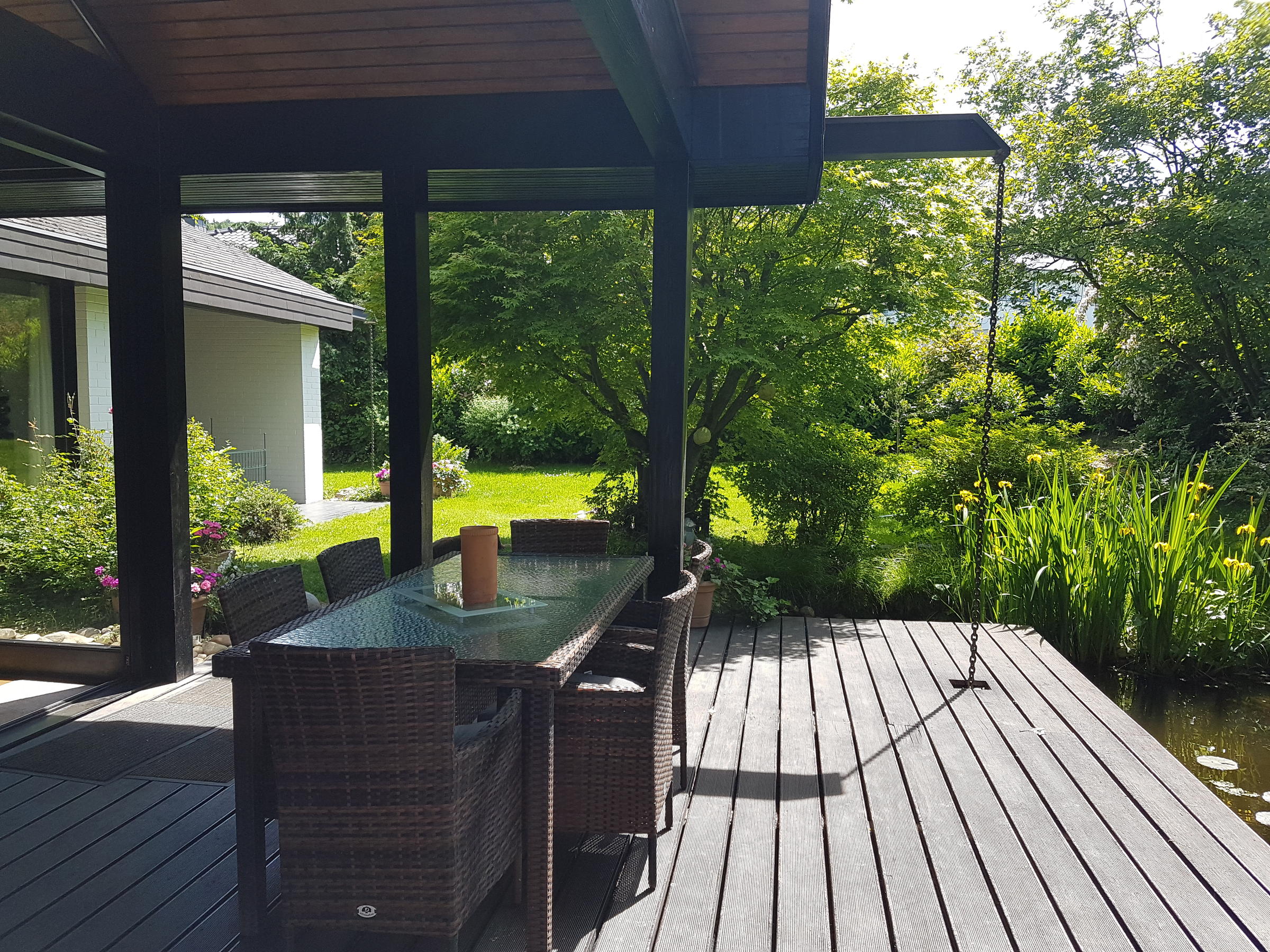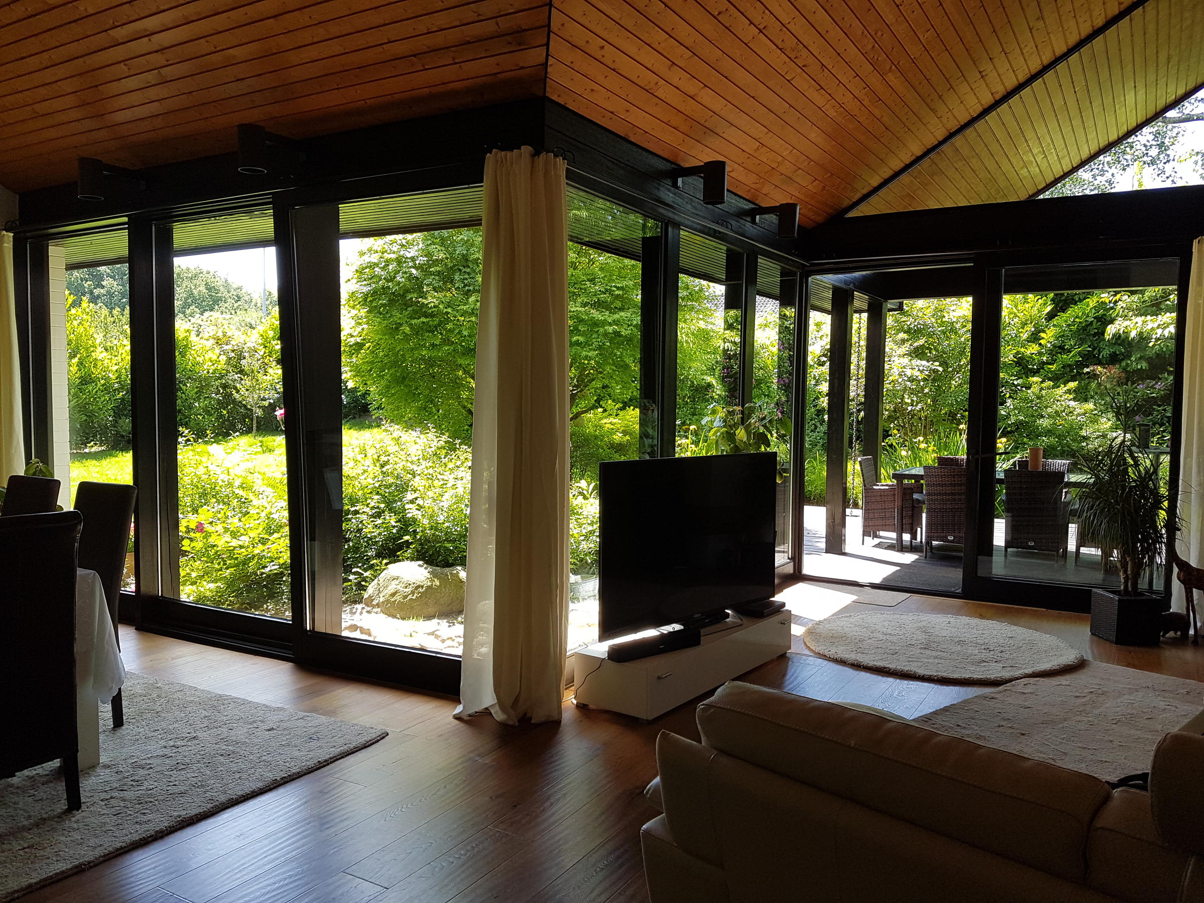 Unser Architektenhaus liegt nicht weit vom Oelberg im Siebengebirge entfernt. Unser Grundstück hat ca. 1000 m² und verfügt über 3 Terrassen. Eine Terrasse liegt direkt an unserem Teich, in dem Kois schwimmen. Die zweite Terrasse liegt direkt neben der Küche und verfügt über einen großen Webergrill. Die dritte Terrasse gehört zu einem Apartment, in dem sich eine Küchenzeile und eine Sitzecke befinden. Wir haben sowohl außen als auch innen im Haus einen Kamin. Das Wohnzimmer hat durch die Dachschrägen sehr hohe Wände. Das Esszimmer bzw. der Essbereich ist Teil des Wohnzimmers und oberhalb des Wohnzimmers befindet sich eine Galerie, die als Büro genutzt wird. In einem Badezimmer befindet sich eine im Boden eingelassene Badewanne. Drei Seiten vom Wohnzimmer sind komplett verglast, daher ist es immer hell und man hat das Gefühl, man würde im Garten wohnen. Die Wände sind alle mit Gemälden versehen. Im Haus befindet sich im Keller ein Fitnessraum mit Sauna und Ruheraum. Unser Wohnzimmer, aber auch die anderen Räume, so wie unsere Gartenanlage bieten viele Möglichkeiten, Kulissen und Motive für Film- und Fotoproduktionen. Das Haus liegt verkehrsgünstig zur A3 und zur A59 in den Regierungsbezirken Köln und Bonn.