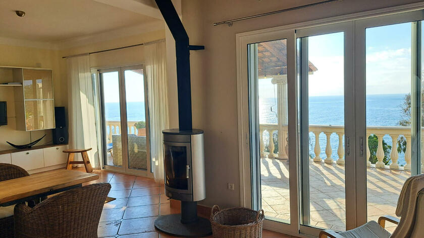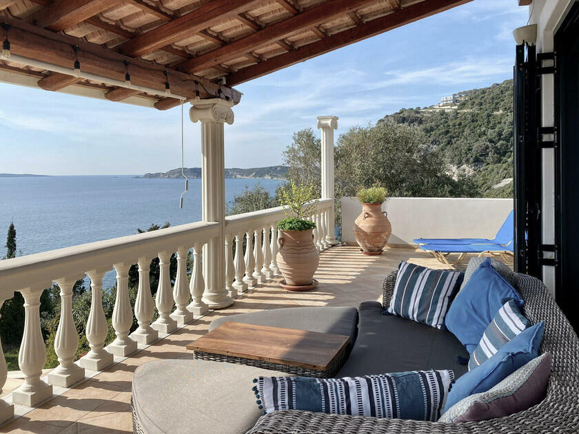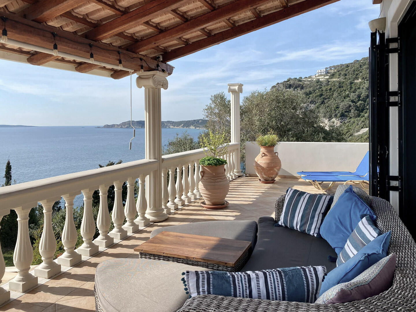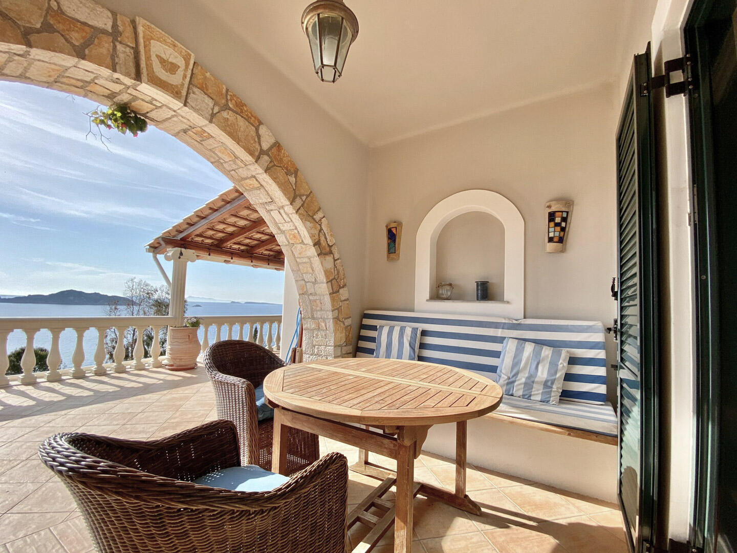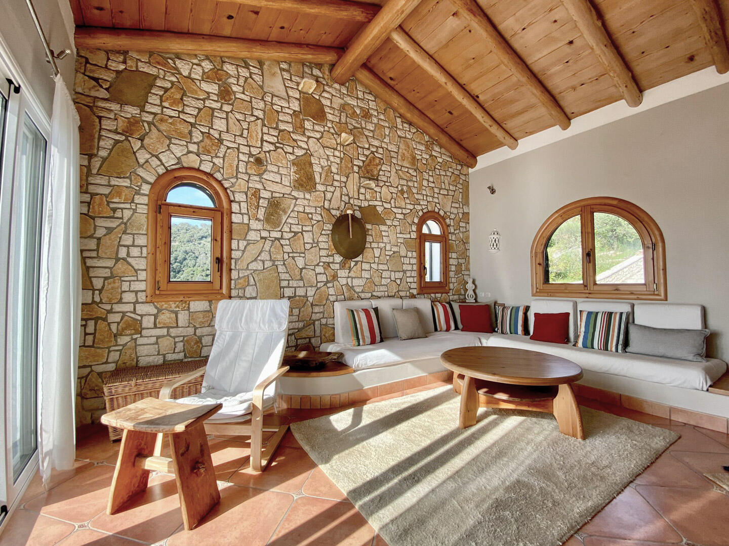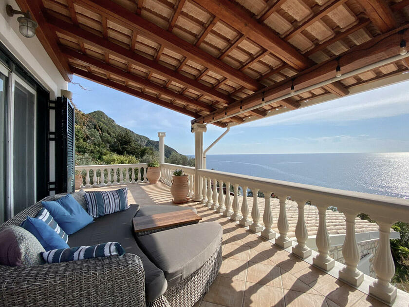 Die Villa befindet sich abseits eines kleinen Bergdörfchens im Nordwesten der Insel Korfu. Die hellen und lichtdurchfluteten Wohnräume des Hauses erstrecken sich über 2 Etagen. Das Haus bietet einen offenen Wohn- und Essbereich der in die offen gestaltete Küche übergeht. Die große Küche verfügt über eine Kücheninsel, eine Theke und Sitzgelegenheiten. In der oberen Etage befinden sich Schlafzimmer mit jeweiliger Veranda. Im Außenbereich bietet das Haus eine großzügige Terrasse und einen Garten. Das Haus bietet in alle Richtungen unverbauten Blick ins Grüne oder direkt aufs Meer. Es sind lediglich ein paar Schritte über das private Gelände und den Felsen bis zum Meer. Über einen unbefestigten Weg gelang man vom Dorf hinunter zur Villa, wo es Parkmöglichkeiten direkt vor den Eingängen gibt. Ein Allradfahrzeug ist empfehlenswert. Vom Flughafen Kerkyra sind es ca. 60 min Autofahrt bis zum Haus.