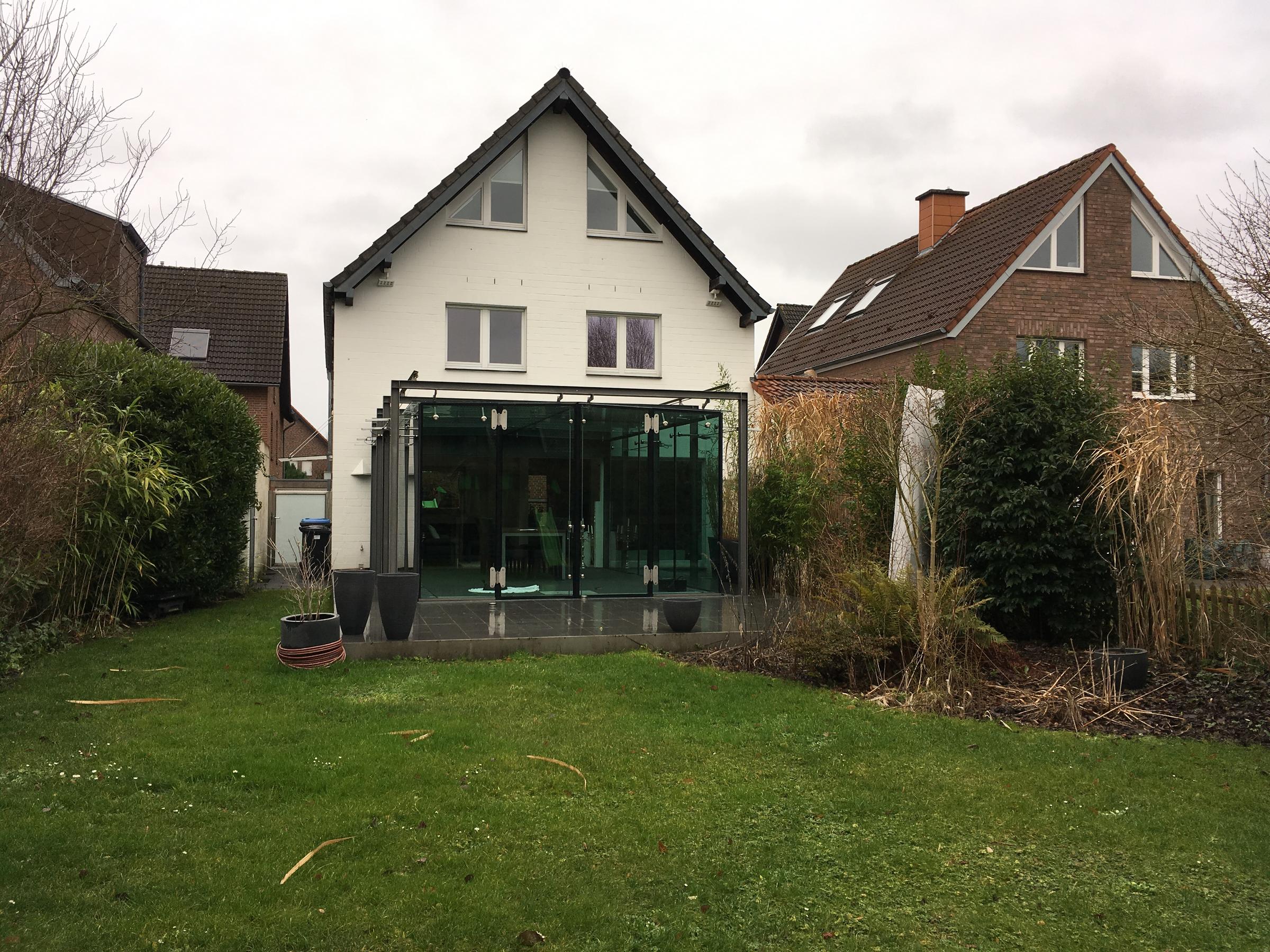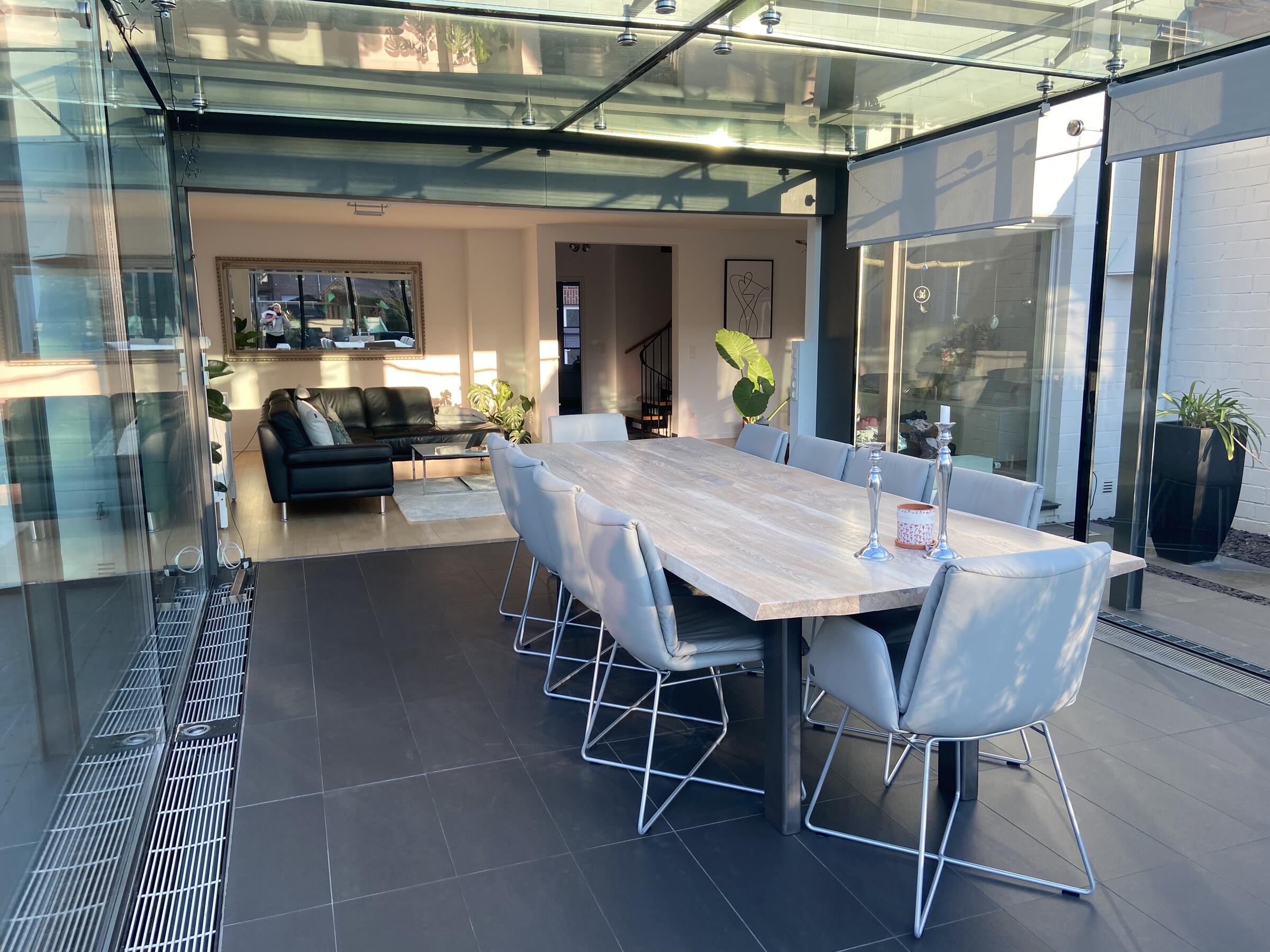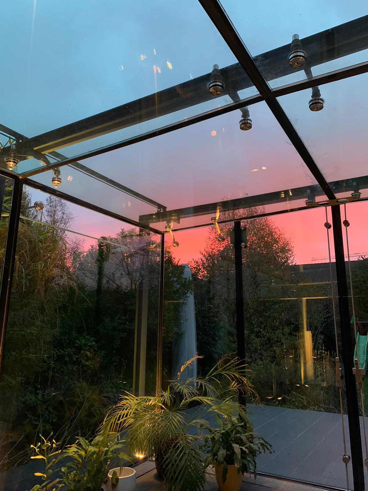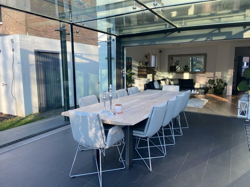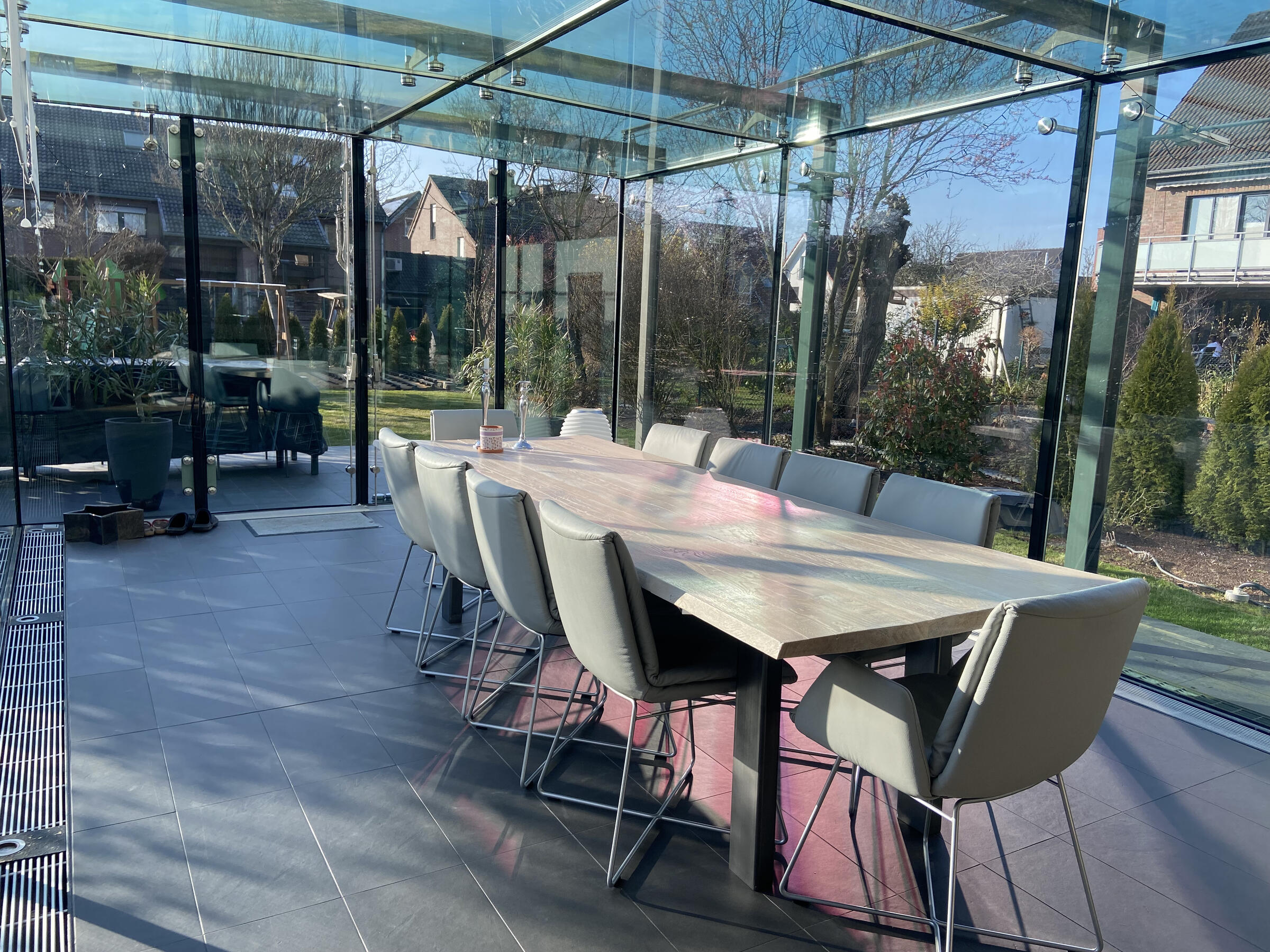 Die puristische Glaskonstruktion des Wintergartens öffnet und erhellt das Wohnzimmer, wo wunderbare Aufnahmen gedreht werden können. Jeweils zwei der Fenster an den beiden Seitenfronten lassen sich elektrisch aufkippen. Zudem gibt es zwei Flügeltüren, die sich zur Terrasse hin öffnen lassen.