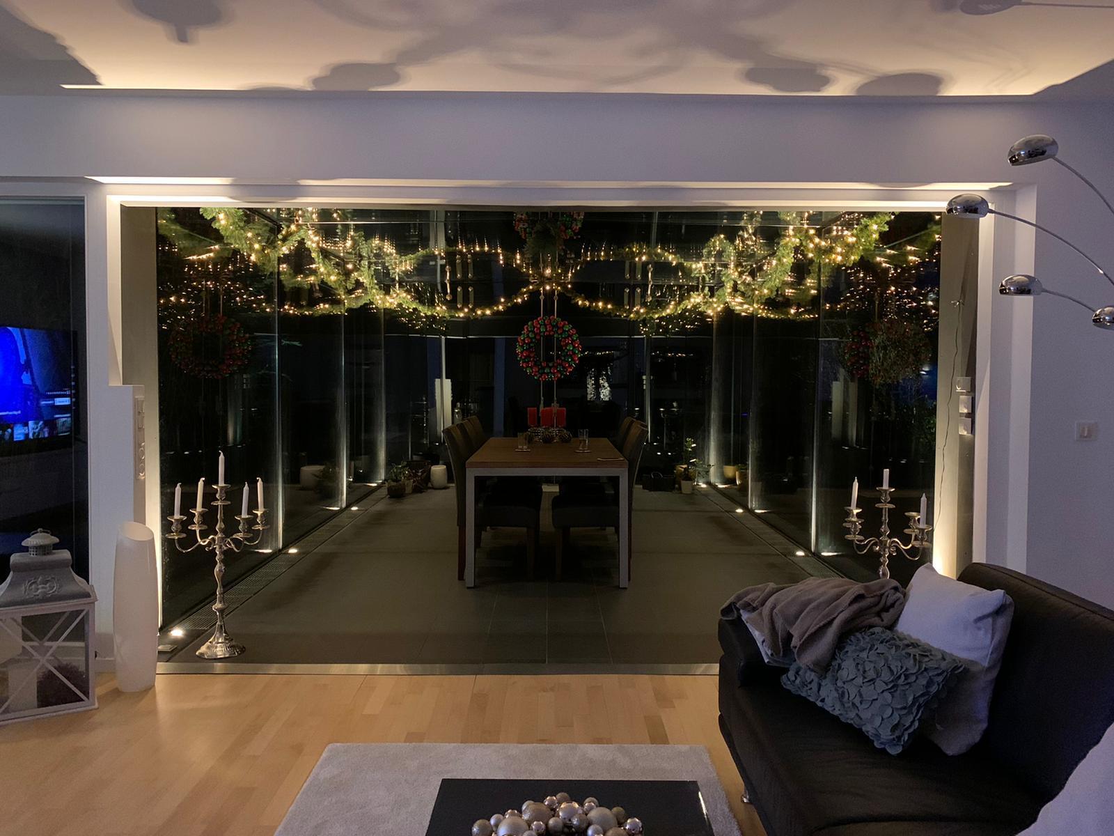 Das große Wohnzimmer bietet ausreichend Platz und durch die gesamte Front zum Garten, ist der Raum tagsüber von Licht durchflutet. Am Abend können die Spotlichter im Wintergarten angeschaltet werden, was einen unglaublichen Effekt hervorbringt.