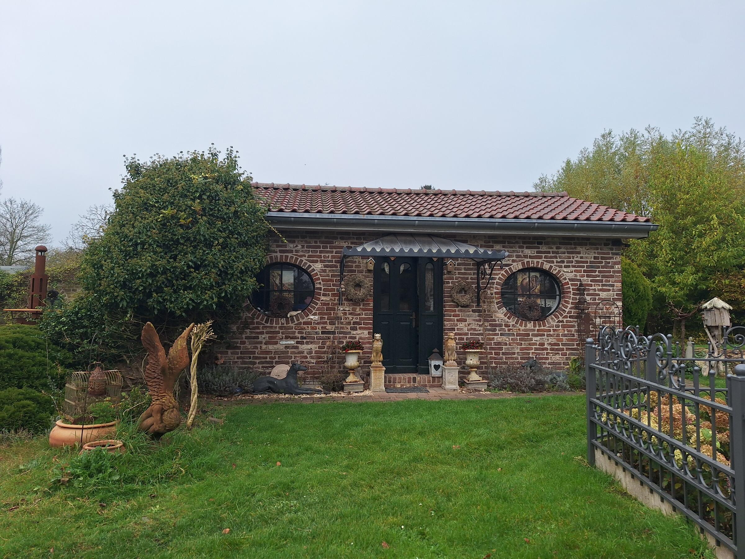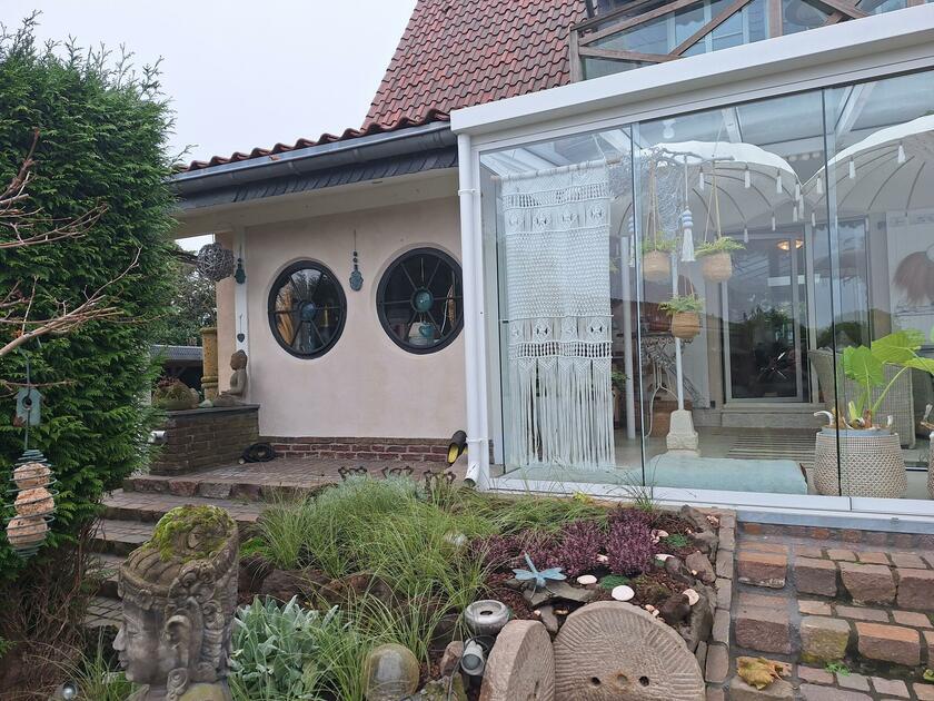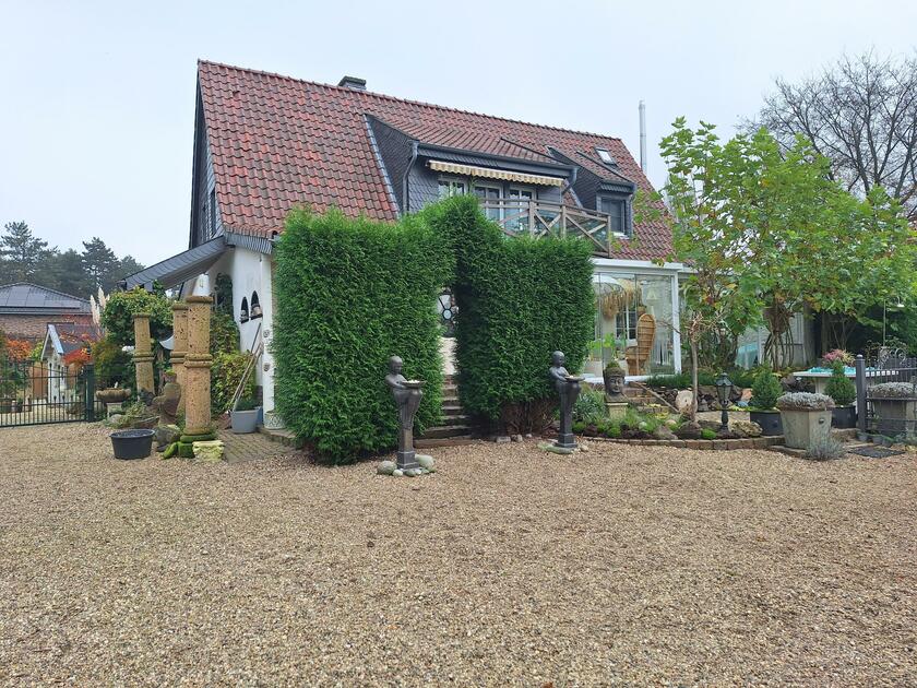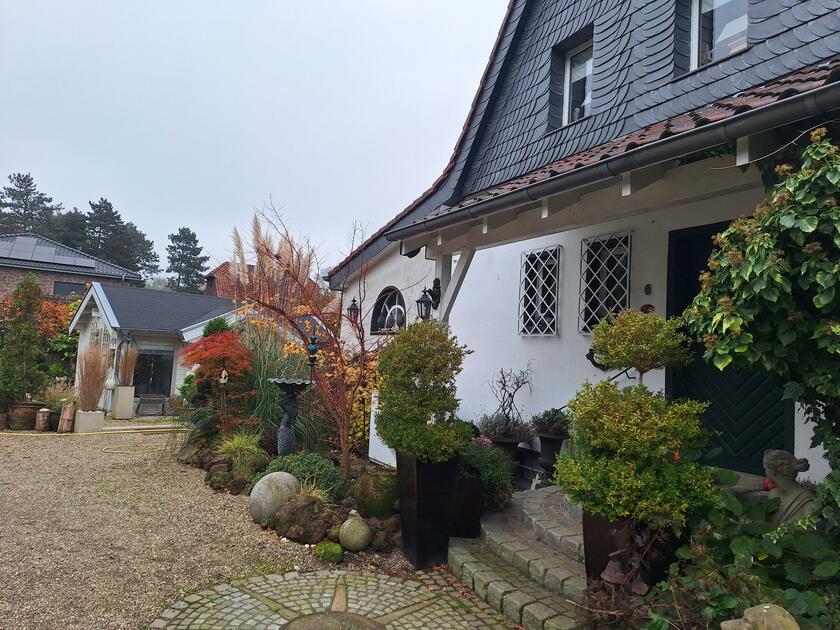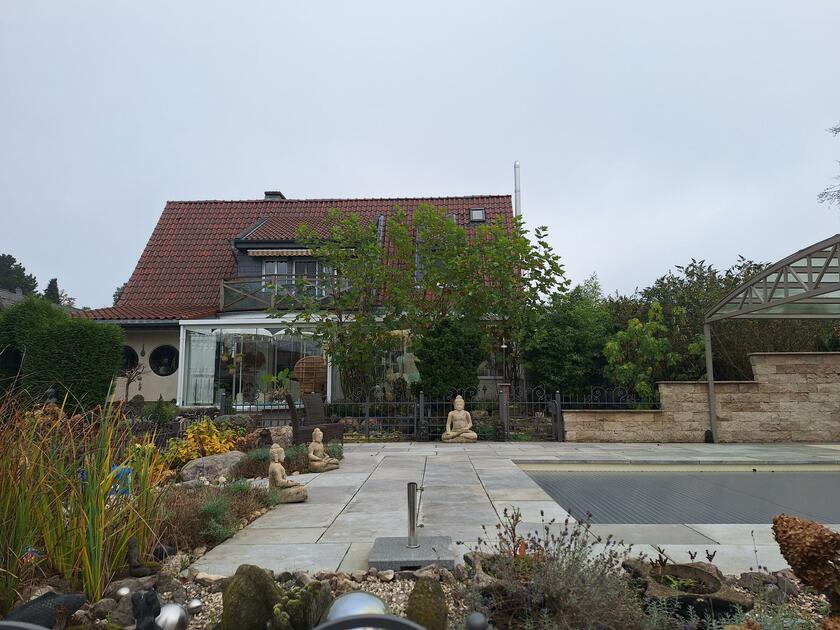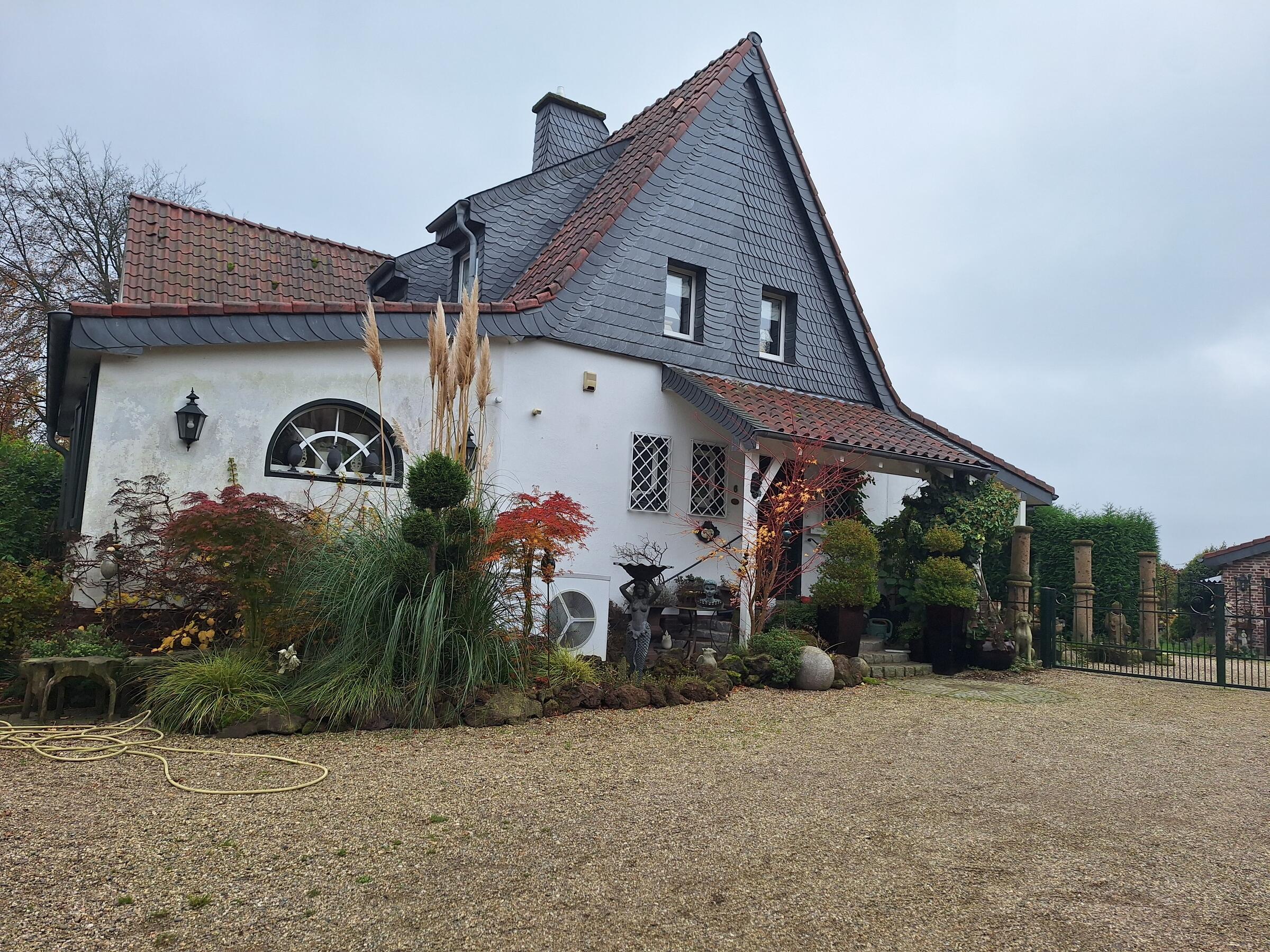 Unser Landhaus befindet sich in einer ruhigen Wohngegend, an einem Landschaftsschutzgebiet und umgeben von Feldern. Durch die teilweise bodentiefen Fenster fällt viel Tageslicht in die Wohnräume. Die Böden der Räume sind gefliest. Die Fenster der Räume können mit Vorhängen und teilweise mit Fensterläden verdunkelt werden. Die Räume dürfen nach Absprache umgestaltet werden. Im Außenbereich stehen der große Garten und der Pool zur Verfügung. Die Auffahrt unseres Grundstückes kann mit Lkw bis zu 7,5 t befahren werden. Mehrere Pkw können ebenfalls auf unserem Grundstück geparkt werden.