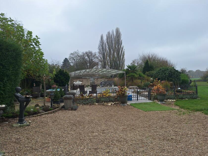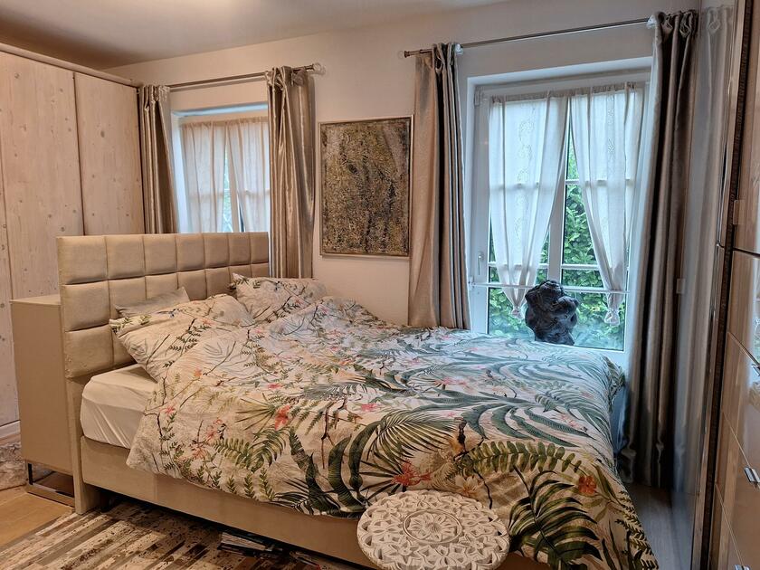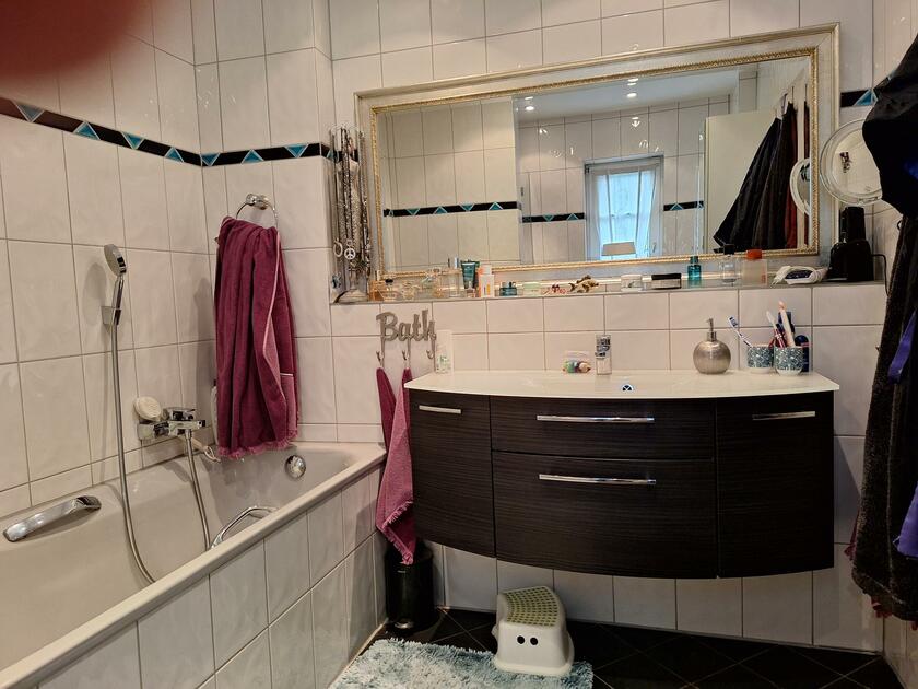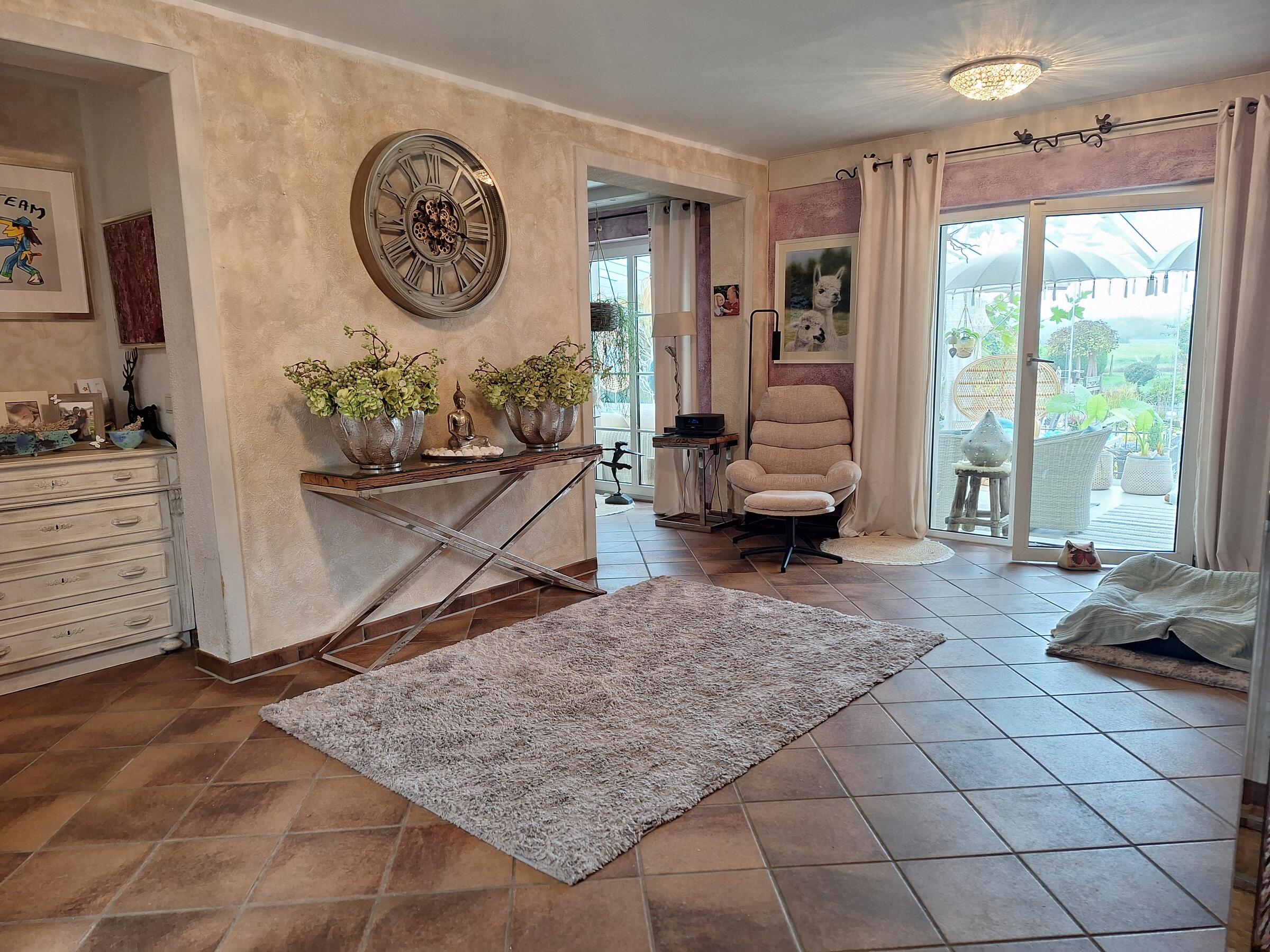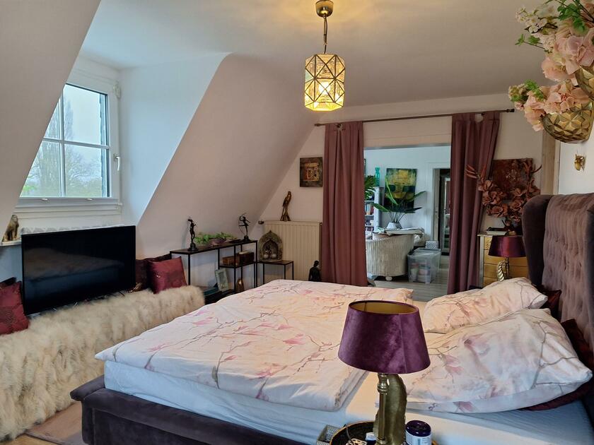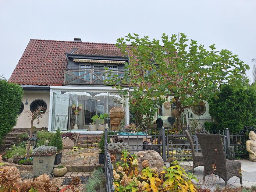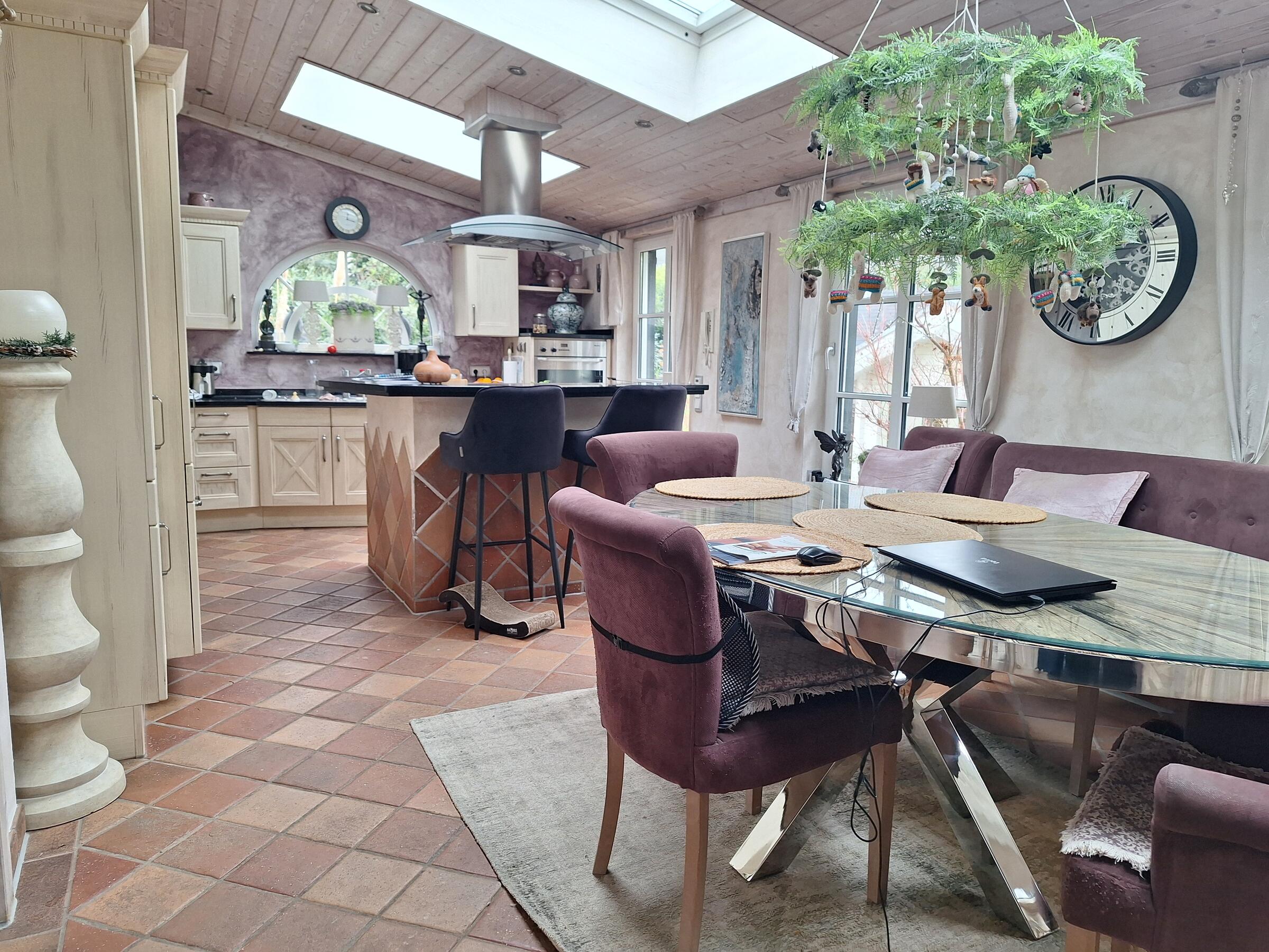 Unser Landhaus befindet sich in einer ruhigen Wohngegend, an einem Landschaftsschutzgebiet und umgeben von Feldern. Durch die teilweise bodentiefen Fenster fällt viel Tageslicht in die Wohnräume. Die Böden der Räume sind gefliest. Die Fenster der Räume können mit Vorhängen und teilweise mit Fensterläden verdunkelt werden. Die Räume dürfen nach Absprache umgestaltet werden. Im Außenbereich stehen der große Garten und der Pool zur Verfügung. Die Auffahrt unseres Grundstückes kann mit Lkw bis zu 7,5 t befahren werden. Mehrere Pkw können ebenfalls auf unserem Grundstück geparkt werden.