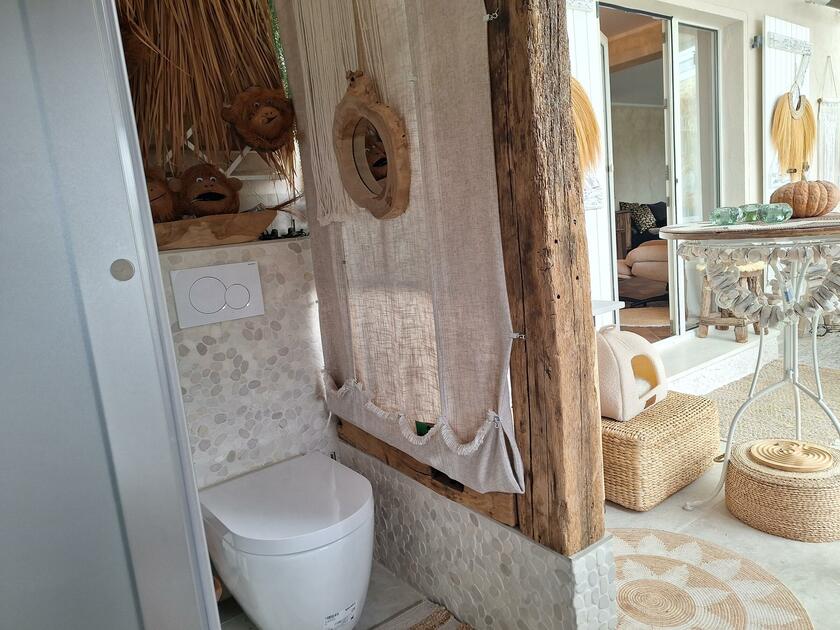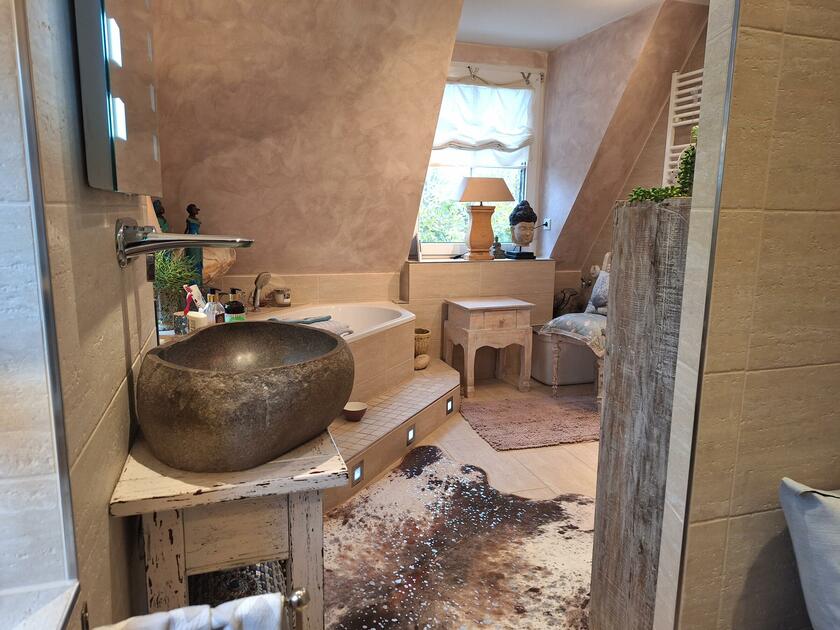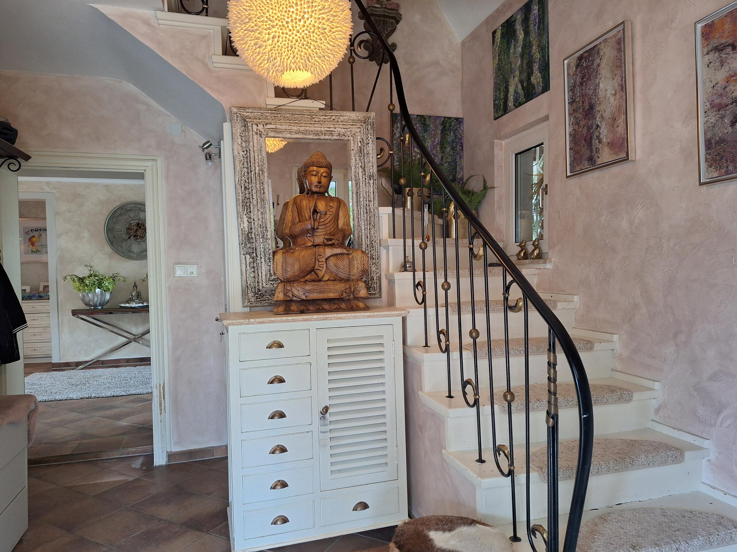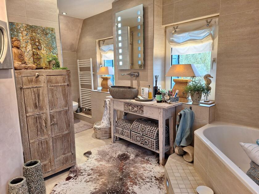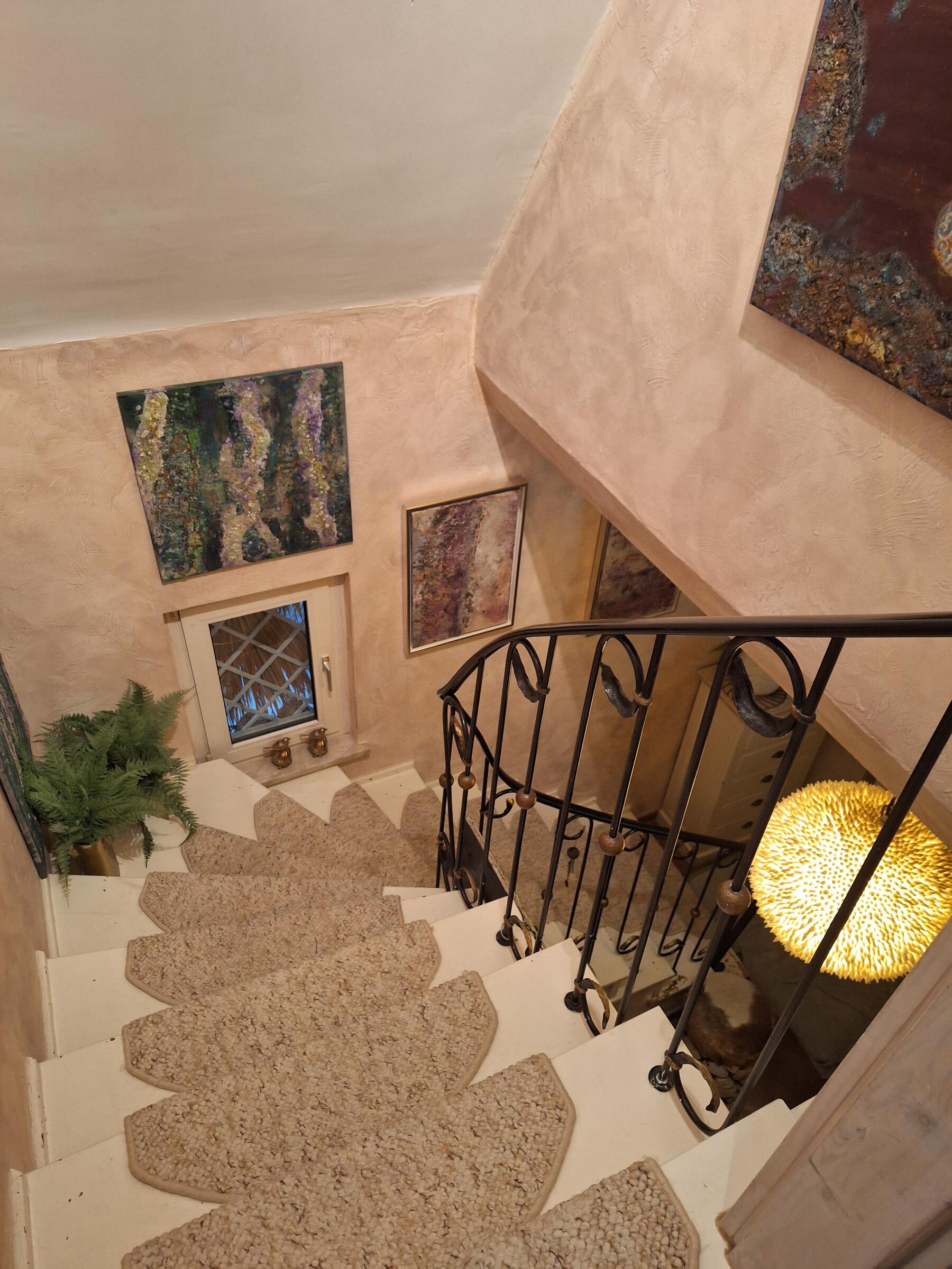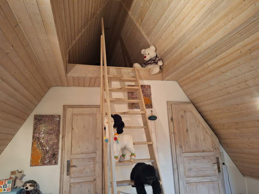 Unser Landhaus befindet sich in einer ruhigen Wohngegend, an einem Landschaftsschutzgebiet und umgeben von Feldern. Durch die teilweise bodentiefen Fenster fällt viel Tageslicht in die Wohnräume. Die Böden der Räume sind gefliest. Die Fenster der Räume können mit Vorhängen und teilweise mit Fensterläden verdunkelt werden. Die Räume dürfen nach Absprache umgestaltet werden. Im Außenbereich stehen der große Garten und der Pool zur Verfügung. Die Auffahrt unseres Grundstückes kann mit Lkw bis zu 7,5 t befahren werden. Mehrere Pkw können ebenfalls auf unserem Grundstück geparkt werden.