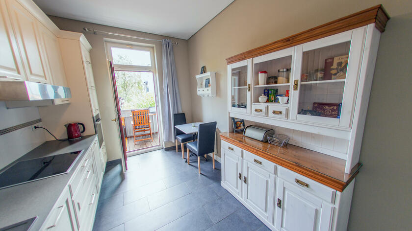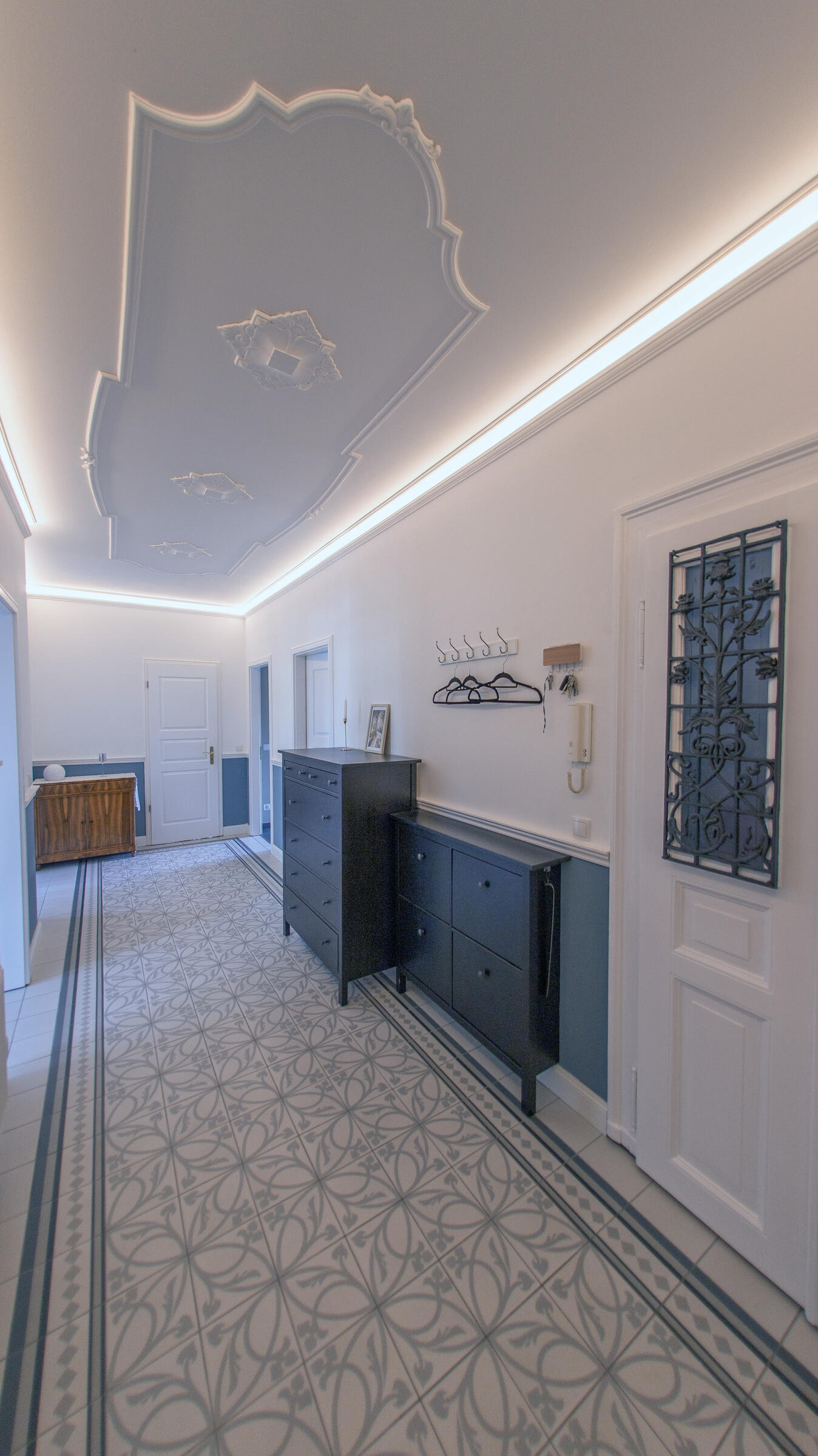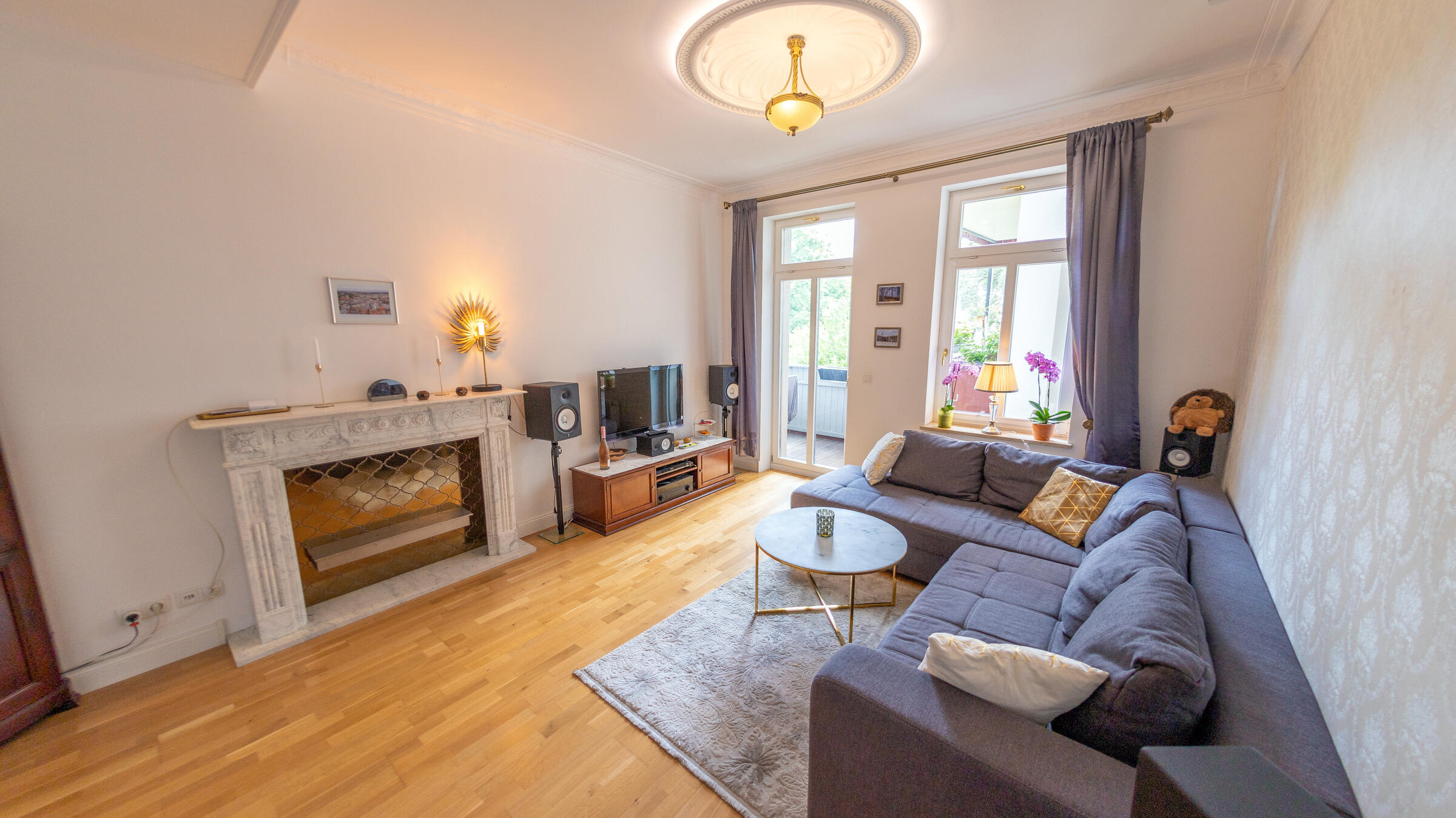 Meine Eigentumswohnung befindet sich im 1. Obergeschoss eines Mehrfamilienhauses, das im Jahr 1907 fertiggestellt wurde. Das Gebäude ist von baugeschichtlicher Bedeutung. Die Wohnung selbst ist umfassend saniert und in mängelfreien Zustand. Bei der Auswahl der verbauten Materialien (Parkett, Stuck, Mobiliar und Tapeten) wurde auf Hochwertigkeit und Qualität gesetzt. Die Wohnung verfügt über drei großzügig geschnittene Zimmer. Ein Südbalkon ist ebenfalls vorhanden, der sowohl von der Küche als auch vom Wohnzimmer aus begehbar ist. Das Tageslichtbad bietet eine Badewanne mit Regenwalddusche sowie moderne Hängeschränke mit verspiegelten Glasfronten. Im Deckenbereich der Wohnräume wurde Echtgips-Stuck mit sehr besonderem Design verarbeitet. Die Böden sind mit Parkett oder modernen Fliesen gestaltet. Im Sockelbereich der Böden wurden weiße Massivholzleisten Berliner Profil mit 12 cm Höhe angebracht.
