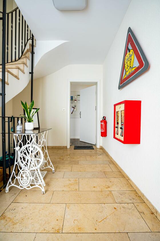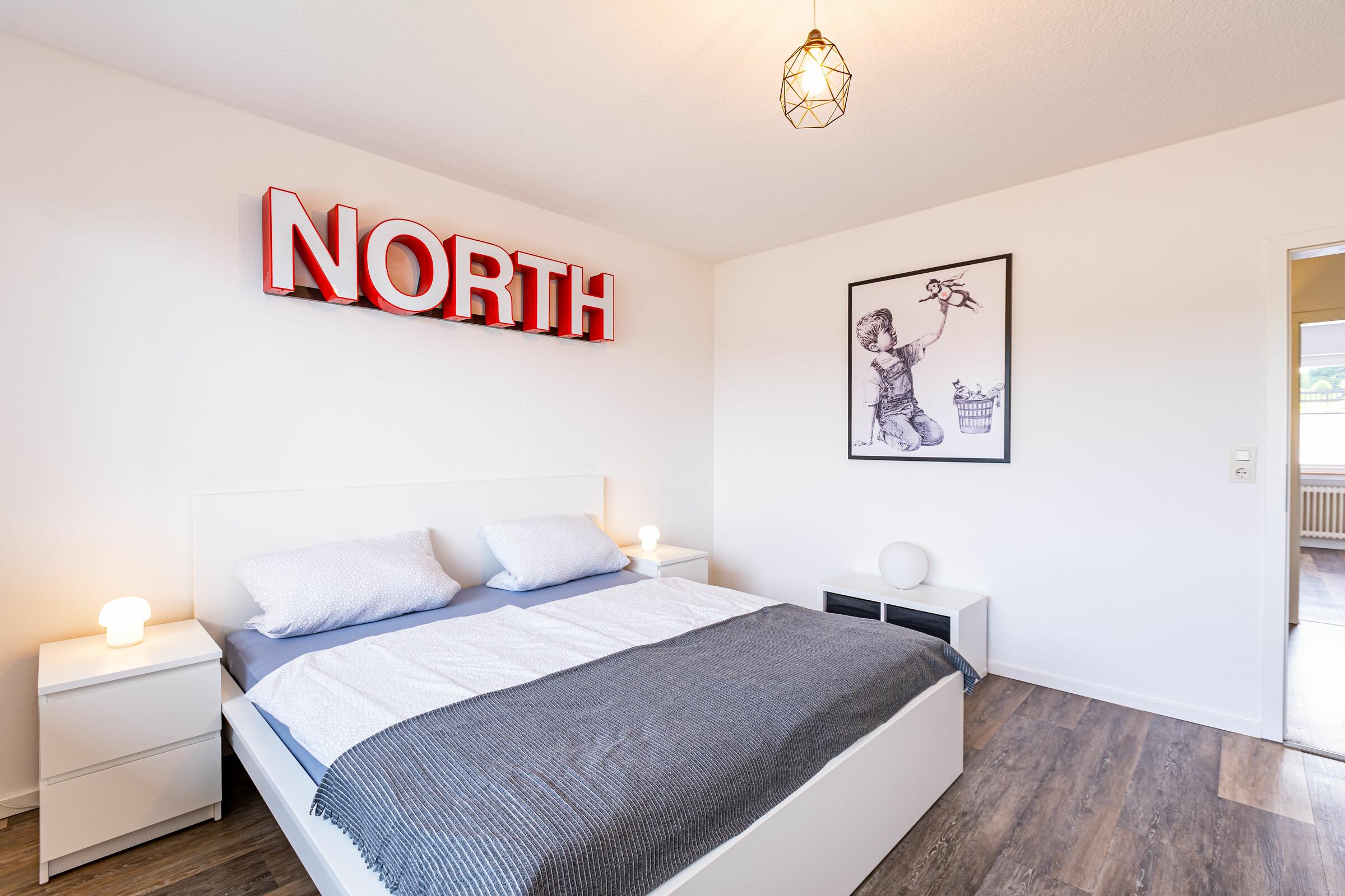 Unsere helle und moderne Architektenwohnung ist geschmackvoll mit Design-Klassikern eingerichtet. Das große und lichtdurchflutete Wohnzimmer bietet viel Platz für Produktionen. In der modern eingerichteten Küche befindet sich ebenfalls ein großer Esstisch, der 8 Personen Platz bietet. Die Fenster aller Räume der Wohnung können mit Rollläden abgedunkelt werden. Die Böden der Räume sind mit hochwertigem Laminat ausgelegt. Die Wände sind alle weiß gestrichen. Die große Terrasse ist vollständig überdacht. Es stehen 3 kostenfreie Parkplätze sowie eine verschließbare Garage für Ihre Produktion zur Verfügung.