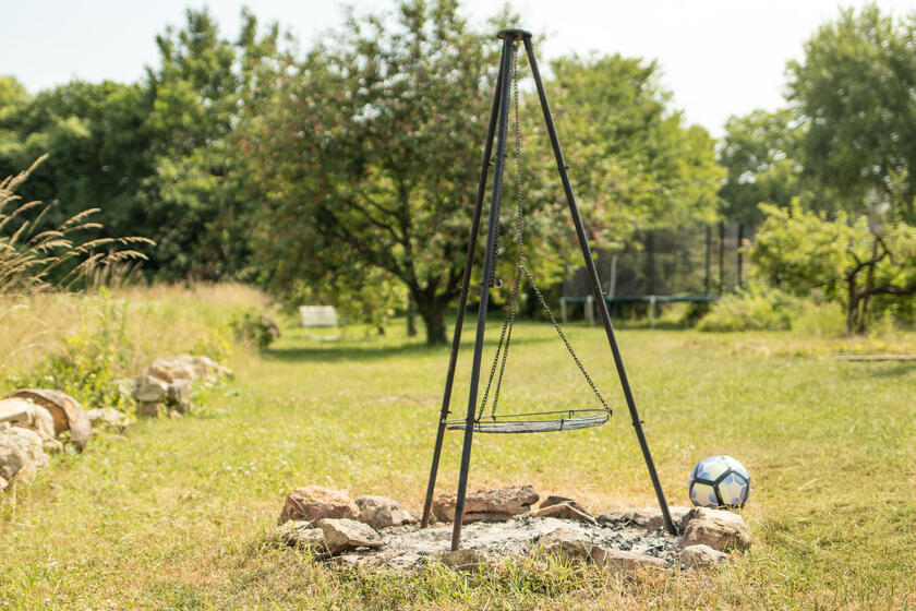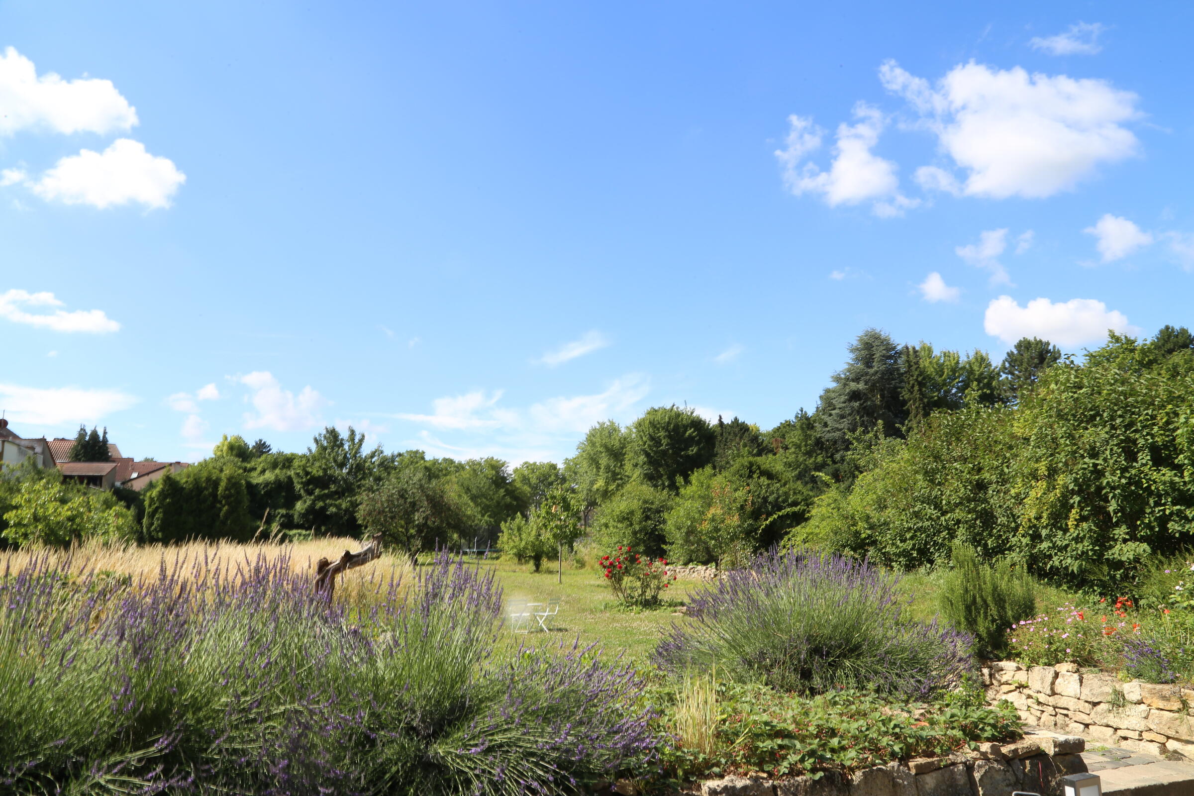 Der große, mediterrane Innenhof mit in Segmentbögen verlegtem Kopfsteinpflaster ist von urigen Bruchsteinmauern eingefasst und bietet zusammen mit der Bepflanzung und der geschmackvollen Möblierung eine hohe Aufenthaltsqualität. Im baulich geschützten Naturgarten gibt es viele alte Obstbäume, Blumenwiesen sowie Rasenflächen. Er ist im Naherholungsgebiet "In der Au" gelegen, durch das auch der Aubach fließt und an dem keine Straßen entlangführen. Die Außenanlagen sind für Film- und Fotoaufnahmen nutzbar.