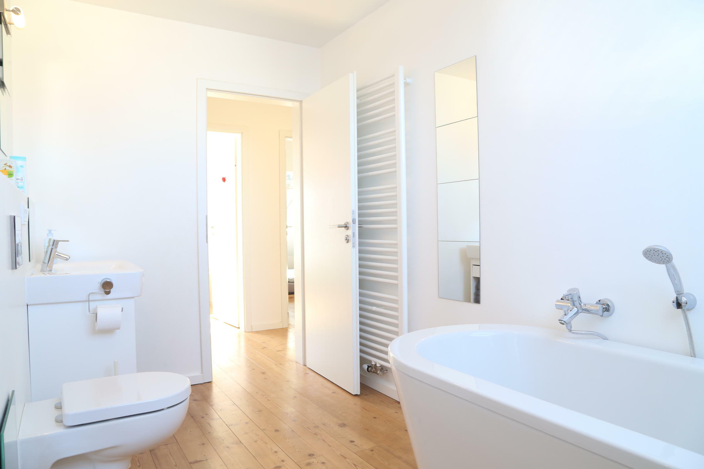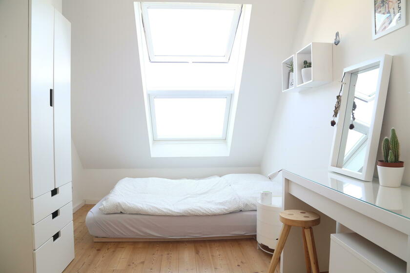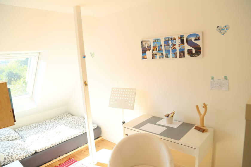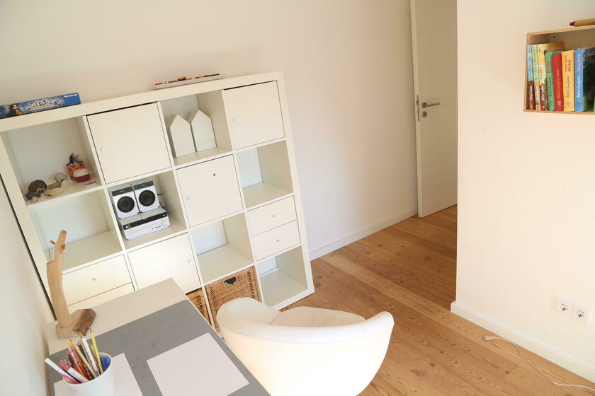 Im "Familienhaus" stehen rund 100 m² Wohnfläche auf zwei Etagen zur Verfügung, hierzu zählt ein Seitenflügel (Westausrichtung) mit Schlafzimmern für Kindergartenkinder sowie Erwachsene. Ein großer Wohn- und Essbereich mit integrierter Wohnküche liegt im Erdgeschoss, vier weitere Kinder- und Jugendzimmer sowie ein modernes Bad mit Wanne findet sich im 1. Obergeschoss des Landhauses. Die Ausstattung der Räume besteht aus geölten Natur-Holzdielenböden und einer stilvollen hellen Möblierung, darunter auch hochwertige Designklassiker wie Arne-Jacobsen-Stühle und Tolomäo-Lampen.