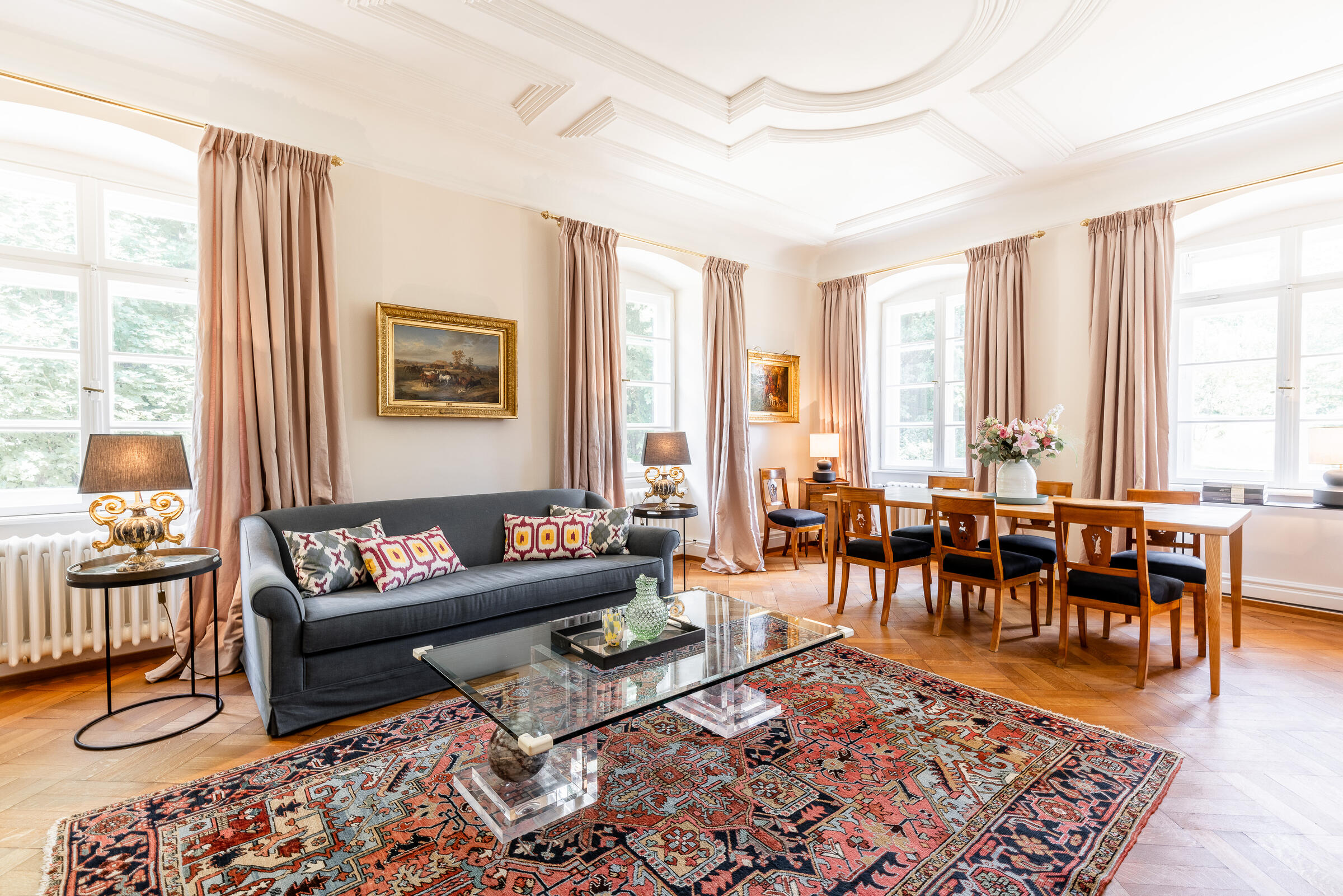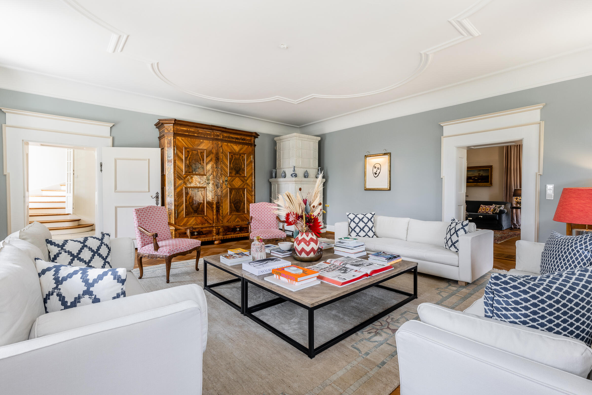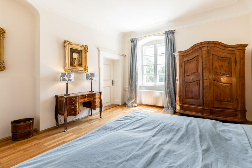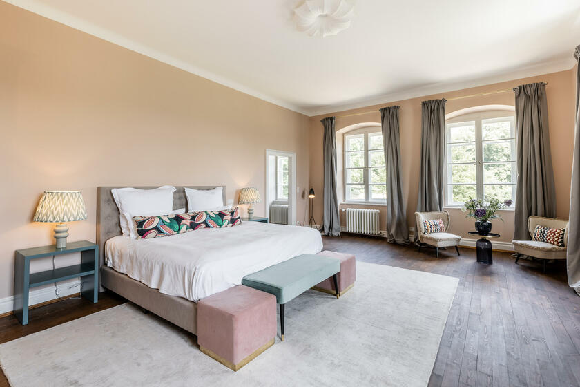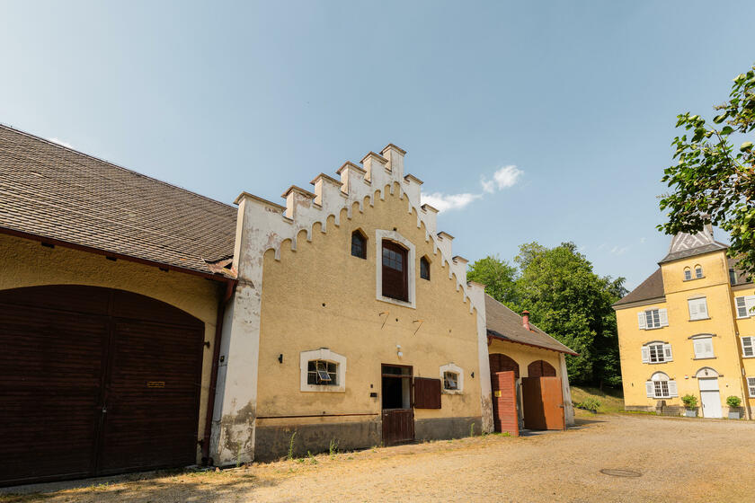 Das Barockschloss wurde im Jahr 1752 als dreigeschossiger Walmdachbau mit acht zu drei Achsen und einem Turm in der Westfassade erbaut. Das Schloss ist von einem 8 ha großem Wald und einem Englischen Park aus dem 19. Jahrhundert umgeben. In die Räume fällt natürliches Sonnenlicht. Die Fenster können mit vorhandenen Vorhängen abgedunkelt werden. Die Räume haben bis zu 3 m hohe Decken und die Böden bestehen aus Holz- und Steinverlegungen. Es sind ebenfalls Räume für Teamaufenthalt, Maske und Garderobe vorhanden. Es sind 8 Parkplätze und eine große Einfahrt vorhanden. Energieabrechnung erfolgt bei Produktionen nach genauem Stromzählerstand.