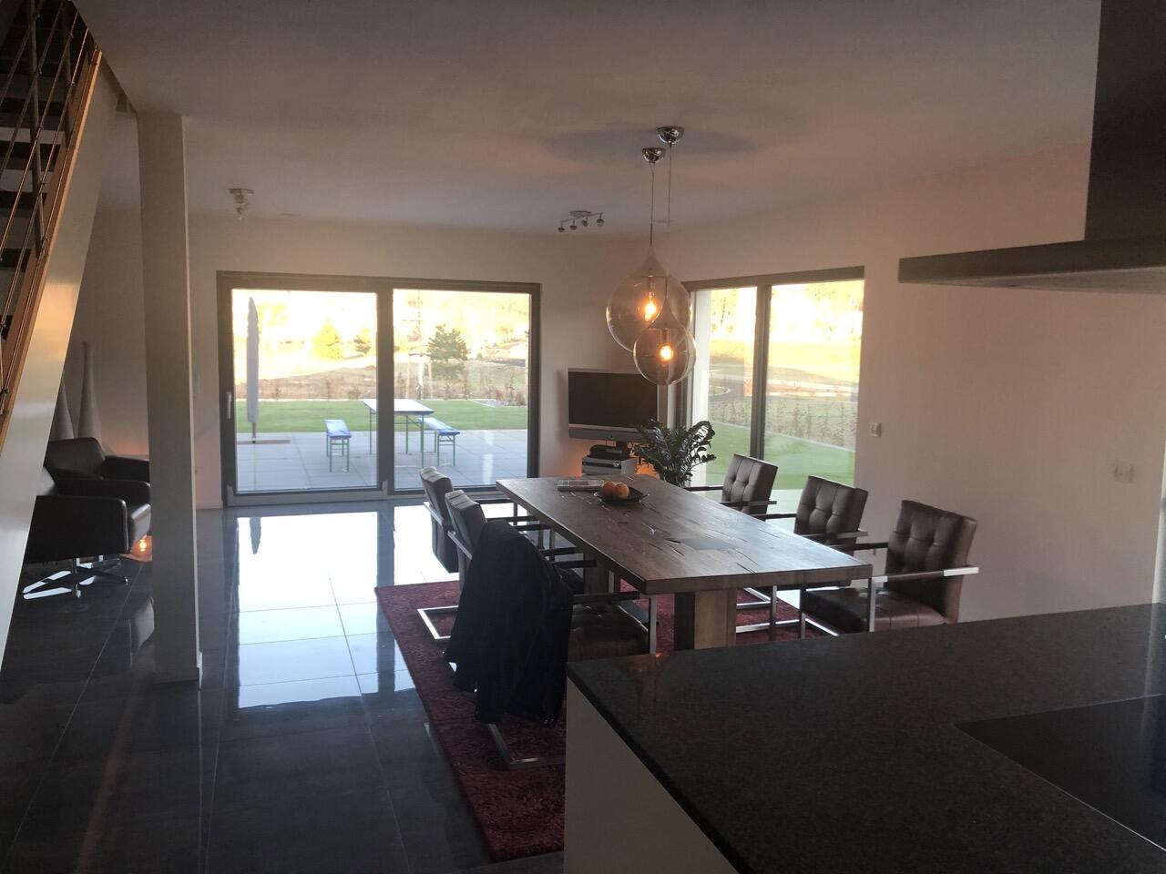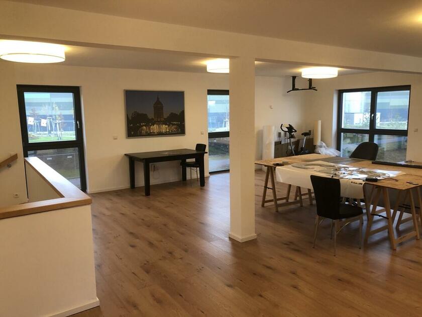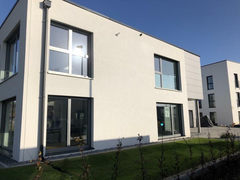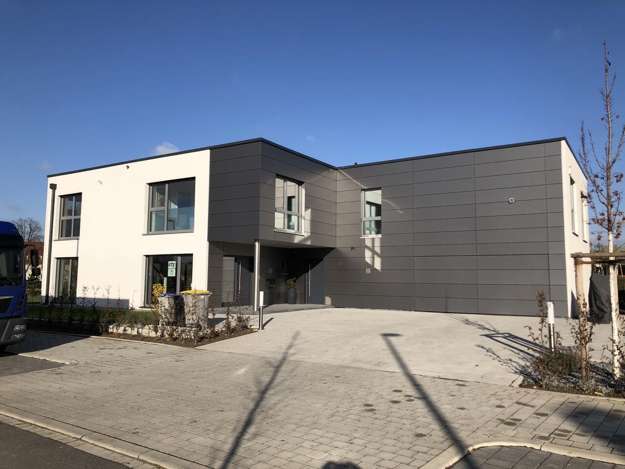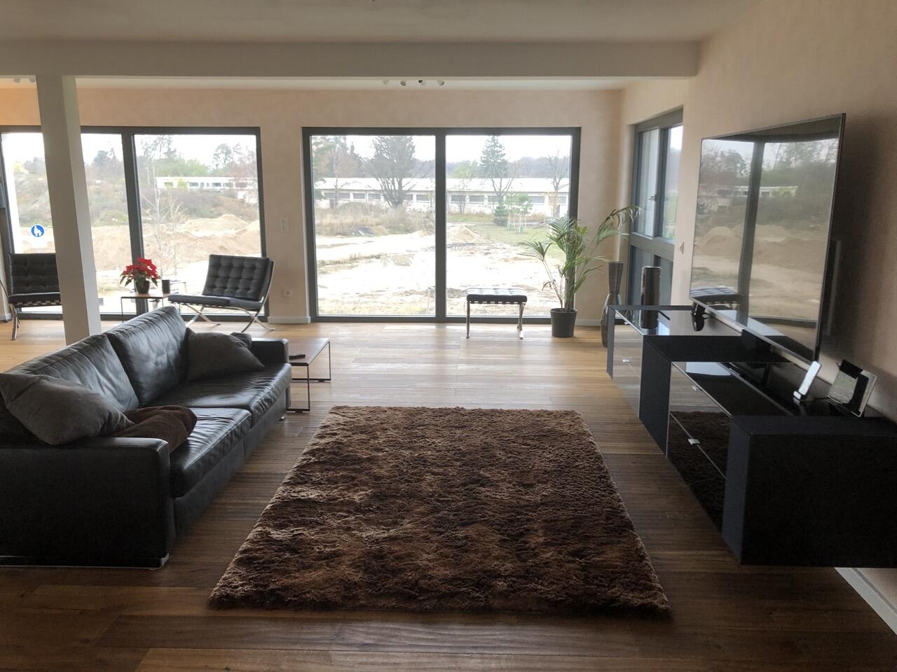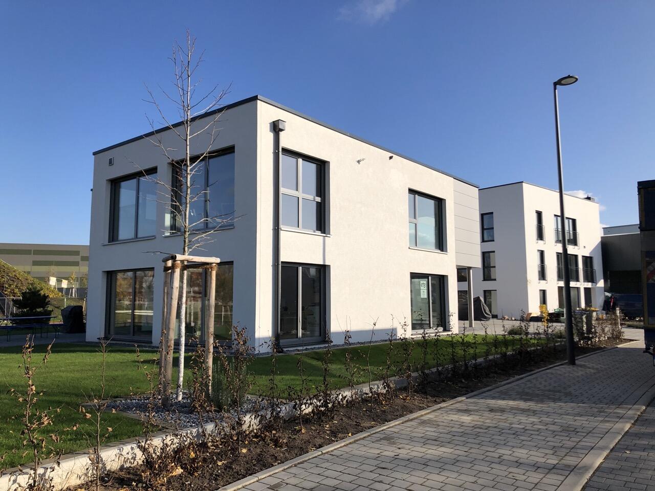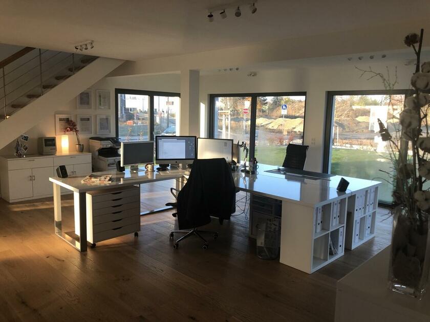 Das Haus wurde im Jahr 2017 auf dem Gelände einer ehemaligen US-Kaserne gebaut. Der Baustil ist zeitlos und vom Bauhaus inspiriert. Ein besonderer Blickfang ist der Eingangsbereich, der mit dunkelgrauen Trespa-Platten verkleidet wurde. Das Garagentor schließt bündig mit den Trespa-Platten der Hausfassade ab, so dass man das im geschlossenen Zustand nicht sieht. Die Räume sind großzügig geschnitten und offen gestaltet und wirken durch die warmen und freundliche Farben sehr wohnlich. Aufgrund der großen bodentiefen Fenster sind die Räume des Hauses lichtdurchflutet. Die Böden im Wohn- und Essbereich sowie in den Bädern sind gefliest. In den anderen Räumen wurde verschieden Parkettböden verlegt. Die Wände sind fast alle einfarbig tapeziert. An der Treppe wurden alte Bahnschwellen verbaut. Der Außenbereich des Hauses wurde großzügig angelegt. Das Gebäude mit 392 qm wir zu 2/3 geschäftlich und 1/3 privat genutzt (alle Bereiche stehen zur Verfügung).