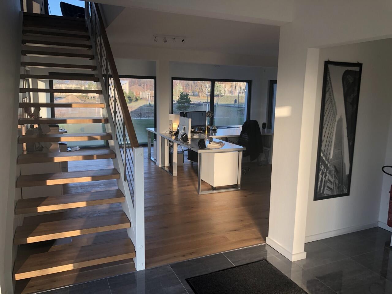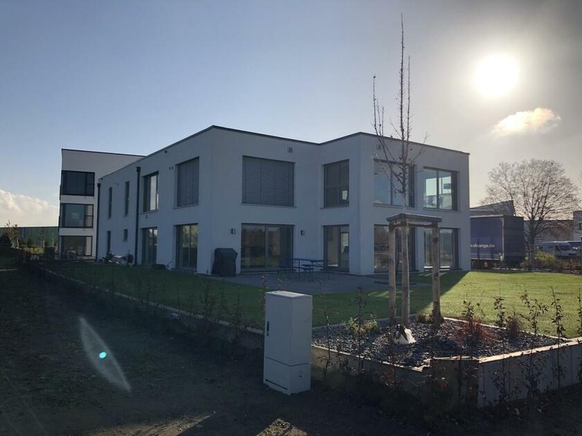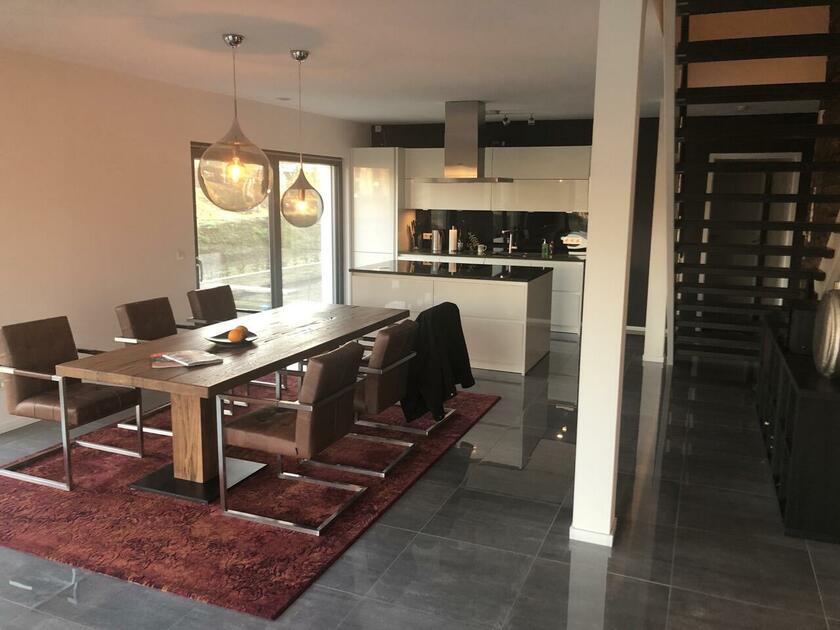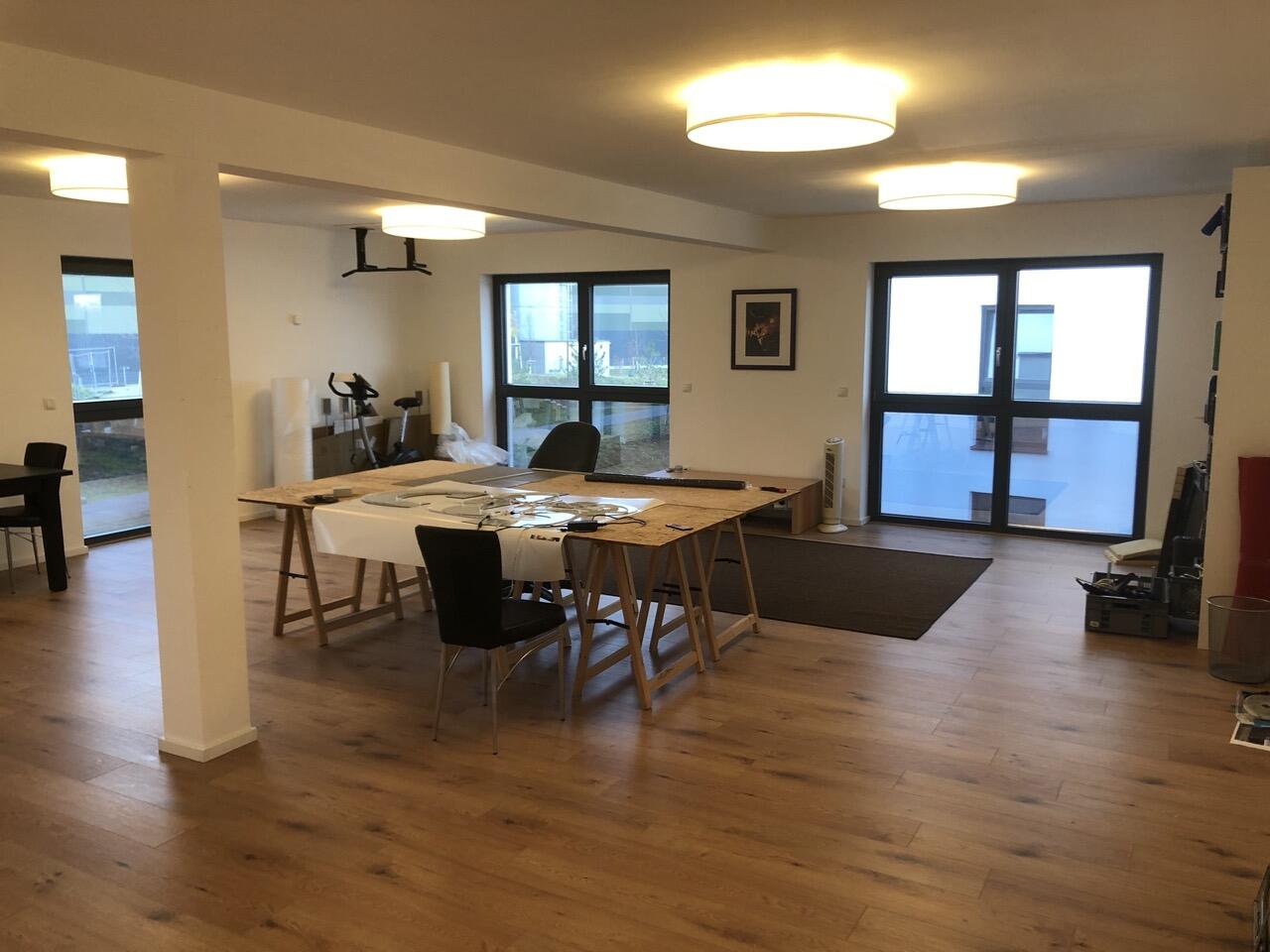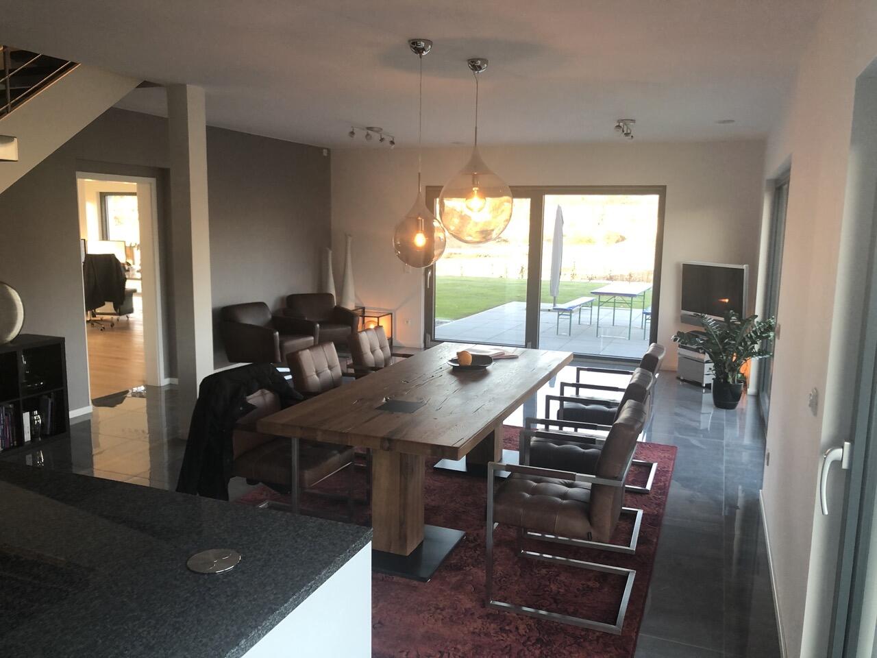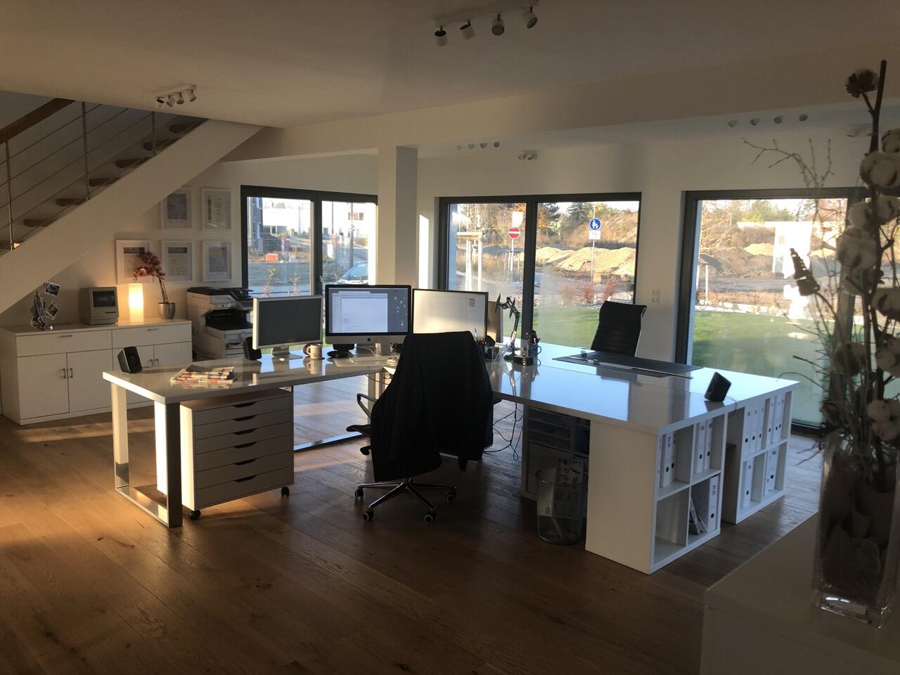 Das Haus wurde im Jahr 2017 auf dem Gelände einer ehemaligen US-Kaserne gebaut. Der Baustil ist zeitlos und vom Bauhaus inspiriert. Ein besonderer Blickfang ist der Eingangsbereich, der mit dunkelgrauen Trespa-Platten verkleidet wurde. Das Garagentor schließt bündig mit den Trespa-Platten der Hausfassade ab, so dass man das im geschlossenen Zustand nicht sieht. Die Räume sind großzügig geschnitten und offen gestaltet und wirken durch die warmen und freundliche Farben sehr wohnlich. Aufgrund der großen bodentiefen Fenster sind die Räume des Hauses lichtdurchflutet. Die Böden im Wohn- und Essbereich sowie in den Bädern sind gefliest. In den anderen Räumen wurde verschieden Parkettböden verlegt. Die Wände sind fast alle einfarbig tapeziert. An der Treppe wurden alte Bahnschwellen verbaut. Der Außenbereich des Hauses wurde großzügig angelegt. Das Gebäude mit 392 qm wir zu 2/3 geschäftlich und 1/3 privat genutzt (alle Bereiche stehen zur Verfügung).