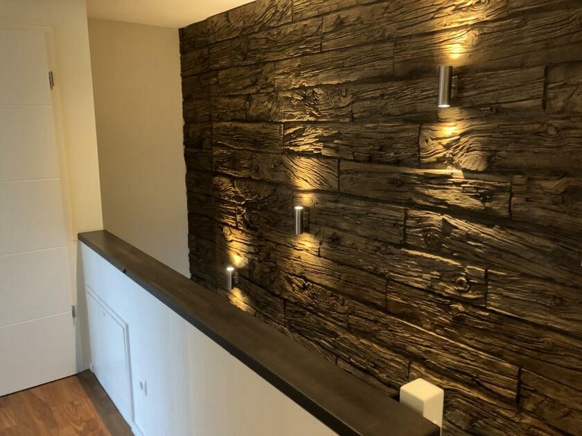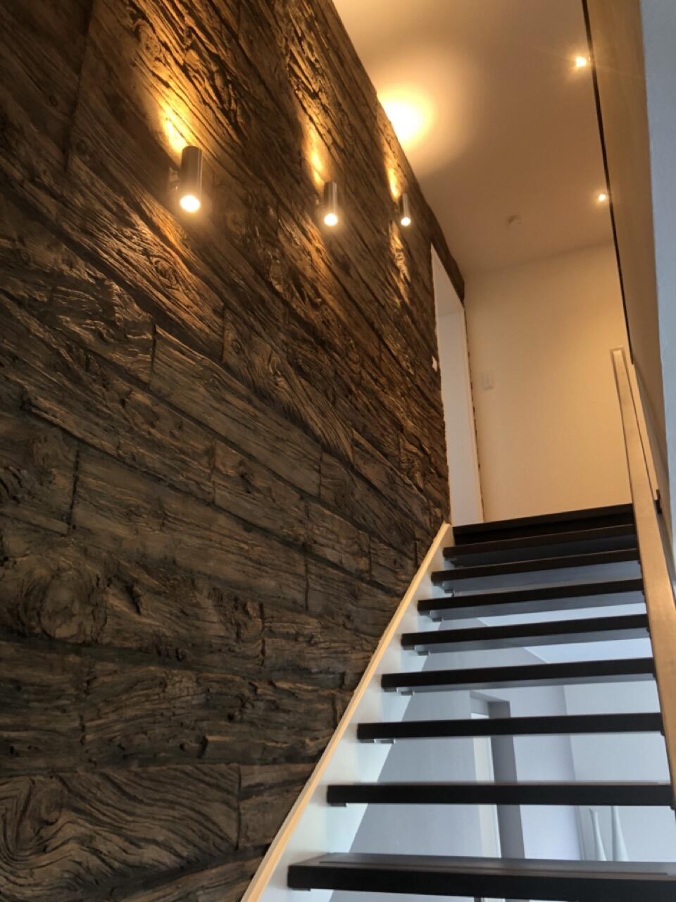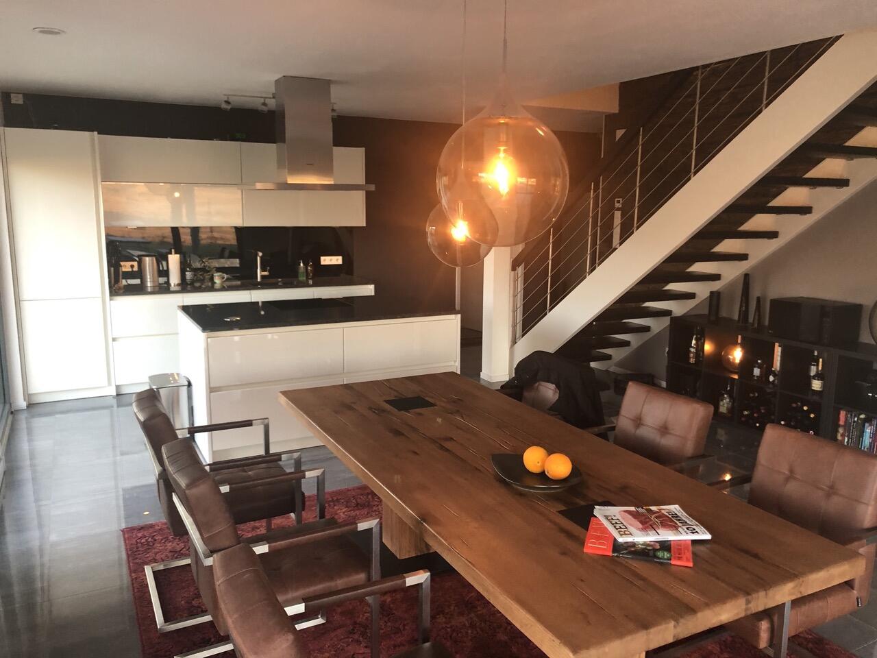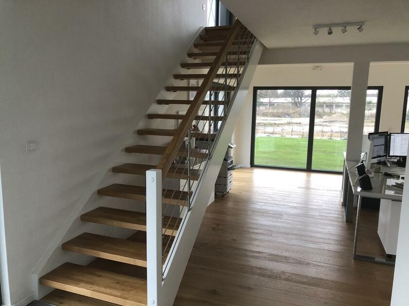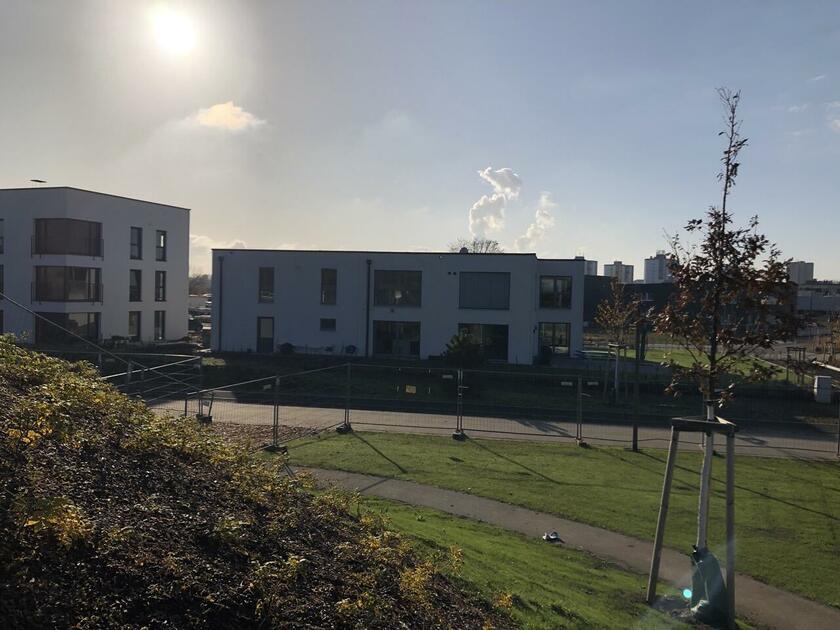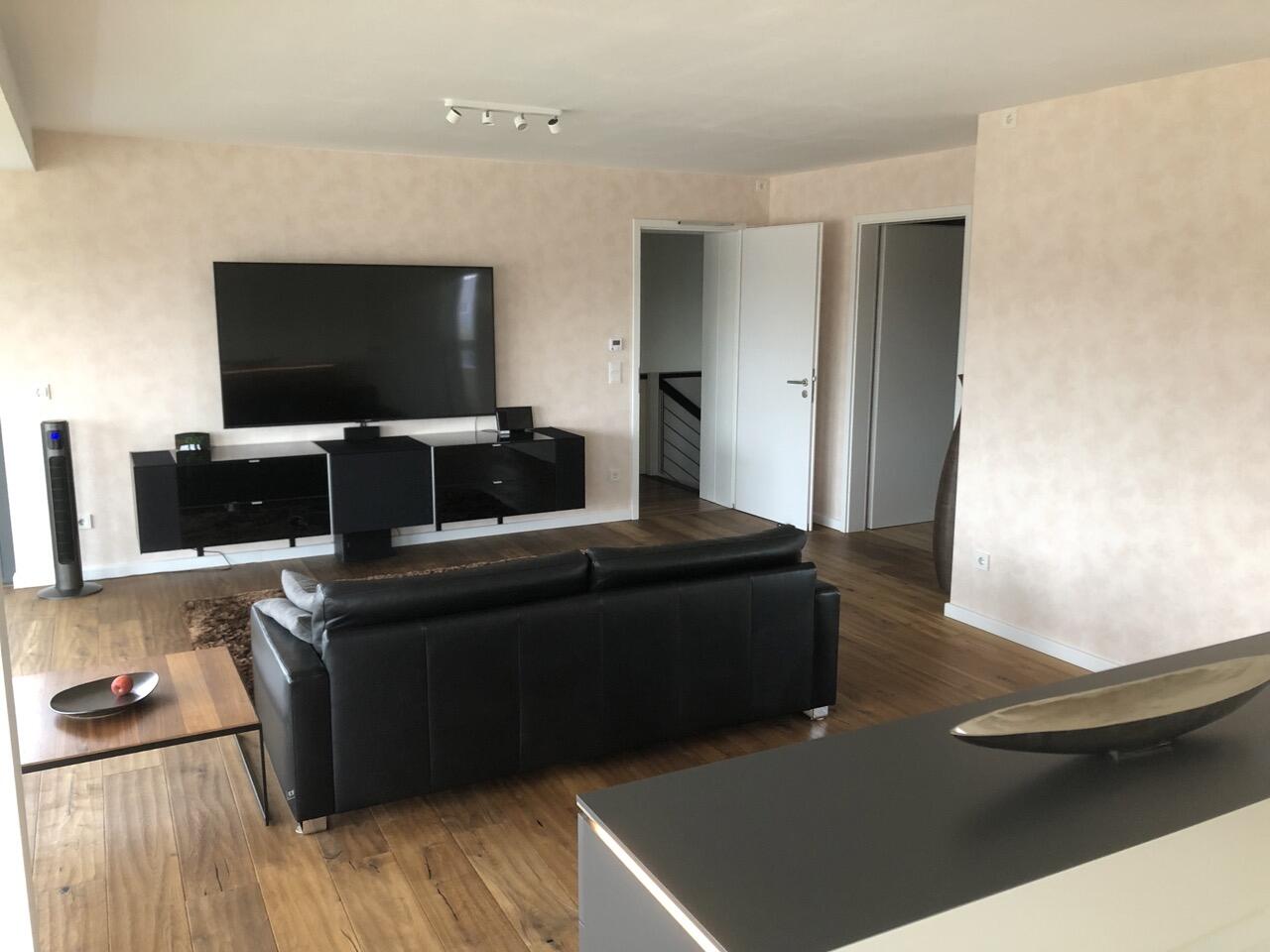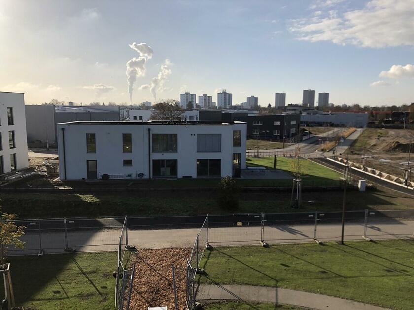 Das Haus wurde im Jahr 2017 auf dem Gelände einer ehemaligen US-Kaserne gebaut. Der Baustil ist zeitlos und vom Bauhaus inspiriert. Ein besonderer Blickfang ist der Eingangsbereich, der mit dunkelgrauen Trespa-Platten verkleidet wurde. Das Garagentor schließt bündig mit den Trespa-Platten der Hausfassade ab, so dass man das im geschlossenen Zustand nicht sieht. Die Räume sind großzügig geschnitten und offen gestaltet und wirken durch die warmen und freundliche Farben sehr wohnlich. Aufgrund der großen bodentiefen Fenster sind die Räume des Hauses lichtdurchflutet. Die Böden im Wohn- und Essbereich sowie in den Bädern sind gefliest. In den anderen Räumen wurde verschieden Parkettböden verlegt. Die Wände sind fast alle einfarbig tapeziert. An der Treppe wurden alte Bahnschwellen verbaut. Der Außenbereich des Hauses wurde großzügig angelegt. Das Gebäude mit 392 qm wir zu 2/3 geschäftlich und 1/3 privat genutzt (alle Bereiche stehen zur Verfügung).
