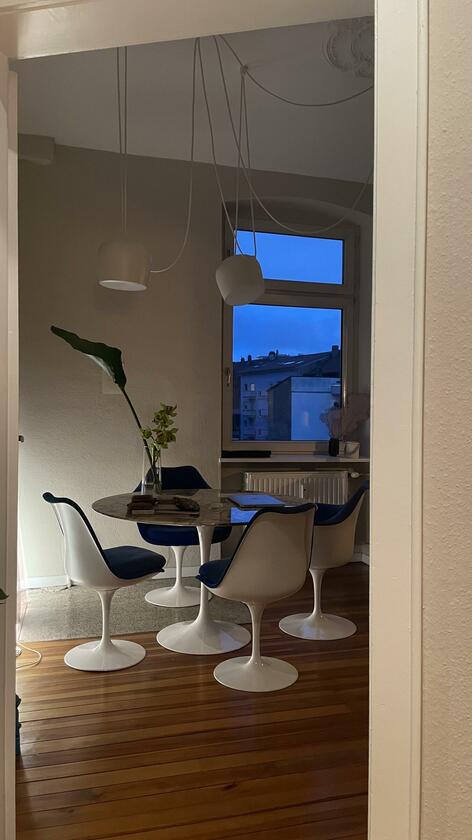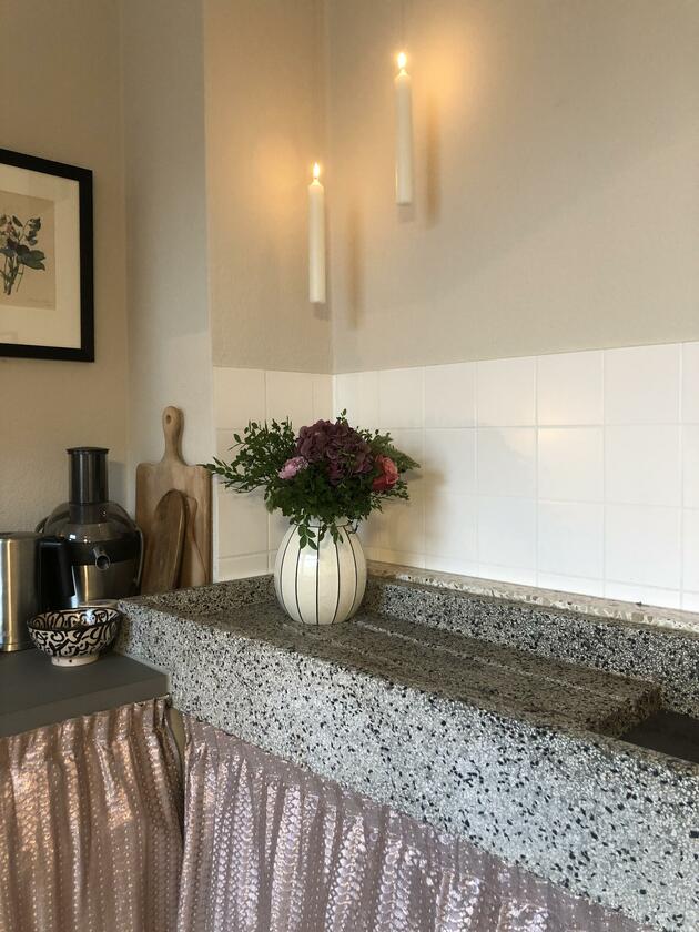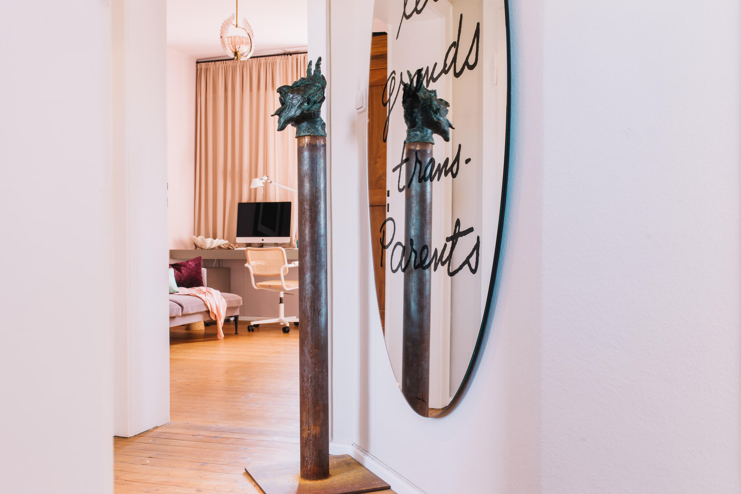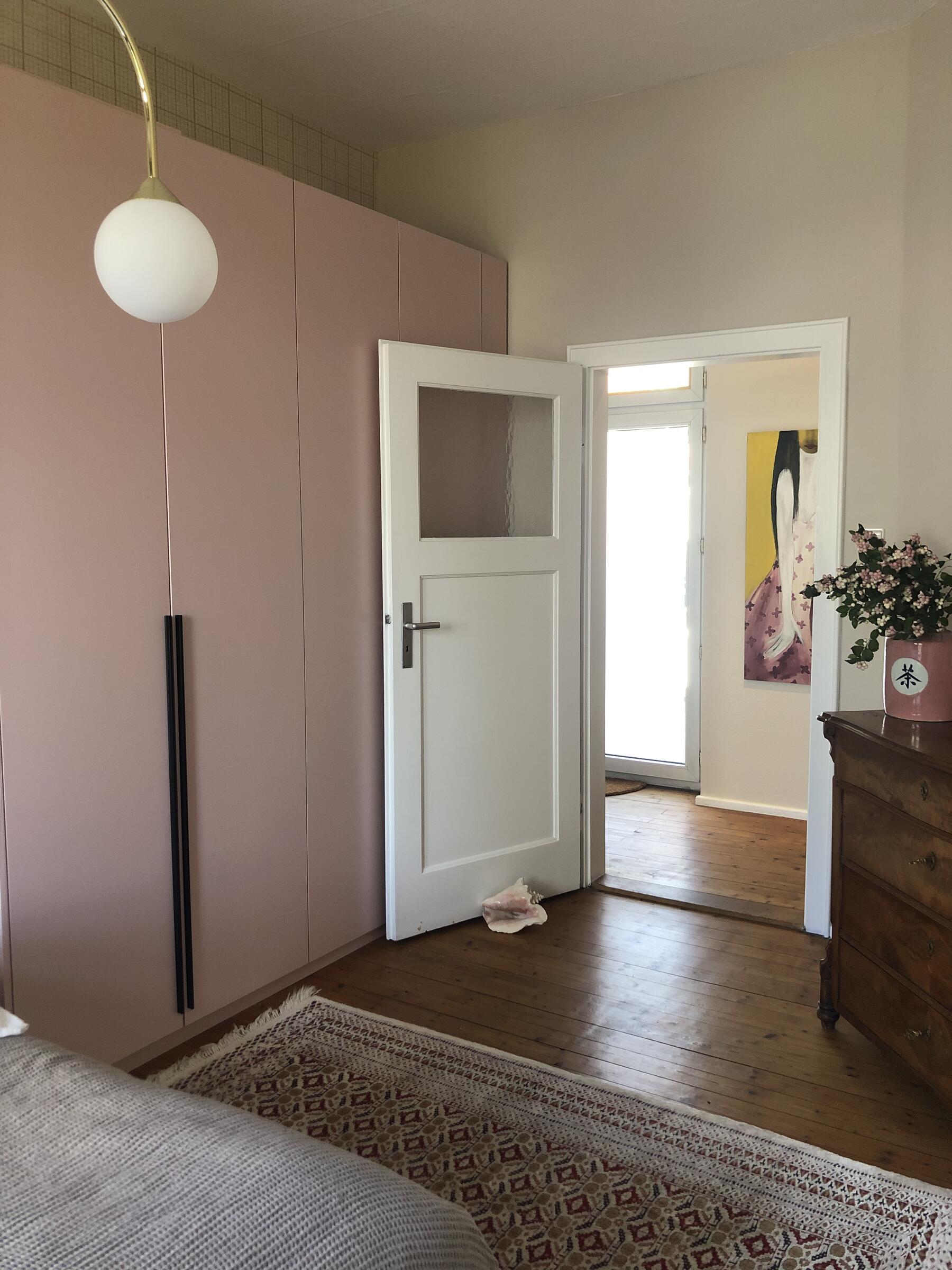 Die gut geschnittene Altbauwohnung liegt in einem Wohn- und Geschäftshaus. Hohe Decken und Parkettböden geben den Räumen einen unverwechselbaren Charme. Die Wohnung befindet sich im 3. Stock. In der Wohnküche befindet sich ein altes Terrazzo Waschbecken. Auf dem Boden sind vereinzelt Terrazzo Bereiche. Im Wohnzimmer ist über die gesamte Breite ein Schreibtisch schwebend installiert. Das Wohnzimmer ist komplett in einem Altrosa gestrichen. Die Rückwand des Schlafzimmers ist mit einer Art Déco Tapete bespielt. Vom Schlafzimmer aus gelangt man auf einen kleinen Sandsteinbalkon mit Blick auf eine Kirche. Das WC ist separat weiß gefliest, oberhalb sind die Wände und Decke in Anthrazit gestrichen. Es gibt noch ein Badezimmer mit Dusche und Waschbecken.
