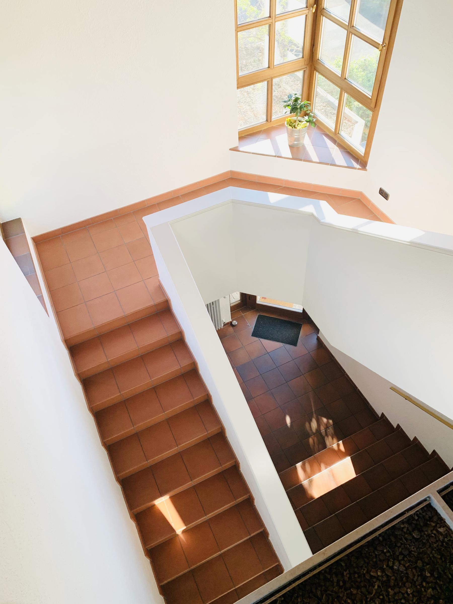 Über eine breite offene Treppe gelangen Sie in das Obergeschoss. Dieses besteht aus einem hellen Galeriebereich mit Zugang zur ca. 60 m² großen sonnigen Dachterrasse. Im privaten Wohnbereich des Obergeschosses befindet sich ein Ankleidezimmer, zwei Schlafzimmer sowie ein großräumiges Badezimmer. Im ausgebauten Untergeschoss der Immobilie befindet sich ein großer Fitnessraum mit Sauna und Dusche sowie ein separates WC, ein Technikraum, ein Gewölbekeller und die gemeinsame Waschküche. Eine Einzelgarage ist direkt mit dem Haus verbunden und von der Hauptwohnung zugänglich, darüber hinaus befinden sich in der Einfahrt zwei weitere Stellplätze. Das Haus ist nicht möbliert und bietet Ihnen dadurch eine Vielzahl von Gestaltungsmöglichkeiten.