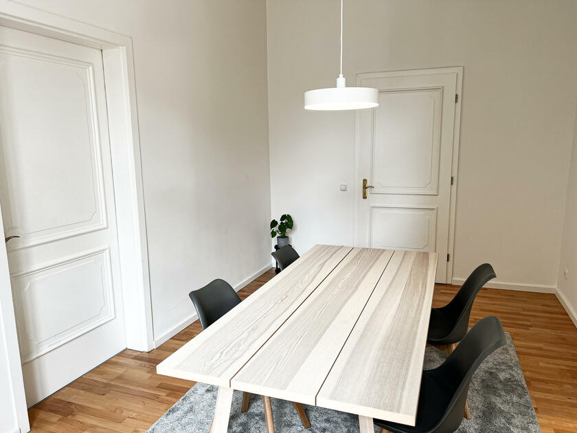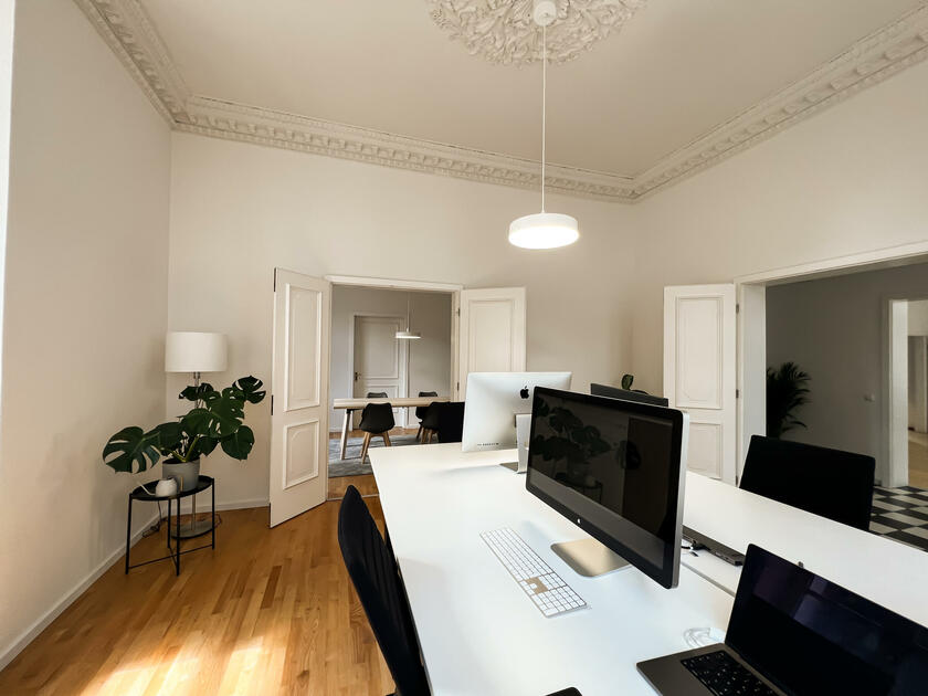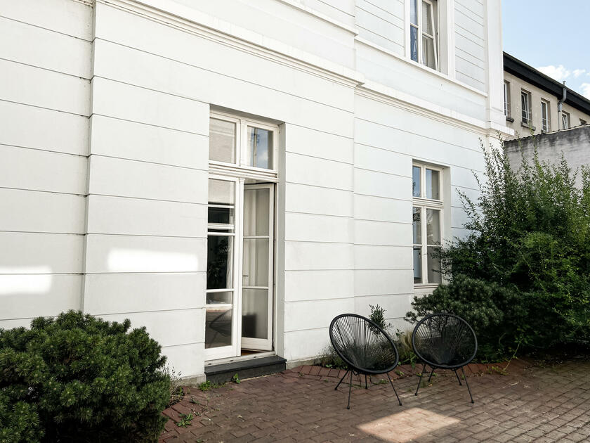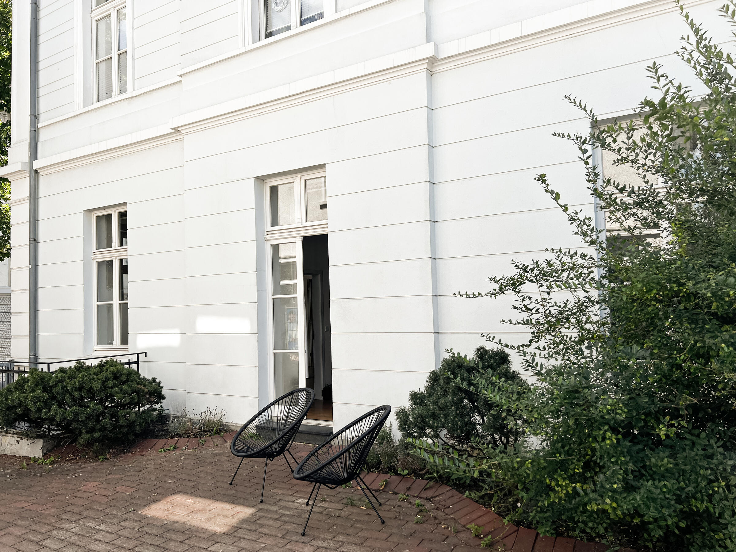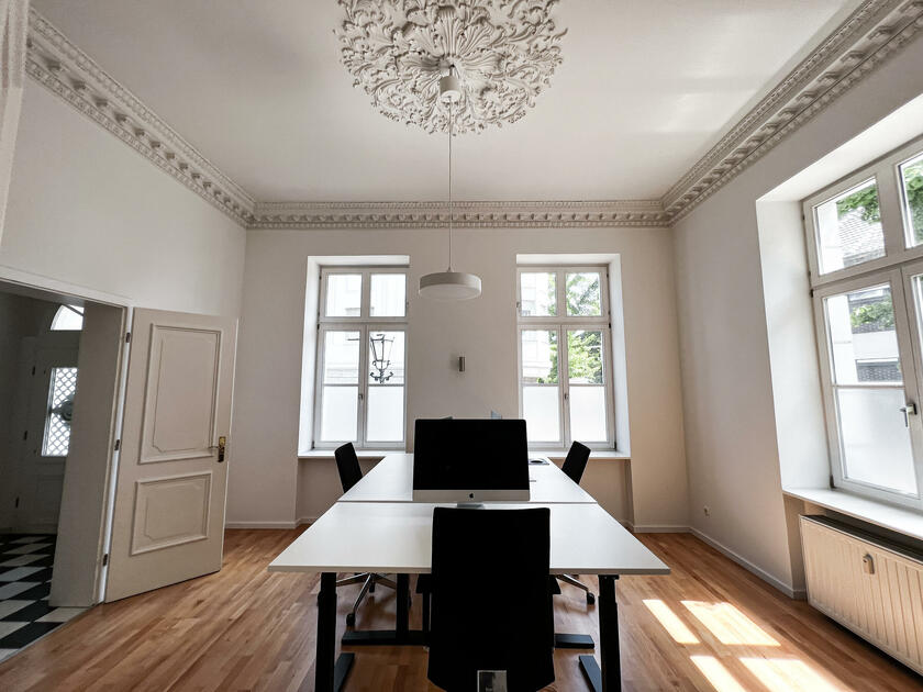 Die Büros befinden sich im Erdgeschoss eines denkmalgeschützten Hauses in Mönchengladbach-Wickrath. Unsere Räumlichkeiten verfügen über einen eigenen Eingang mit einem großen Flur. Hingucker sind die hohen Decken mit dem wundervollen Stuck. Insgesamt stehen 4 Räume zur Verfügung und ein großer Abstellraum. Des Weiteren gibt es 2 Toiletten und eine kleine Küche. Außerdem gehört zu den Räumlichkeiten noch eine kleine Terrasse. Natürlich können alle Möbel umgestellt oder kurzfristig entfernt werden. Hinter dem Haus befinden sich 2 eigene Parkplätze. Weitere Parkplätze befinden sich ca. 50 m entfernt vom Gebäude am Wickrather Bahnhof. Trotz der nahen Lage zu dem Bahnhof ist es hier sehr ruhig, da dort nur selten Züge fahren.