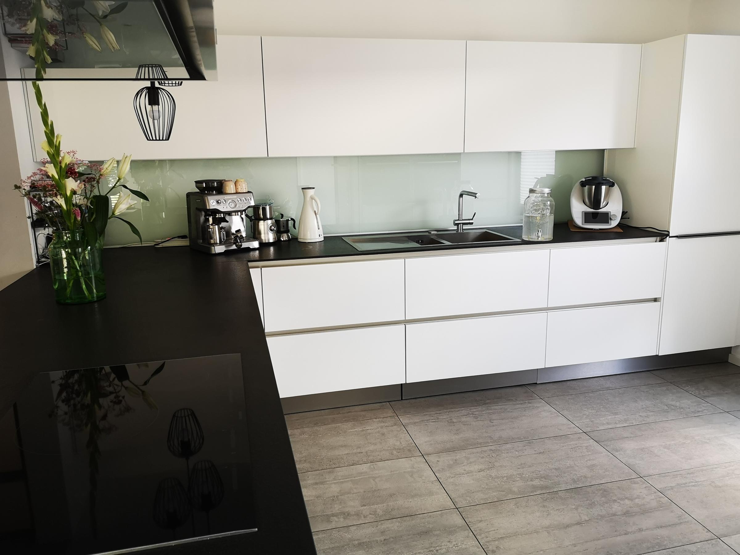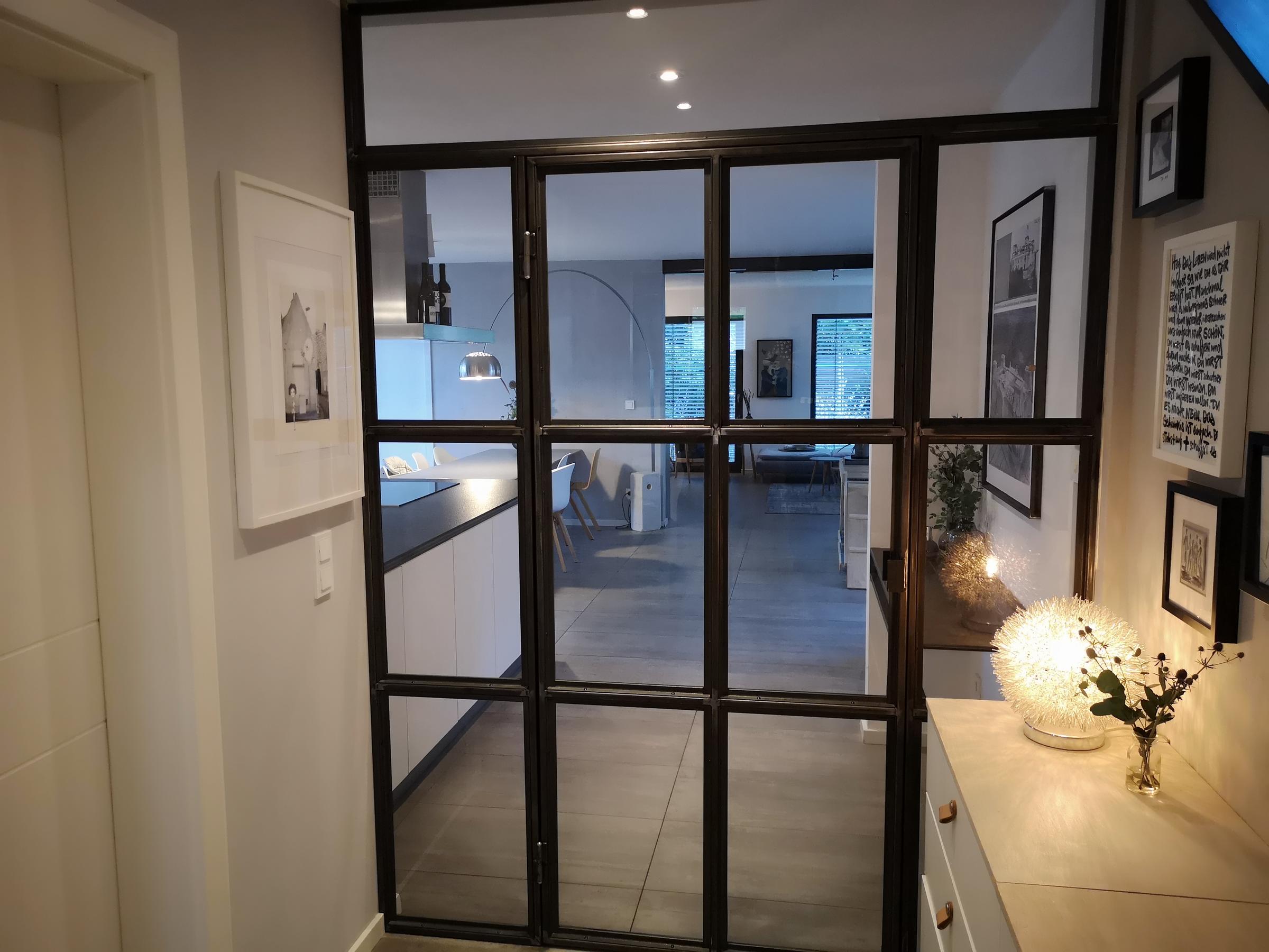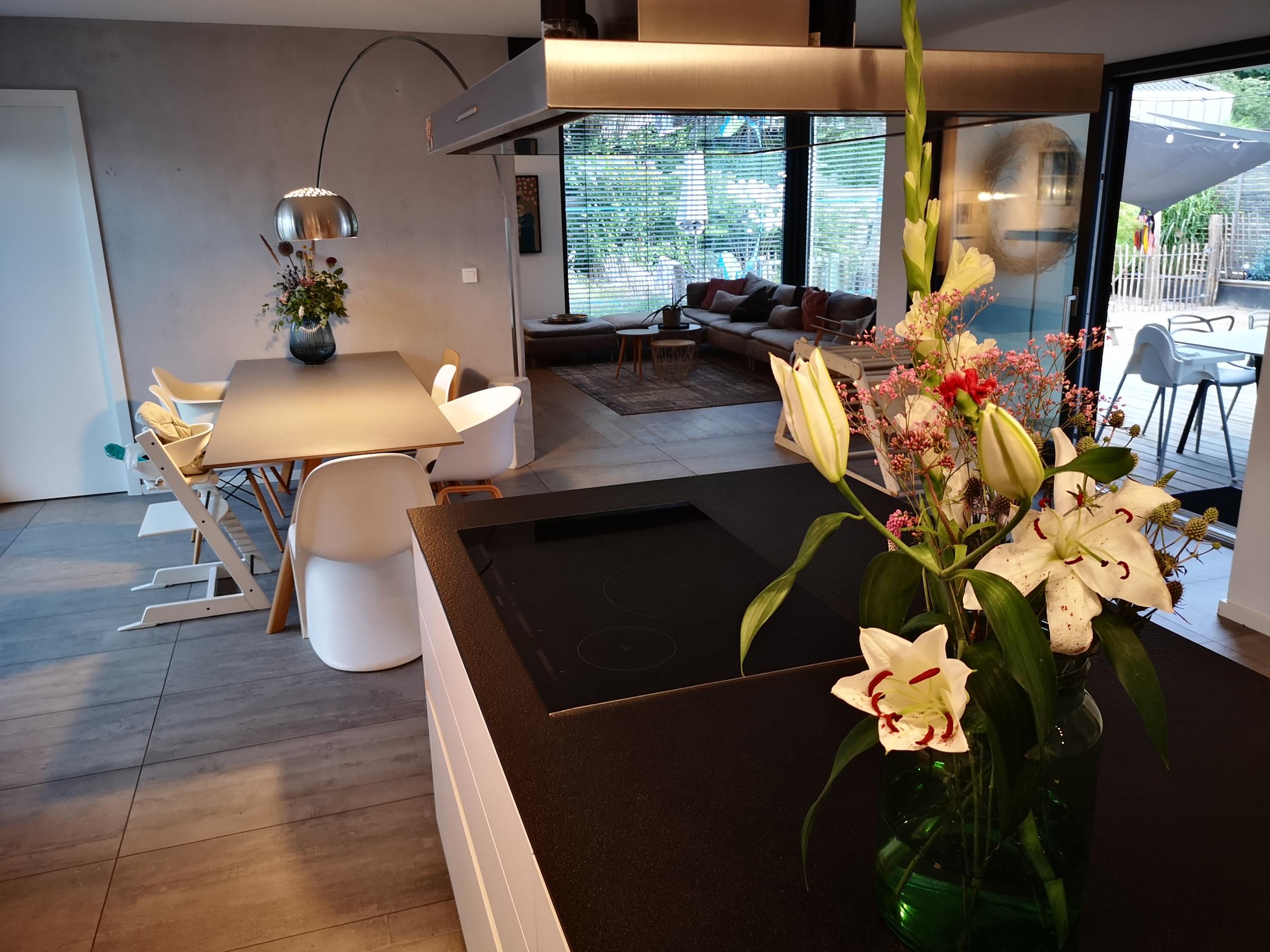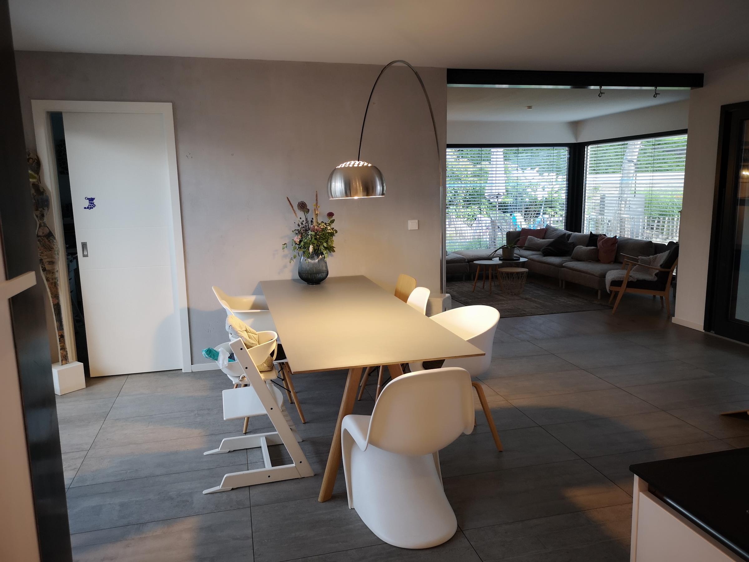Unser Einfamilienhaus befindet sich in einer ruhigen und gehobenen Umgebung. Die Immobilie mit modernem Charme, besitzt einen kleinen Garten mit großer Terrasse und Schwimmteich, der sich perfekt einfügt. Auf der Terrasse befindet sich eine große Loungeecke sowie ein Essbereich. Das Erdgeschoss ist offen gehalten und verfügt über viel Licht und eine große, offene SieMatic Küche. Bei Bedarf kann der Milchglasspritzschutz farblich beleuchtet werden.
