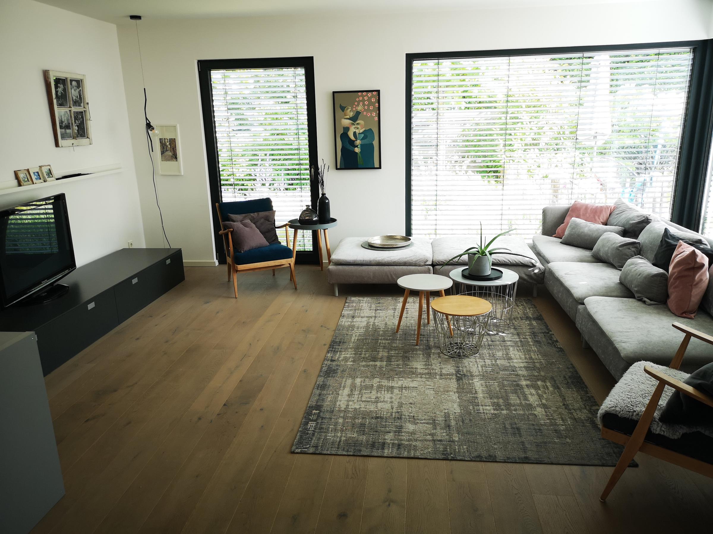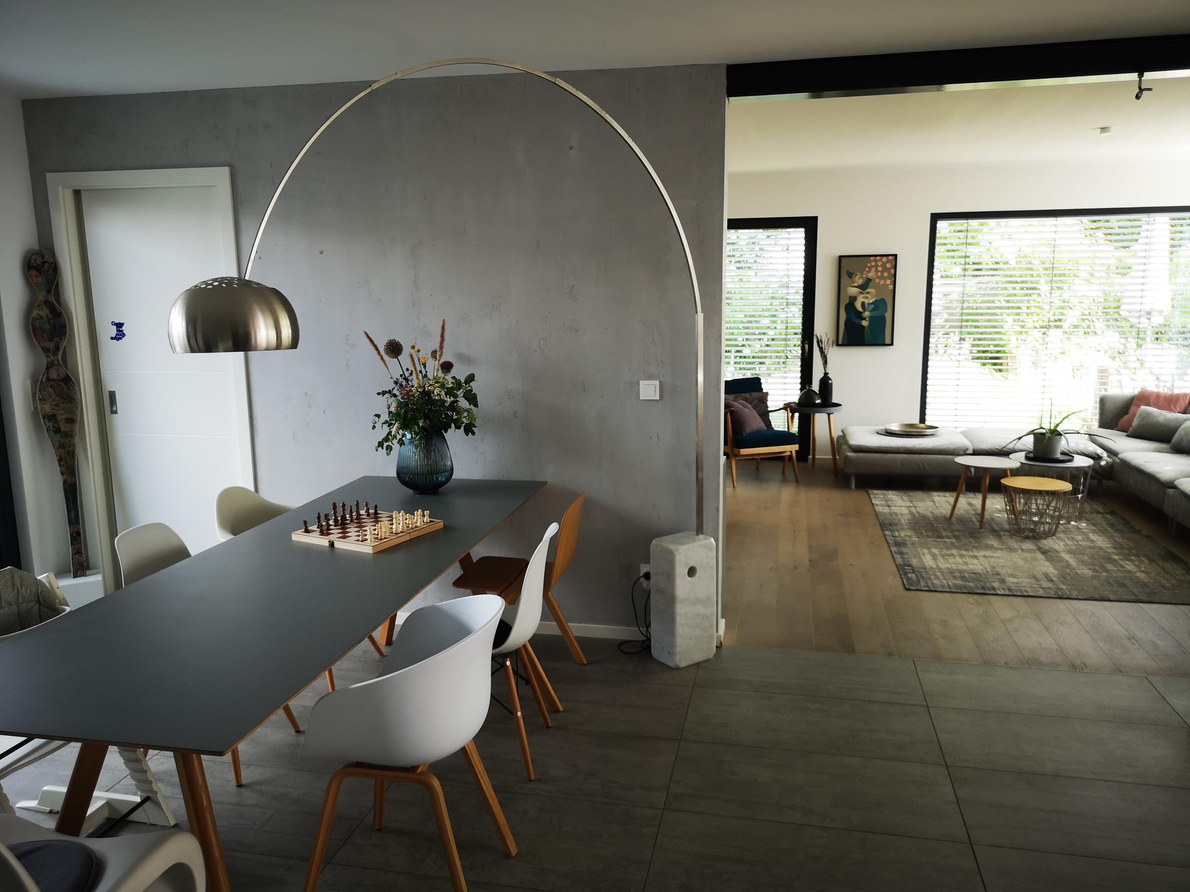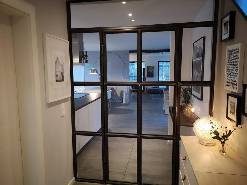 Der Eingangsbereich ist durch eine Stahl-Glas-Konstruktion vom Wohnbereich getrennt. Wohn- und Essraum sind ebenfalls offen, aber durch verschiedene Bodenbeläge erkennbar. Im Ess- und Küchenbereich sind matt-graue Betonfliesen verlegt, im angrenzenden Wohnzimmer, sowie im Arbeitszimmer liegen geweißte Dielen. Alle Räume bieten einen Blick in die verschiedenen Bereiche des Gartens.