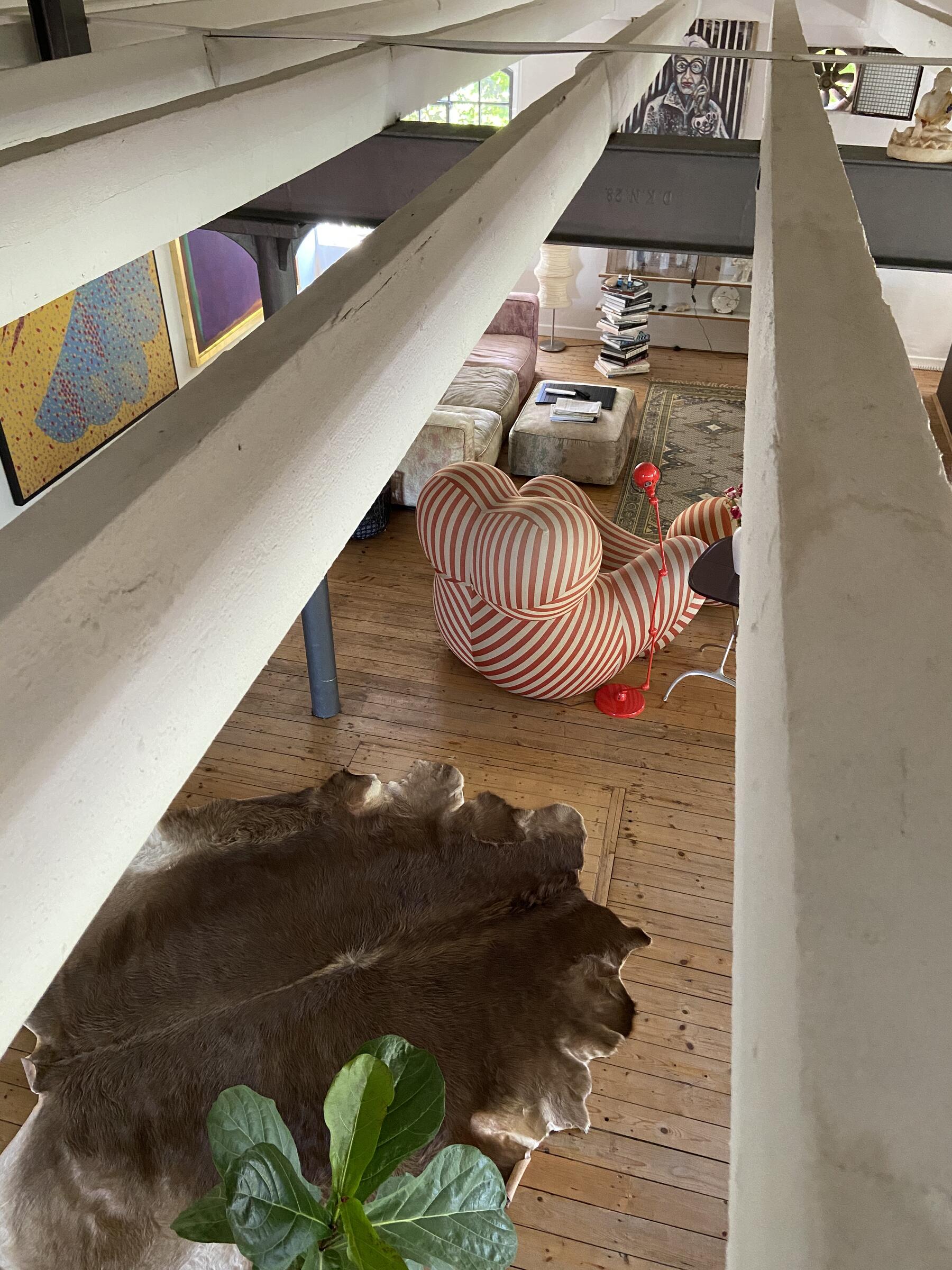 Das Loft befindet sich in einer historischen, denkmalgeschützten ehemaligen Seidenweberei aus dem Jahr 1860. Es besitzt große einfach verglaste Eisensprossenfenster, die dem Loft seinen ganz besonderen Flair eines antiken Industriegebäudes verleihen. Im Innenbereich tragen Zwei Eisensäulen und eine gemauerte Säule zum Flair eines industriell Looks bei. Der naturbelassene Dielenboden hat seinen eigenen Charm und lebt durch die "Gebrauchsspuren" vieler Jahrzehnte. Die Wände sind weiß gestrichen und mit etlichen großen Kunstwerken bestückt. Die Bildergalerie ist ausschließlich mit Aktgemälden und diversen Kunstobjekten dekoriert. Die Holzdecke ist weiß gestrichen. Es befindet sich ein dänischer Holzofen im Raum. An der 3. Eisensäule führt eine Wendeltreppe auf die Dachterrasse.