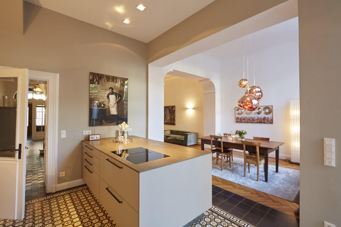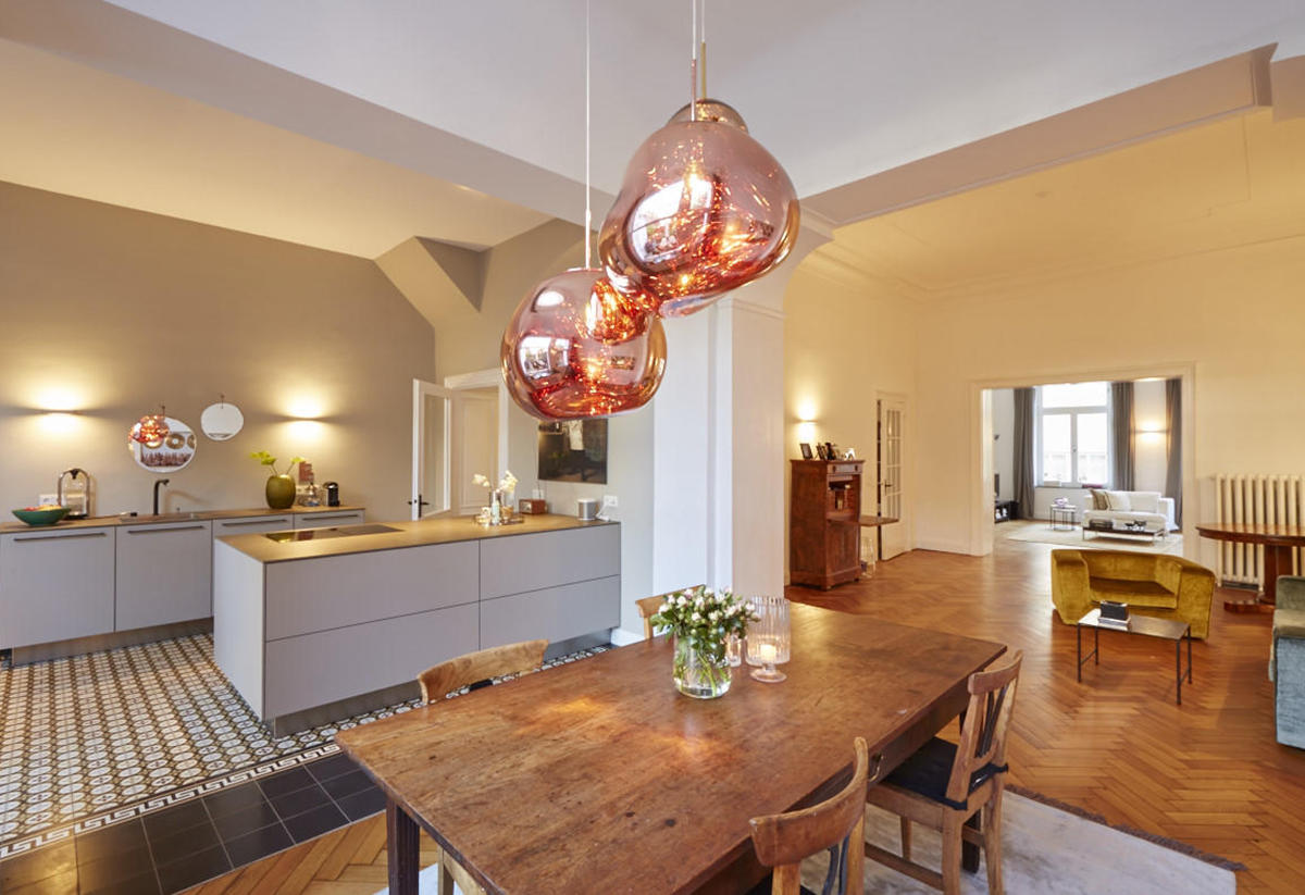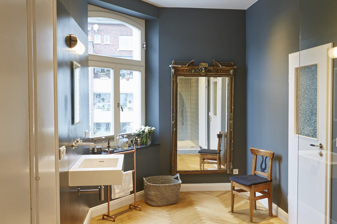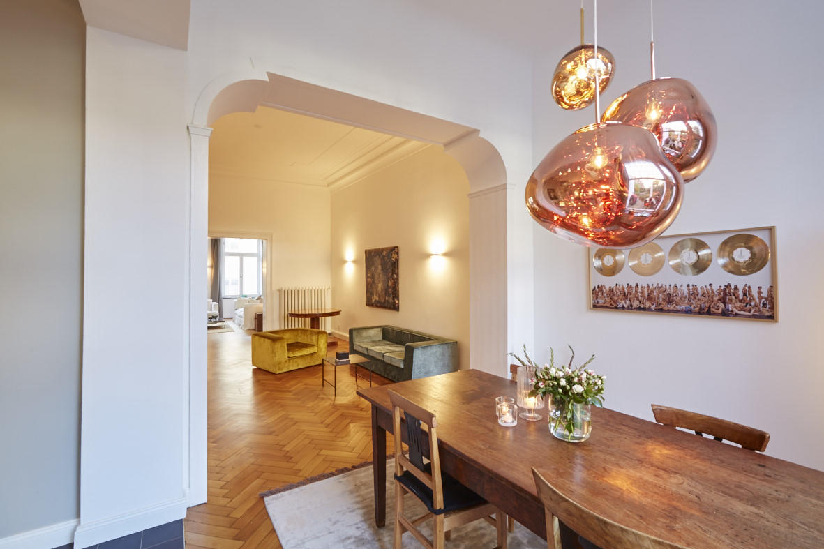 Das Gründerzeithaus verfügt über 4 m hohe Decken im Erdgeschoss und im 1. OG. Die untere Etage erstreckt sich in einer Fläche von 18 m Länge und 5 m Breite über drei miteinander verbundene offene Räume. Daran schließt sich L-förmig zusätzlich die offene Küche mit weiteren 35 m³. D.h. im EG stehen 125 m³ durchgehende Fläche mit 4 m Deckenhöhe zur Verfügung. Ideale Bedingungen, um Motive aus Entfernung oder von oben aufzunehmen oder zu filmen. Die sehr präsenten Tom Dixon Lampen im Esszimmer können bei Bedarf höher oder ganz abgehängt werden. Die 11 m lange Eingangshalle wirkt sehr imposant, ebenso das Treppenhaus. Das Haus wurde von 2016-2017 aufwändig kernsaniert. In allen Räumen des Erdgeschosses und der 1. Etage liegt Fischgrätparkettboden, auch im großen der beiden Bäder.
