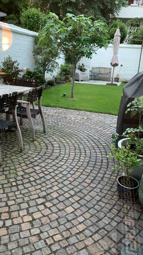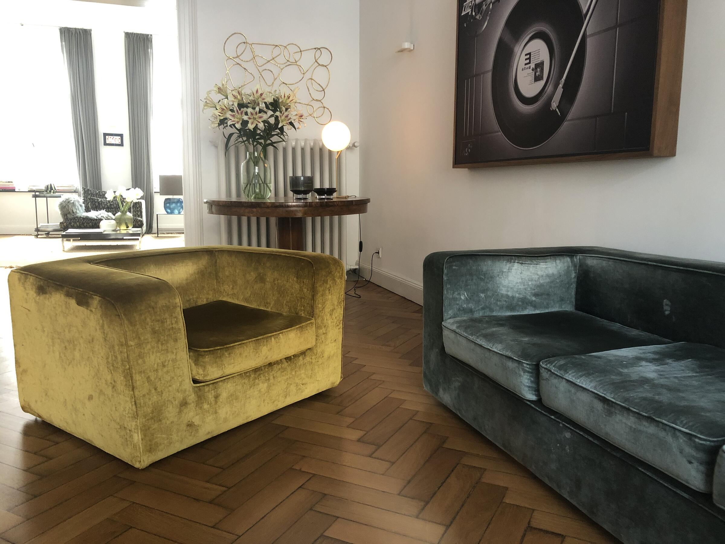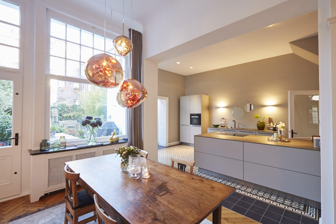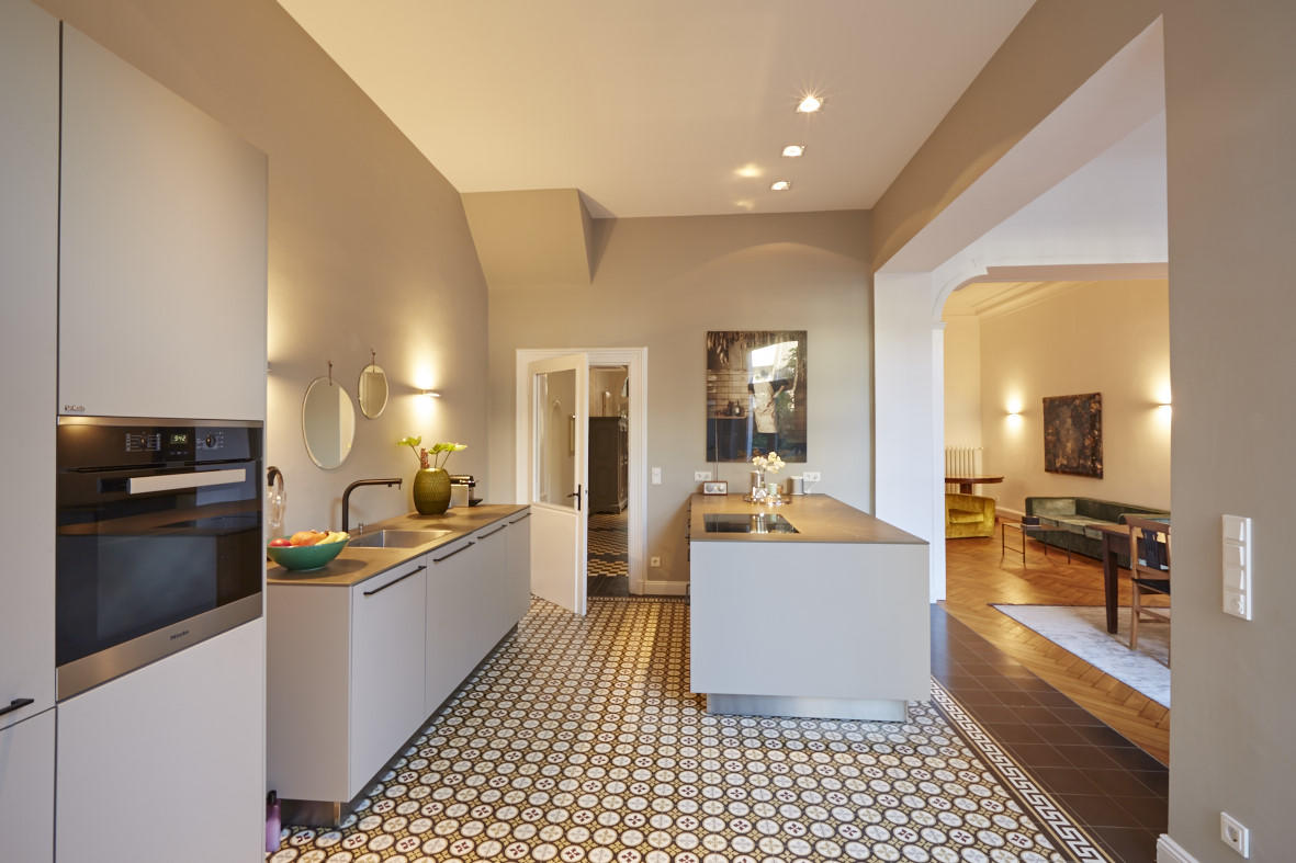 Das Gründerzeithaus verfügt über 4 m hohe Decken im Erdgeschoss und im 1. OG. Die untere Etage erstreckt sich in einer Fläche von 18 m Länge und 5 m Breite über drei miteinander verbundene offene Räume. Daran schließt sich L-förmig zusätzlich die offene Küche mit weiteren 35 m³. D.h. im EG stehen 125 m³ durchgehende Fläche mit 4 m Deckenhöhe zur Verfügung. Ideale Bedingungen, um Motive aus Entfernung oder von oben aufzunehmen oder zu filmen. Die sehr präsenten Tom Dixon Lampen im Esszimmer können bei Bedarf höher oder ganz abgehängt werden. Die 11 m lange Eingangshalle wirkt sehr imposant, ebenso das Treppenhaus. Das Haus wurde von 2016-2017 aufwändig kernsaniert. In allen Räumen des Erdgeschosses und der 1. Etage liegt Fischgrätparkettboden, auch im großen der beiden Bäder.